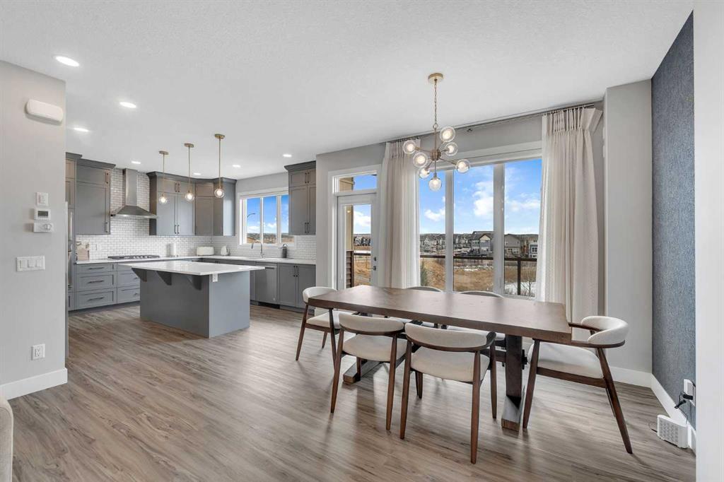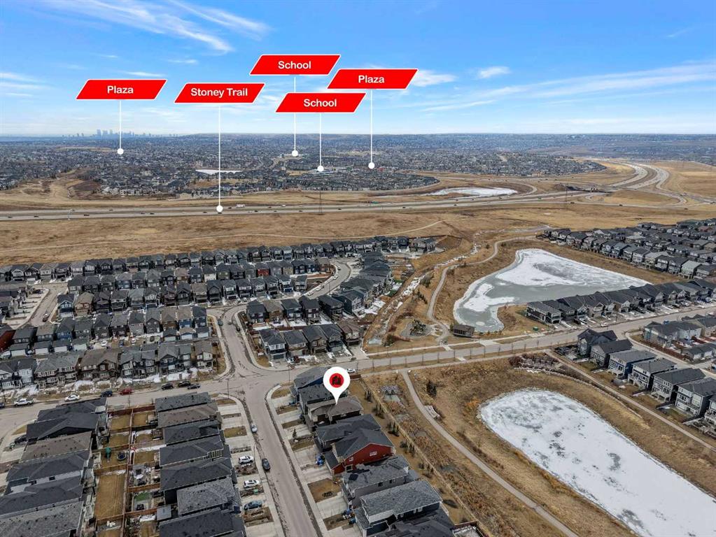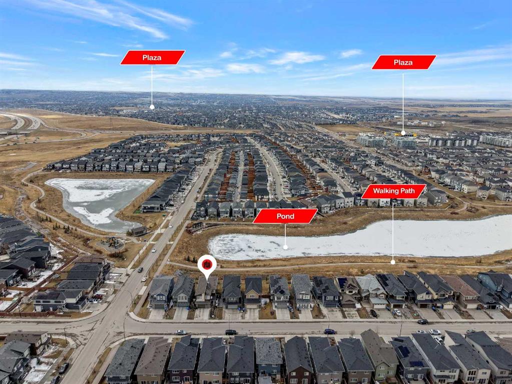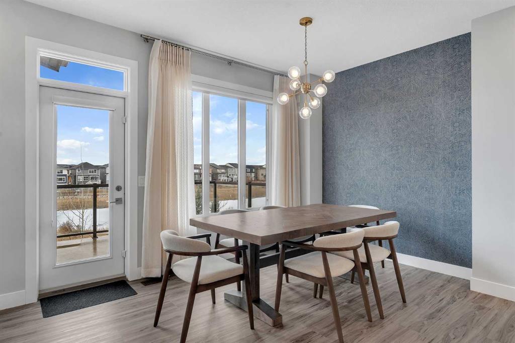 Welcome to this exceptional, modern custom built Excel show home located in the sought after community of Carrington. This beautifully crafted 4 bedroom plus den, 2.5 bathroom property offers a perfect blend of style and comfort, featuring a west facing backyard designed to capture stunning views year round. Situated on a premium pond lot with no rear neighbors, the home provides uninterrupted scenery from both the breakfast nook and the spacious deck ideal for enjoying sunsets, northern lights, or tranquil evenings under the moonlight. Inside, the home impresses with its refined finishes and well planned layout. The main floor is finished with durable luxury vinyl plank flooring and includes a welcoming great room with a fireplace that frames picturesque pond views. The chef inspired kitchen boasts full height custom cabinetry, quartz countertops, a gas range, stainless steel appliances including a full size fridge and freezer plus a built in wall oven and microwave. An oversized island with seating and a large walk in pantry add both function and flair. A dedicated office space on this level is perfect for working from home or additional flexibility Upstairs, the primary suite offers serene pond views, a stylish feature wall, a spacious walk in closet, and ensuite complete with a fully tiled shower, freestanding soaker tub, and dual sinks. Three additional generously sized bedrooms share a bright five piece bathroom with ample natural light. A large bonus room and a convenient upper level laundry room complete the second floor. The walkout basement remains unfinished, offering endless possibilities to customize or develop into additional living space or a legal suite. The home also features 9-foot ceilings on both the main and upper floors, a built-in speaker system, and a newly updated roof and siding (2025). Outside, the landscaped backyard includes a private gate with direct access to the city’s pathway network perfect for walking or enjoying the outdoors. Living in Carrington means convenient access to Stoney Trail, the mountains, skiing, downtown, and a welcoming, active community. This is a rare opportunity to own a truly outstanding home.