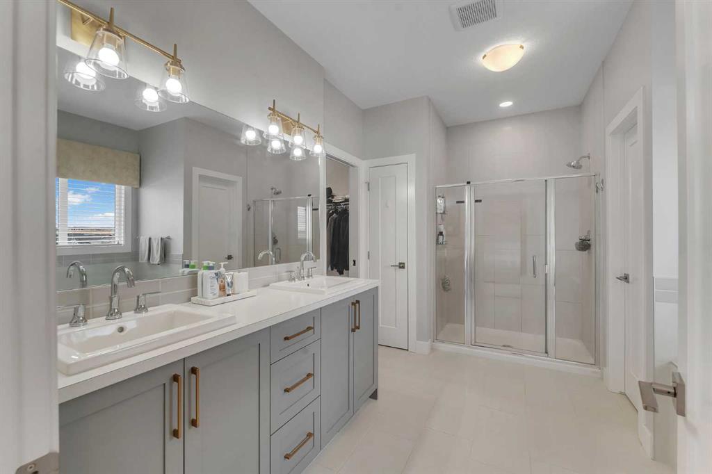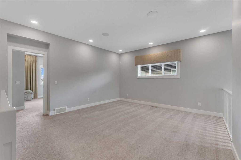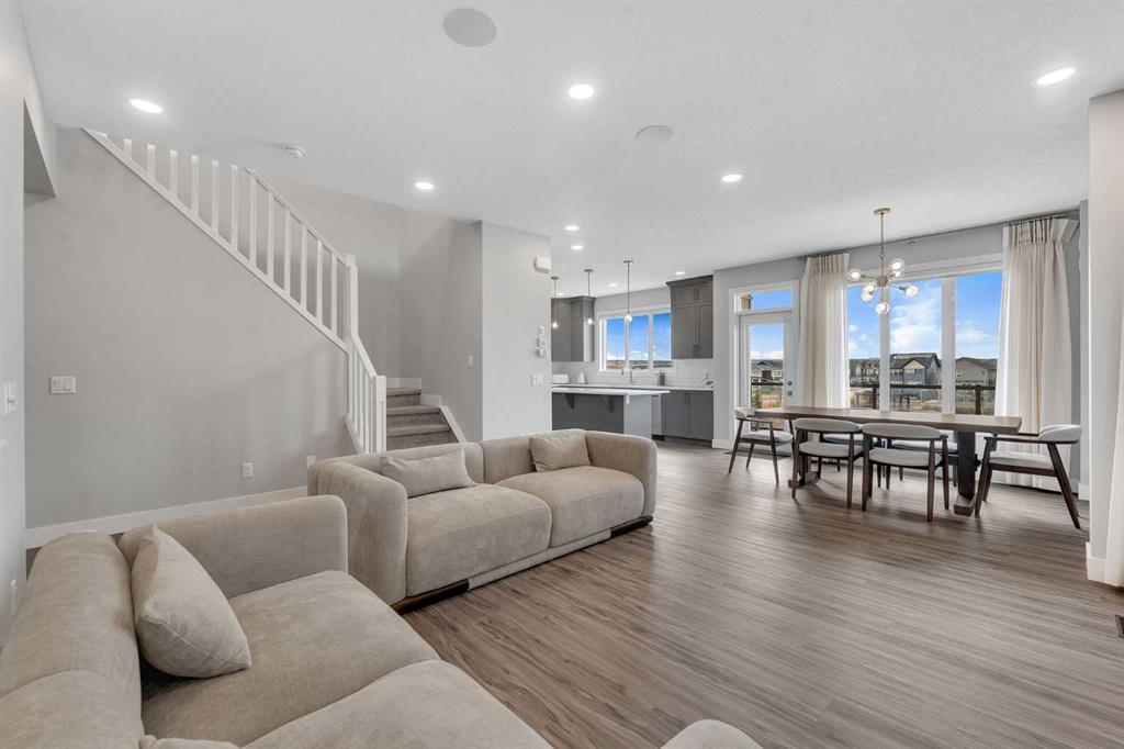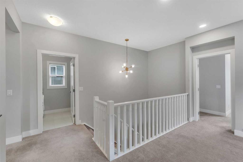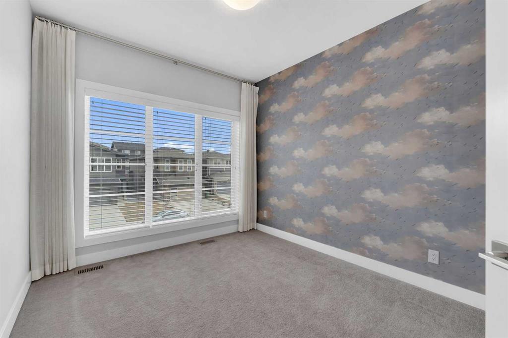 Welcome to this exceptional, modern custom built Excel show home located in the sought after community of Carrington. This beautifully crafted 4 bedroom plus den, 2.5 bathroom property offers a perfect blend of style and comfort, featuring a west facing backyard designed to capture stunning views year round. Situated on a premium pond lot with no rear neighbors, the home provides uninterrupted scenery from both the breakfast nook and the spacious deck ideal for enjoying sunsets, northern lights, or tranquil evenings under the moonlight. Inside, the home impresses with its refined finishes and well planned layout. The main floor is finished with durable luxury vinyl plank flooring and includes a welcoming great room with a fireplace that frames picturesque pond views. The chef inspired kitchen boasts full height custom cabinetry, quartz countertops, a gas range, stainless steel appliances including a full size fridge and freezer plus a built in wall oven and microwave. An oversized island with seating and a large walk in pantry add both function and flair. A dedicated office space on this level is perfect for working from home or additional flexibility Upstairs, the primary suite offers serene pond views, a stylish feature wall, a spacious walk in closet, and ensuite complete with a fully tiled shower, freestanding soaker tub, and dual sinks. Three additional generously sized bedrooms share a bright five piece bathroom with ample natural light. A large bonus room and a convenient upper level laundry room complete the second floor. The walkout basement remains unfinished, offering endless possibilities to customize or develop into additional living space or a legal suite. The home also features 9-foot ceilings on both the main and upper floors, a built-in speaker system, and a newly updated roof and siding (2025). Outside, the landscaped backyard includes a private gate with direct access to the city’s pathway network perfect for walking or enjoying the outdoors. Living in Carrington means convenient access to Stoney Trail, the mountains, skiing, downtown, and a welcoming, active community. This is a rare opportunity to own a truly outstanding home.