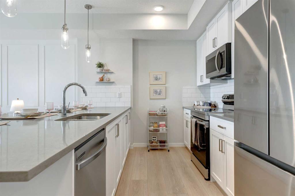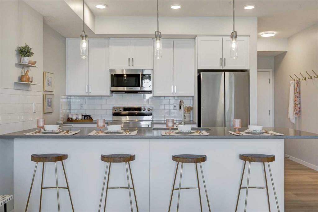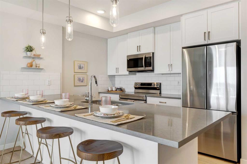 INTRODUCING MINTOFT PLACE ON BLACKFOOT TRAIL, IN BEAUTIFUL CENTRAL SE, CALGARY. BUILT BY CEDARGLEN LIVING, WINNER OF THE Customer Insight BUILDER OF CHOICE AWARD, 6 YEARS RUNNING! BRAND NEW "N4" unit with high-spec features. You will feel right at home in this well thought-out, 776.02 RMS sq.ft. (837 sq.ft. builder size). 2 bed, 2 bath home with open plan, 9' ceilings, LVP flooring throughout common areas, carpets in the bedrooms and closets (option to upgrade to LVP), Low E triple glazed windows, BBQ gas line on the patio, Fresh Air System (ERV), and so much more. The kitchen is spectacular with full height cabinets, quartz counters, undermount sink, rough-in water line to the fridge and S/S appliances. The island is extensive with built in flush breakfast bar, which transitions into the living area, perfect for entertaining. The spacious primary bedroom has a large bright window (triple pane windows), sizeable closet and 4 pc ensuite. Nearby is the second bedroom and 4pc main bath with quartz counters, and undermount sink. The spacious laundry/storage room is a must see (washer & dryer included). Highlights include: Hardie board siding, designer lighting package, sound reducing membrane to reduce sound transmission between floors, clear glass railing to balconies and 1 titled underground parking stall included (storage lockers available for purchase). A once in a lifetime community off Blackfoot Trail and Southland Drive in Calgary. Nature lovers will appreciate that Sue Higgins park and Carburn Park are a short stroll away. Deerfoot meadows shopping centre, anchored by Costco, Ikea and Walmart, along with many other amazing shops and restaurants are located in very close proximity. PET FRIENDLY COMPLEX, PRE-CONSTRUCTION OPPORTUNITY, PURCHASER CAN STILL MAKE SELECTIONS, and PHOTOS ARE OF A DIFFERENT SHOW SUITE FOR REFERENCE ONLY, FINISHING'S/PLAN WILL DIFFER. ESTIMATED COMPLETION RANGE IS APRIL 2027-DECEMBER 2028. VISIT THE SHOW SUITE OR CALL TODAY FOR MORE INFO.