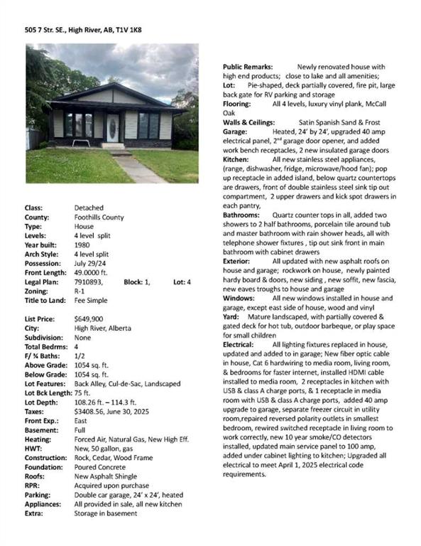 Click brochure link for more details. Price Reduced by $17,400. Newly renovated 4 bedroom 3 bathroom house with high end products; close to lake and central to 3 schools. The kitchen features all new stainless steel appliances, a pop-up receptacle in the island, quartz countertops with under cabinet lighting and a double stainless steel sink. Below the sink is a tip out compartment. Each of the 2 Pantries has 2 inside drawers and 2 lower drawers as well as kick-spot drawers. Outside offers a mature landscaped yard with a partially covered and gated deck for a hot tub, outdoor barbeque or play space. Throughout the home there is plenty of new electrical features including fiber optic cable (CAT-6) for high speed internet to the living room, media room and all the bedrooms. There are new outlets in the kitchen and media room with USB and Class A phone charging ports. This home features a new high efficiency furnace and a new 50 gal hot water tank. The 24'x24' heated garage is powered by a 40 amp panel with three additional workbench receptacles.