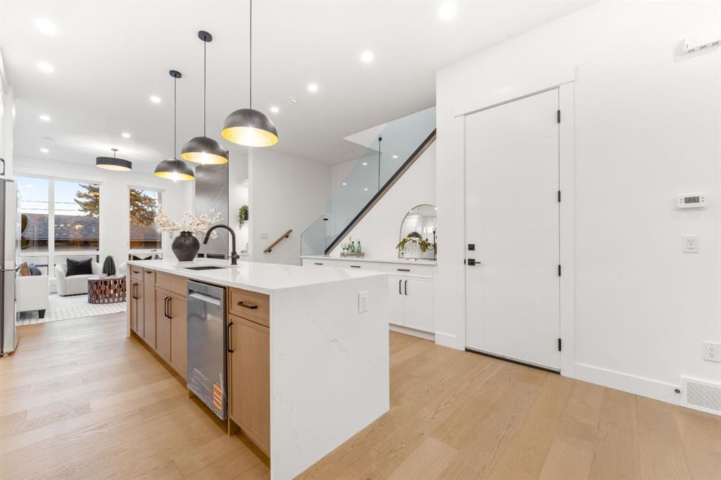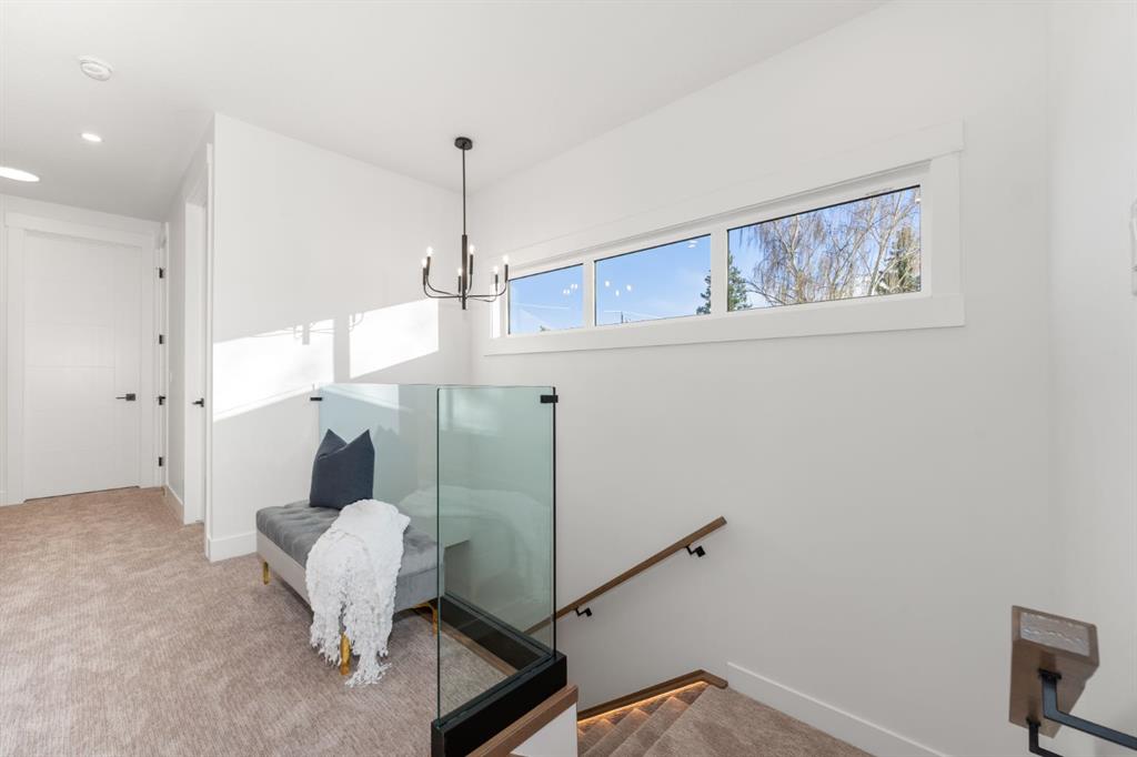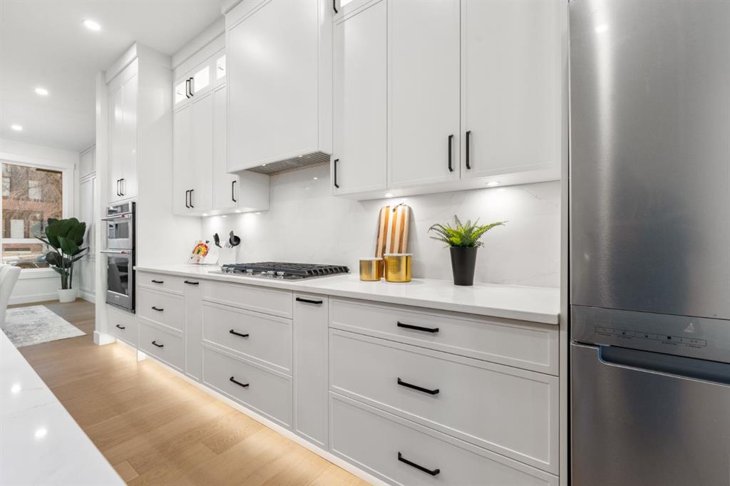 Welcome to Refined Living in Rosscarrock ! Crafted for those who appreciate fine design and smart investment. Luxury, comfort, and convenience come together beautifully at 1444 43 Street SW, an exquisite modern infill designed for today’s lifestyle. Perfectly positioned in the sought-after community of Rosscarrock, this home is within walking distance to the Westbrook C-Train Station, Westbrook Mall, Walmart, Starbucks, and local restaurants — offering true inner-city living without compromise. Step inside and be greeted by 10-foot ceilings, an open and airy floor plan, and engineered hardwood flooring on the main level. The chef-inspired kitchen is a showstopper, featuring built-in premium appliances, a massive extended island with a dual waterfall quartz countertop, full-height cabinetry, and a sleek quartz backsplash. Designed to impress, this kitchen perfectly balances luxury and everyday functionality. The living area exudes elegance with its feature gas fireplace, glass-railed staircase, and abundance of natural light, creating a warm and welcoming atmosphere ideal for gatherings or quiet evenings at home. Upstairs, the primary suite is a serene retreat — highlighted by a vaulted ceiling, custom-designed closet, and a luxurious five-piece ensuite with a soaker tub, double vanity, glass-enclosed shower, and in-floor heating for a spa-like experience. Two additional bedrooms, a full bath, and a laundry room complete the upper level, designed with both comfort and practicality in mind. A standout feature of this property is the fully LEGAL two-bedroom basement SUITE with its own private side entrance, ideal for generating rental income or hosting extended family. The suite includes a full kitchen, private laundry , and sound-reduction construction for added privacy. Every element of 1444 43 St SW has been crafted with precision and purpose, offering an elevated lifestyle in one of Calgary’s most desirable inner-city communities.