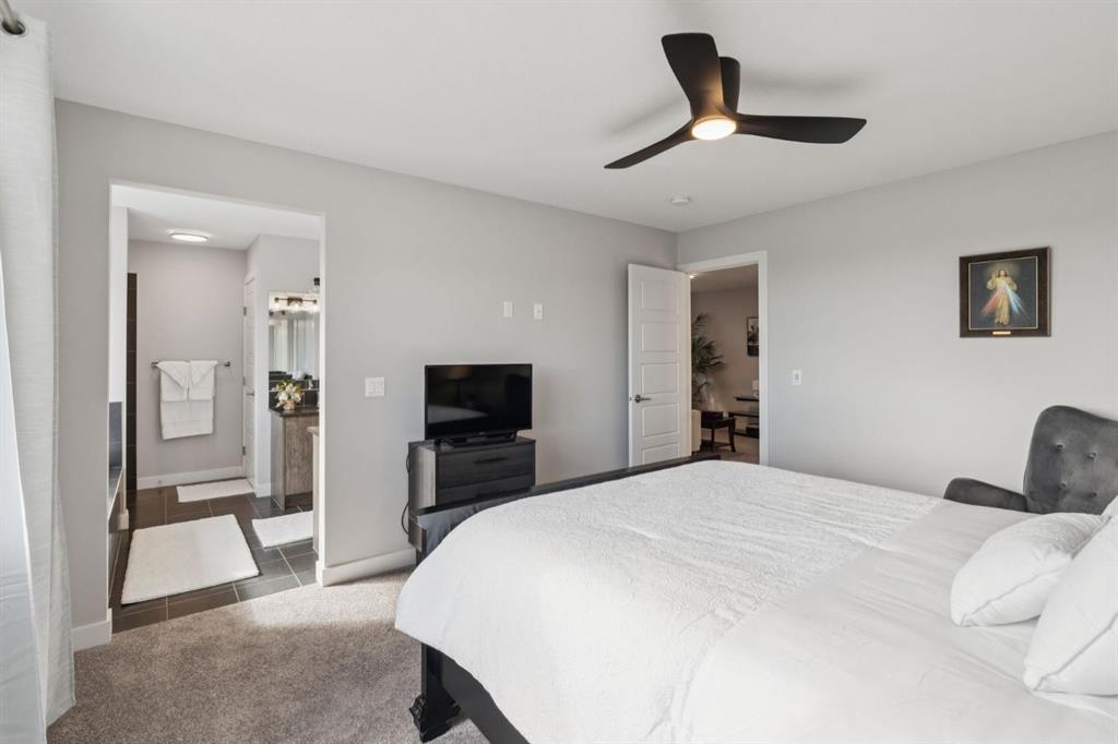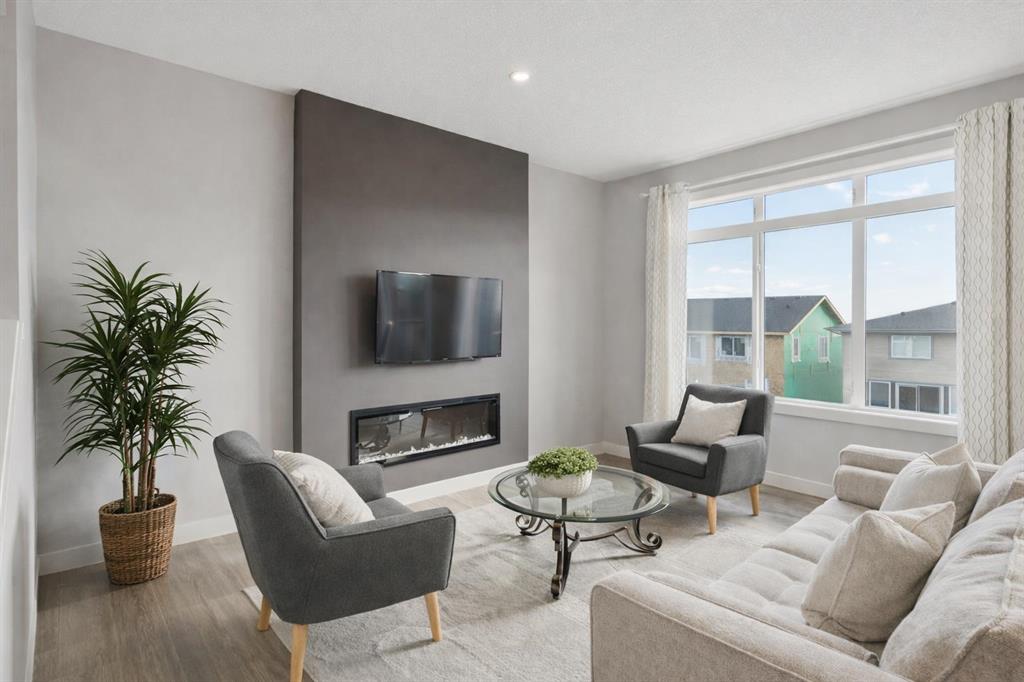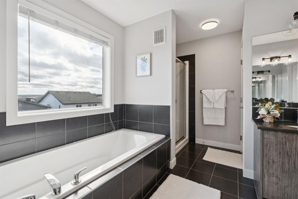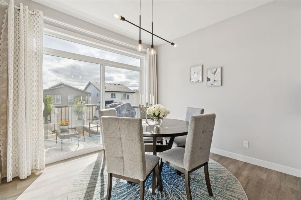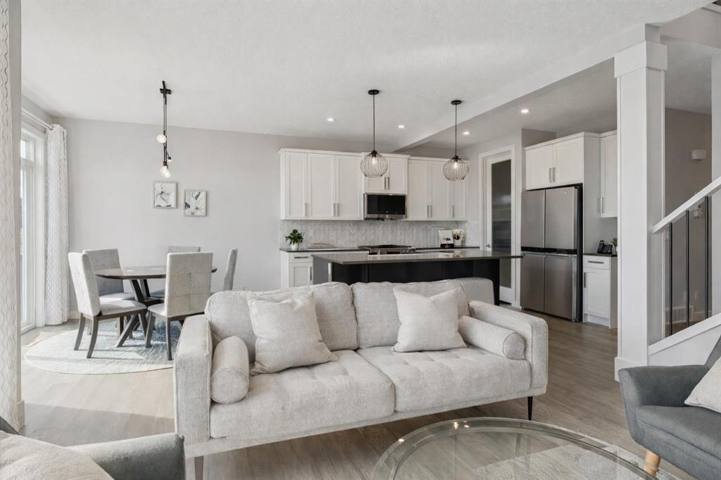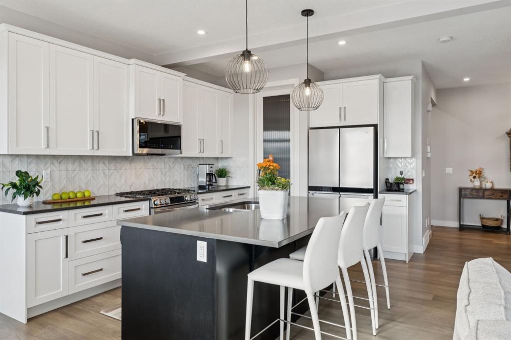 Experience refined living in this beautifully designed 2023-built home, where timeless style meets everyday comfort. The heart of the home is a bright, luxurious WHITE KITCHEN featuring QUARTZ COUNTERTOPS, STAINLESS STEEL APPLIANCES, DESIGNER TILE, and elegant finishes throughout—perfect for both entertaining and daily living. Upstairs, the stunning primary bedroom is a true retreat offering sweeping VIEWS of Cochrane’s Glenbow Valley and a spa-inspired 5-PIECE ENSUITE complete with a SOAKER TUB, STAND-ALONE SHOWER, DOUBLE VANITY, and generous WALK-IN CLOSET. A stylish BONUS ROOM with a TRANSOM WINDOW bringing in natural light and architectural charm, while two additional bedrooms share a beautifully finished 4-PIECE BATHROOM. The LAUNDRY ROOM conveniently completes this upper level. Thoughtful details continue throughout, including a welcoming BUILT-IN BENCH at the entry, QUARTZ COUNTERS in every bathroom, and an elegant ELECTRIC FIREPLACE creating a cozy focal point in the main living area. The UNFINISHED WALKOUT BASEMENT offers endless potential with a BATHROOM ROUGH-IN and direct access to a PRIVATE LOWER DECK. Outside, enjoy your fully fenced EAST-FACING BACKYARD, lined with trees and featuring two outdoor living spaces—an UPPER DECK with PRIVACY SCREEN and a LOWER PATIO, both with STUNNING VIEWS of the valley. Located within walking distance to the river valley, parks, schools, and amenities, with quick access to the Rec Centre, shopping, and more, this home offers elevated living in a peaceful, scenic setting—a perfect blend of luxury, lifestyle, and location.