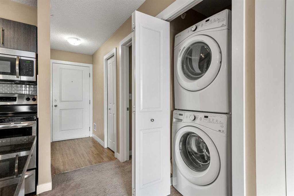 Are you looking for a smart investment or a place to call your own at an attractive price point with low condo fees? This could be the one. This fantastic condo delivers comfort, practicality, and real value with low condo fee’s. Situated on the TOP FLOOR , this MOVE-IN-READY unit offers a fabulous peaceful PARK/POND VIEW and a setting you’ll appreciate every day. This well-kept and spacious 2-bedroom, 1-bathroom condo is located in the family-friendly, amenity-filled community of Saddle Ridge. The location is hard to beat, with quick access to the Saddletown C-Train Station, the Genesis Centre, nearby restaurants, and an excellent proximity to a network of walking and biking paths. This bright top-floor unit spans nearly 700 sq. ft. and features an open-concept layout designed to make the most of the space. From the main living area, step onto the sun-filled south-facing balcony and take in relaxing views of the park and scenic pond — a great place to recharge or host guests. The kitchen flows seamlessly into the main living space and includes stone countertops, rich dark cabinetry, & generous counter space. The additional large counter makes it the perfect spot for everyday use, casual meals or hosting family and friends. The comfortable living room provides a peaceful place to relax after a long day. The dining area makes it easy to gather with family and friends for meals and special occasions. In-suite laundry adds everyday convenience and functionality. The primary bedroom offers plenty of room to unwind and includes a large closet, while the second bedroom is also nicely sized and features its own closet. A 4-piece bathroom completes the layout with stylish stone counters. Step outside to your balcony, ideal for BBQs, fresh air, and quiet moments outdoors. Other notable features include IMMEDIATE POSSESSION AVAILABILITY, low condo fees, and a conveniently located parking stall close to the main entrance. The elevator is also conveniently located close to your unit for easy access in and out. This home offers excellent value for first-time buyers, professionals, downsizers, or anyone looking for a reliable investment opportunity. Schedule your showing today and come see everything this property has waiting for you!