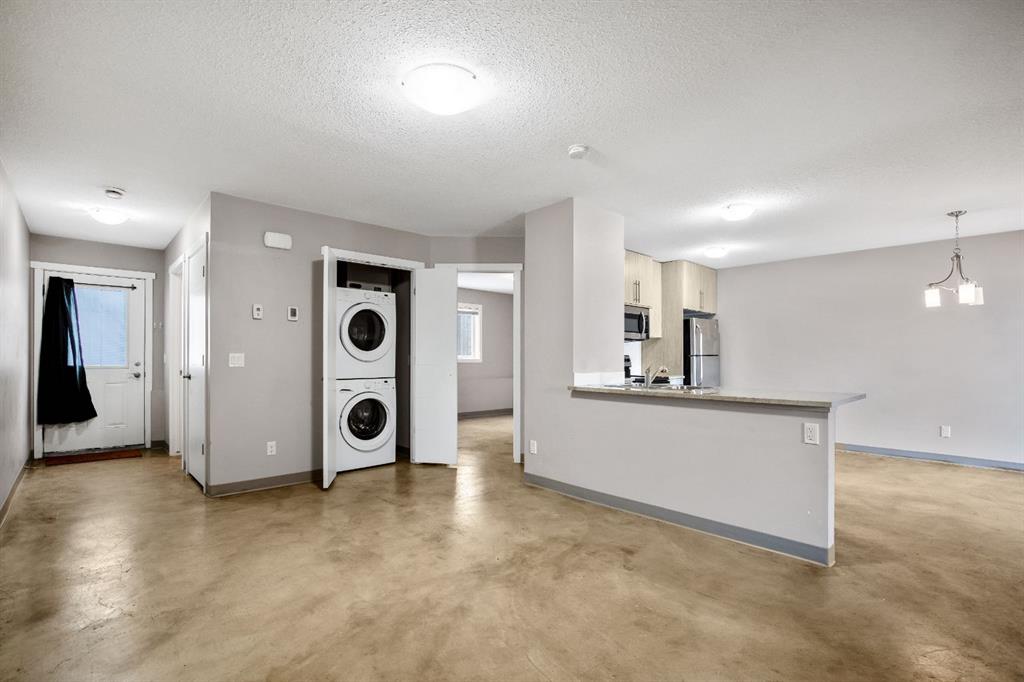 QUICK POSSESSION AVAILABLE Welcome to this budget-friendly 2-bedroom, 1-bath condo in the heart of downtown Strathmore. This open-concept unit is perfect for first-time home buyers, those looking to downsize, or investors seeking a low-maintenance property with a LOW CONDO FEE The home features a brand NEW convection/air-fryer stove , FRESH PAINT, acid-washed concrete floors with in-floor heating, on-demand hot water, with a functional layout and IN-SUITE LAUNDRY. Enjoy a nicely sized covered patio, one off-street parking stall with plug-in, and plenty of additional street parking. Conveniently located across the road from the Catholic schools, just minutes from downtown shopping, the lake with walking paths, and easy highway access for commuters. This building is also PET FRIENDLY.A great opportunity to own in a central, walkable location. Please note this unit is below grade. Contact your favourite Realtor®? today to book your private showing.