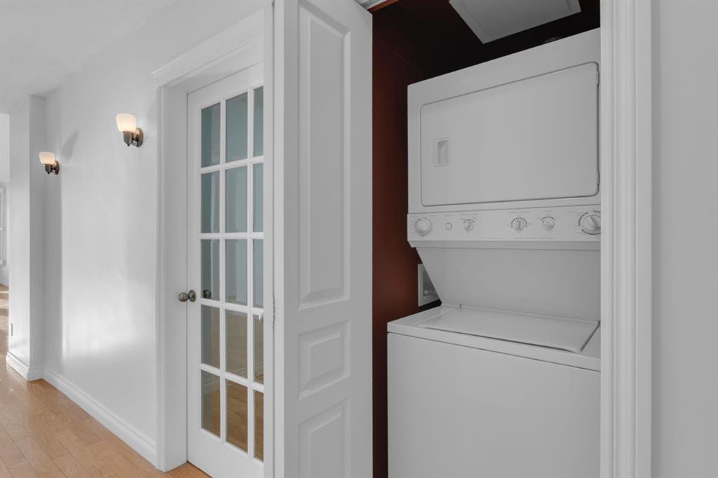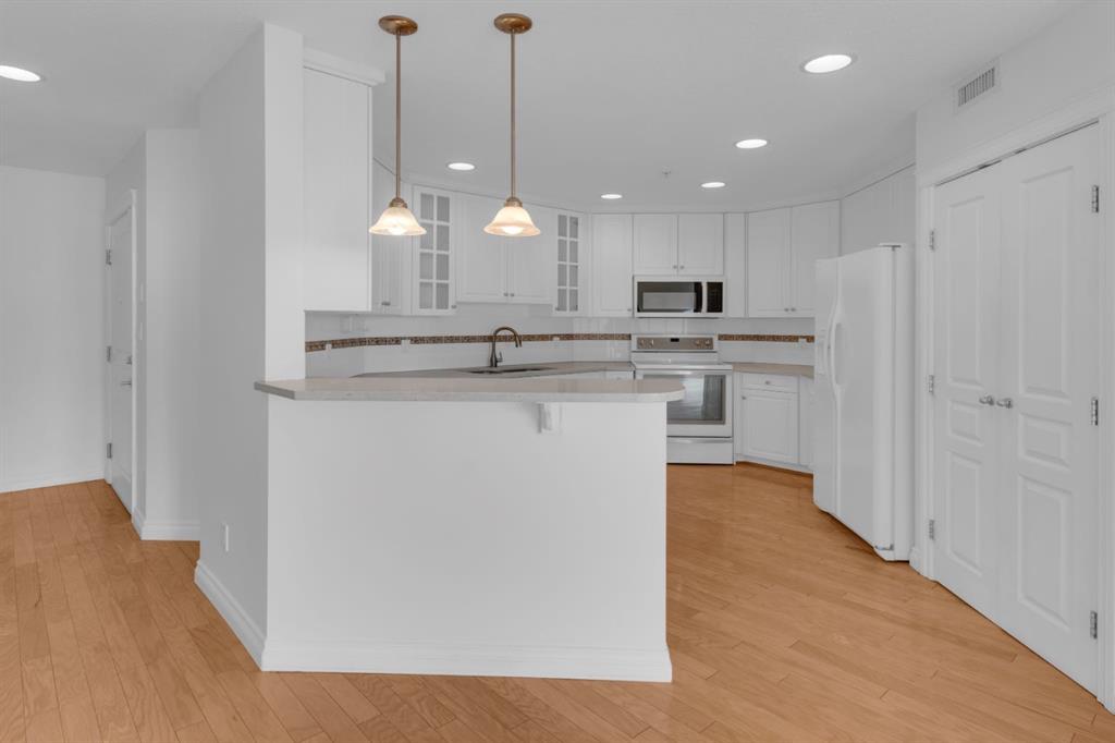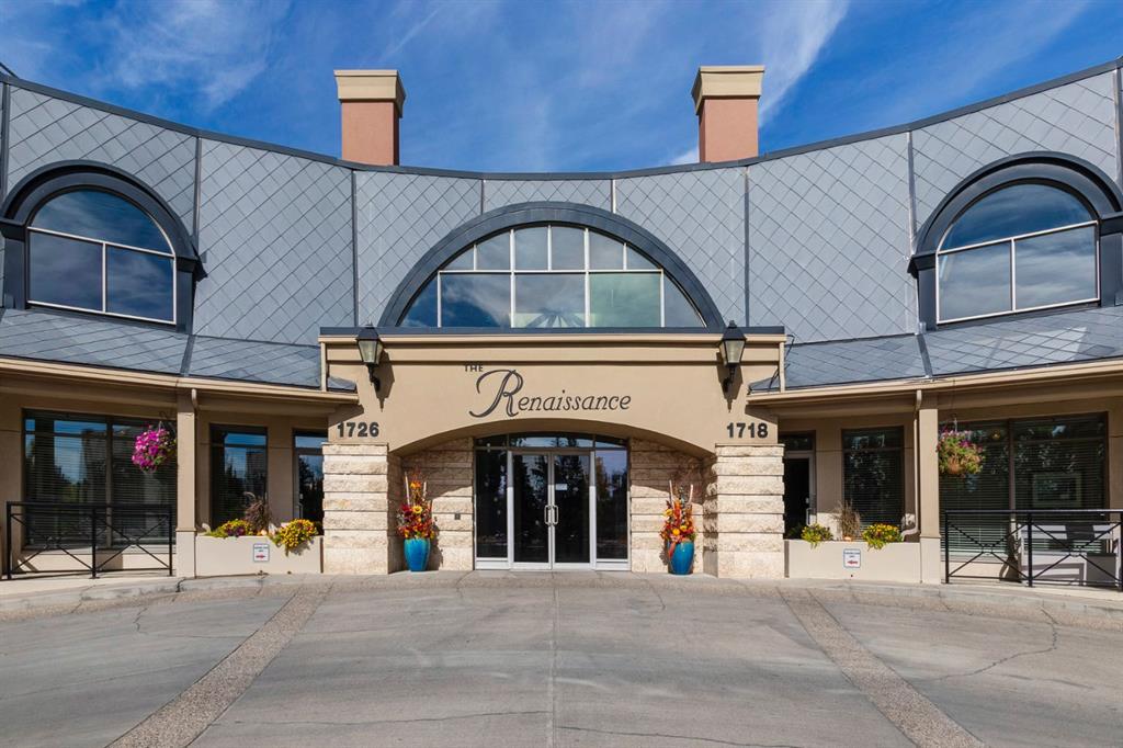 Spectacular panoramic mountain and downtown city views! Large bright southern windows fill this immaculate updated 1300 sq.ft. home with natural light all day. Impressive luxurious hardwood floors in large, open and very functional living and bedroom areas. Ample space for a full dining suite and a comfortable size living room for entertaining friends and family. Plus a discreetly located den for home office or extra in suite storage. Sunrise breakfast and bbq balcony, 2 spacious bedrooms, 2 full baths, in suite laundry. This freshly painted home has multiple significant updates including; hardwood, white kitchen with quartz, completely redone 5 piece en suite with glass shower, double vanity and soaker tub. New vinyl plank bathroom flooring, and brand new microwave hood fan. 2 titled underground parking stalls with nearby oversized private enclosed storage room. You will love your carefree lifestyle in The Renaissance, one of Calgary’s most desirable premier adult living condo buildings with an extensive list of amenities. Bright well equipped gym and exercise area, guest suites, movie theatre, party room, arts + crafts space, games room, library, car wash bay, heated visitors parking, an expansive common area green space terrace and walk to do grocery shopping though private, secure heated indoor access into North Hill Mall. You will feel at home with the quality of this complex from the moment you walk into the airy vaulted lobby and greeted by the friendly and helpful full time concierge. Truly unbeatable value…just move in, relax and enjoy…you’ve earned it!