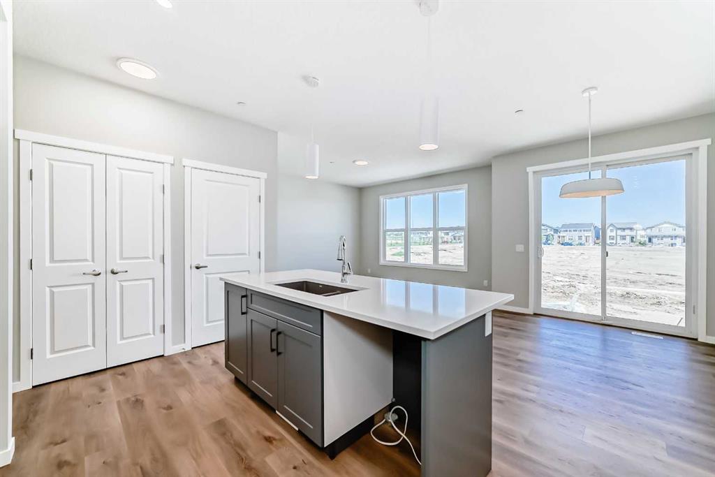 Welcome to the exquisite "Carisa" floor plan, where nearly 1,700 SqFt of thoughtfully designed space combines modern elegance with unmatched functionality. This home’s layout is tailored for both comfort and style, creating the perfect setting for family living and entertaining. As you step inside, you’ll be greeted by the warmth and durability of vinyl plank flooring that flows seamlessly throughout the main level, accentuating the modern finishes and striking architectural details. Natural light pours in through the back wall of windows, infusing the open-concept living areas with an inviting ambiance. Dual sliding patio doors extend your living space to the expansive backyard, ready for your personal touch to create the ultimate indoor-outdoor oasis. At the heart of the home, the kitchen is a chef’s dream. Featuring two-tone cabinetry, sleek quartz countertops, and a stylish tile backsplash that wraps elegantly around a chimney-style hood fan, this kitchen is as functional as it is beautiful. Stainless steel appliances and a thoughtfully positioned mudroom with direct kitchen access ensure that even grocery days are effortless. A cozy dining nook and a spacious living room, are perfectly positioned to enjoy the home’s abundant natural light. The smartly designed pocket office offers the perfect work-from-home setup or a dedicated homework space for the kids. Upstairs, a versatile bonus room serves as the ideal family retreat, separating the serene primary suite from the secondary bedrooms. The primary suite is a tranquil haven, complete with a luxurious 4-piece ensuite featuring an oversized shower and ample space to unwind. The two additional bedrooms are generously sized, making them ideal for children or guests. With an upstairs laundry room and a stylish 4-piece bathroom, convenience is woven into every detail of this home. **This home also comes complete with full front and backyard landscaping, including sod, mulch on the side yards, and trees/shrubs in the front as per community guidelines. Located in the vibrant southeast Calgary community of Hotchkiss, this home offers more than just a beautiful living space. Residents enjoy stunning mountain views, 51 acres of park space, interconnected walking paths, and a central wetland. Designed with families in mind, Hotchkiss is a community where you can truly belong and thrive.