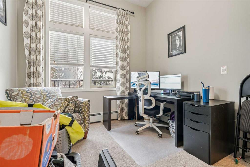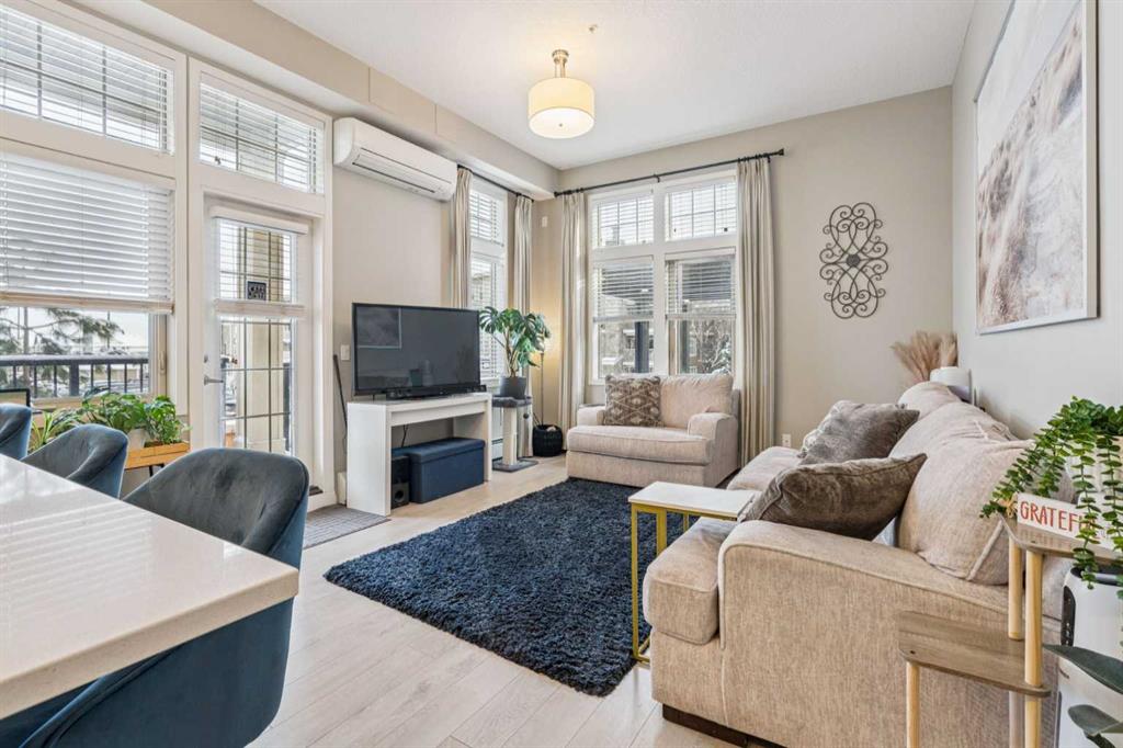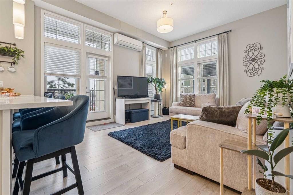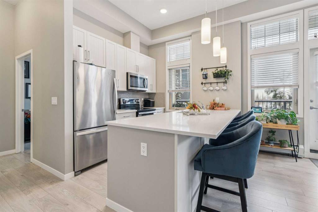 Step into this showcase worthy main floor corner unit offering almost 900 sq ft of bright, open concept living. Soaring 11 foot ceilings and floor-to-ceiling windows flood the space with natural light, creating an airy, upscale feel the moment you walk in. The modern white chef inspired kitchen features sleek quartz countertops, stainless steel appliances, and plenty of cabinetry perfect for cooking, hosting, or enjoying a quiet night in. The layout is ideal with two spacious bedrooms positioned on opposite sides of the unit for added privacy, along with two full bathrooms, including a stylish ensuite. Enjoy the convenience of in-suite laundry, durable mahogany-tone vinyl flooring, and the comfort of being on the main floor, no elevators needed. As a corner unit, you benefit from extra windows, enhanced privacy, and additional outdoor exposure. Located just steps from shopping, restaurants, transit, and daily amenities, this home blends modern style with unbeatable convenience. Perfect for first time buyers, downsizers, or investors.