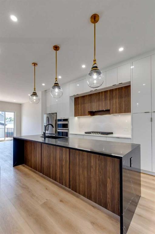 Mazon Design presents the “Richmond”, custom-built home on a choice, south exposure lot in the heart of popular Richmond/Knobhill. Mazon Design offers one-of-a-kind, hands-on attention to detail with over 2,300 sqft of luxury living space and 3 levels of quality upgrades & finishings. The open main floor is beautifully designed with 10’ ceilings and 8' interior doors, highlighted with a full size dining room and a dream kitchen featuring a 10’ island with seating for 6, floor-to-ceiling custom cabinets, Quartz countertops, gas range and top-of-the-line plumbing and lighting! The adjoining great room has a feature wall with media cabinets and a gas fireplace finished in porcelain tile. The wall of glass opens to an oversized, south exposure deck, plumbed for a gas BBQ. Conveniently located ½ bath and private mudroom with direct access to the yard and garage complete the main floor. The glass railings and in-step lighting make the stairway to the 2nd level a visual highlight! Upstairs features 9’ ceilings, fully equipped laundry, 3 piece bath, 2 spacious bedrooms (both with walk-in closets) and a gorgeous primary suite with multi-vaulted ceiling and spa-inspired ensuite which has to be seen to be appreciated! The lower level has the same level of quality finishings: 9’ ceilings, in-floor heating, 3 piece bath and spacious bedroom for guests or an office or home gym. The family room with the additional cabinets, sink and beverage fridge, is a great space for a home theater and play area for the kids. Easy lane access to the double detached garage which is drywalled, insulated and fully wired for an EV. Some notable upgrades: floorings glued and screwed (not nailed), 70 gal hot water tank, water softener, all cantilevers sprayed with R-40 insulation, basement walls waterproofed with “water dog asphalt coating”, foundation wrap membrane, additional rebar in basement slab to provide durability and a sump pump for peace of mind, an additional water line run to the back deck for a future hot tub plus fully landscaped front and back yards. Mazon Design carefully built and designed the home between 2 beautiful 70 year trees that provide both shade and gorgeous curb appeal. Amazing location around the corner from a park, walk to the shops and restaurants on 17th Ave and only minutes to downtown. Pick your possession date and move right in! Unbeatable Value!! New Home Warranty and Builder’s One Year, Door-to-Door Warranty. Price includes GST. Unbeatable value! Property is being sold at list price which is below replacement cost!