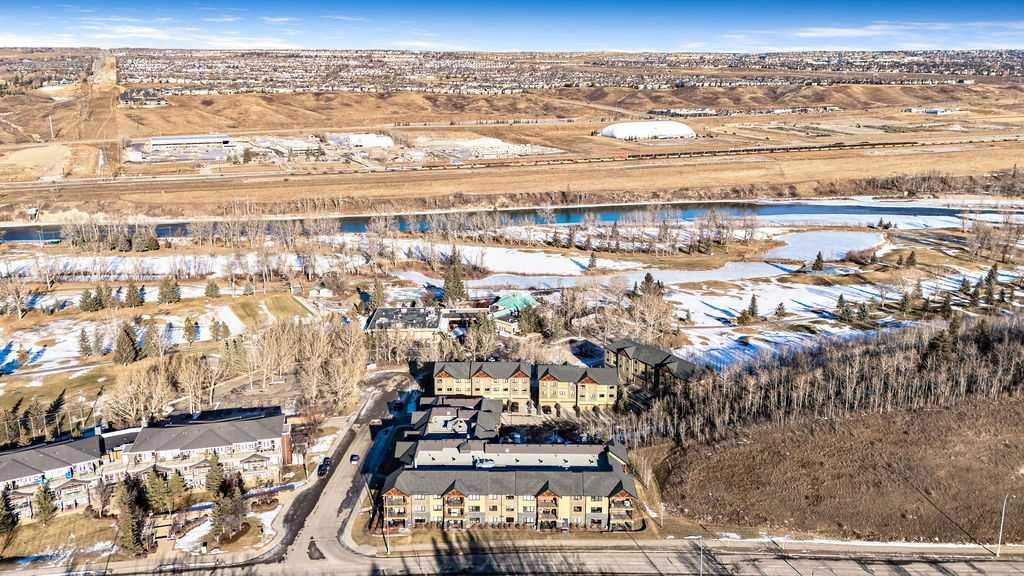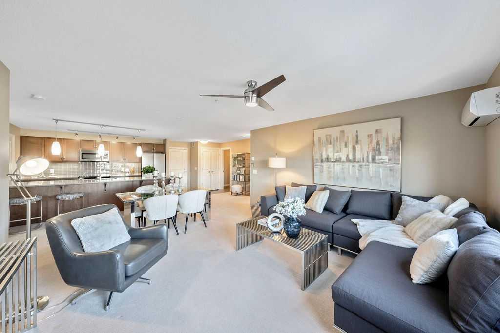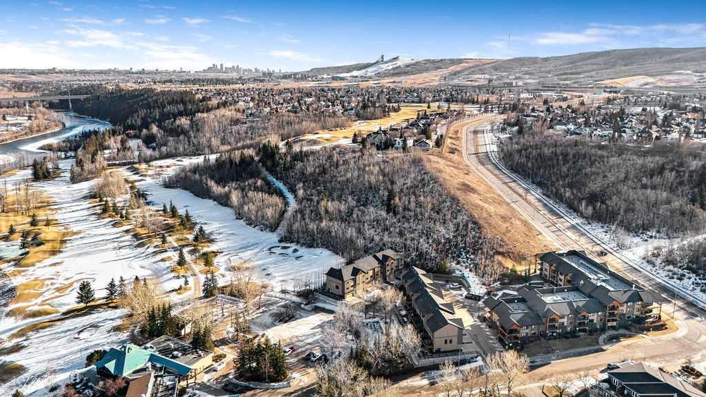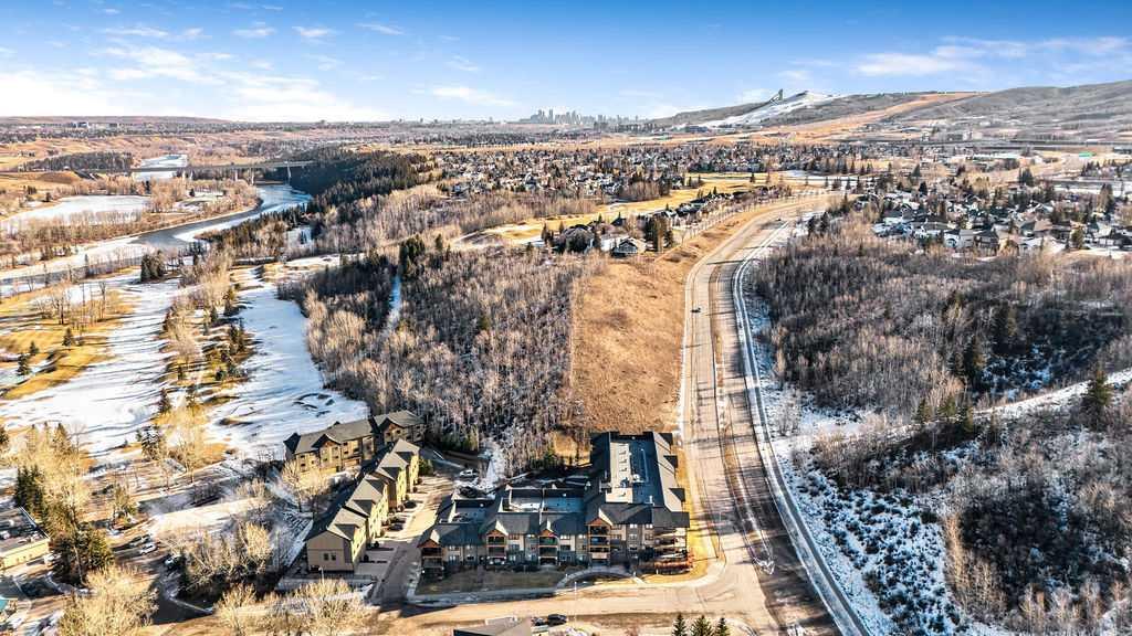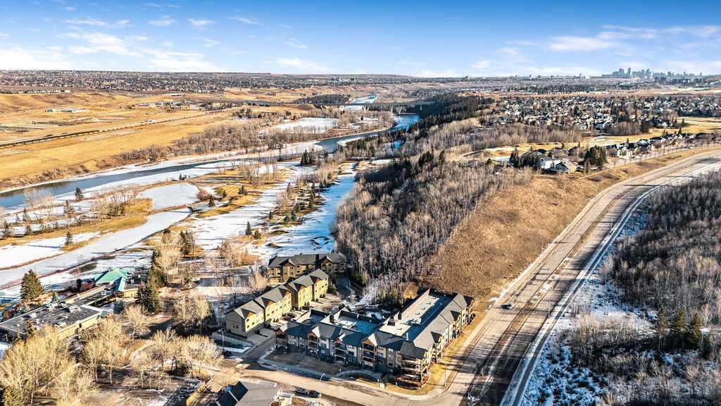 This beautifully maintained third-floor residence offers a rare blend of serenity, space, and thoughtful design within an intimate, adult-oriented (18+) building known for its strong governance and exceptional reserve fund. Inside, natural light pours through expansive windows, illuminating a well-considered floor plan that balances openness with privacy. The kitchen is both elegant and functional, anchored by stone countertops, stainless steel appliances (including a brand-new refrigerator), an oversized breakfast bar, under-cabinet lighting, a reverse-osmosis water system, and a generously sized pantry. It flows seamlessly into a dining area designed to comfortably host gatherings both casual and refined. The living room is spacious and inviting, and gives direct access to the balcony, an outdoor extension large enough for a BBQ and lounge seating, where peaceful nature views and visiting wildlife become part of daily life. The primary suite offers a calm and restorative escape, complete with a walk-through double-sided closet and a private ensuite with additional linen storage. A well-proportioned second bedroom and a substantial four-piece main bath, also featuring extra storage, provide flexibility for guests, hobbies, or a home office. Completing the interior is a massive in-unit laundry room, a rare and highly practical feature. Comfort is elevated year-round with air conditioning, while convenience is enhanced by two titled parking stalls (one underground, one surface) and a titled storage locker located on the same floor as the unit. Beyond the home, residents enjoy a beautifully appointed lobby and vibrant community amenities including a gazebo with outdoor gathering area - often the backdrop for weekly happy hours and social gatherings. Moments from the river pathways, Valley Ridge Golf Course, COP, and with effortless access to Stoney Trail and the mountains, this is a lifestyle defined by ease, connection, and quiet sophistication. Private, peaceful, and impeccably cared for, this is Valley Ridge living at its finest.