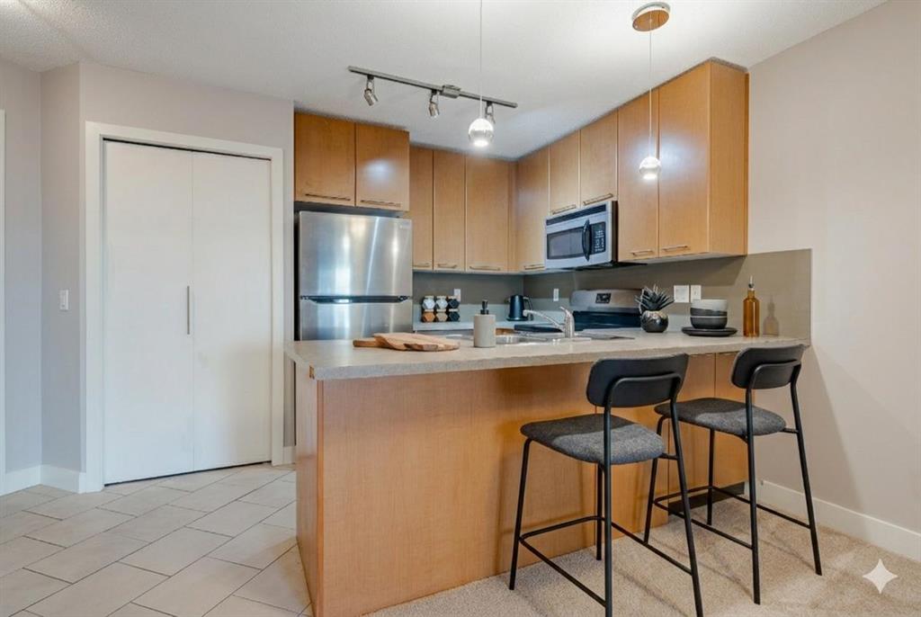 IDEAL FOR MRU STUDENT OR INVESTORS! This corner-unit living in Morgan House, right in the heart of Lincoln Park. Just minutes from Mount Royal University, transit, and everyday shopping. This is the kind of 1-bedroom that actually feels livable thanks to a unique corner layout with a true dining area and an open, comfortable flow. The kitchen offers a full appliance package and plenty of cabinetry, while the living room is anchored by a cozy gas fireplace perfect for Calgary winters that like to hang around. Step out to your semi-private balcony for fresh air and a quiet reset. Due to being a corner unit the balcony is larger than other units. The primary bedroom is generously sized (yes, a king fits), and you’ll love the convenience of in-suite laundry. A large walk-in closet compliments this already large room. A cheater ensuite door provides privacy as well. You also get an underground parking stall plus an assigned storage locker. The den is a great spot for studying, gaming or the 2nd TV area. Residents enjoy excellent building amenities including a fitness centre, party room, guest suite, and an outdoor gazebo area—great for hosting friends or just getting out of your unit without going anywhere. A smart option for first-time buyers, students/faculty, or investors looking for a solid inner-city location