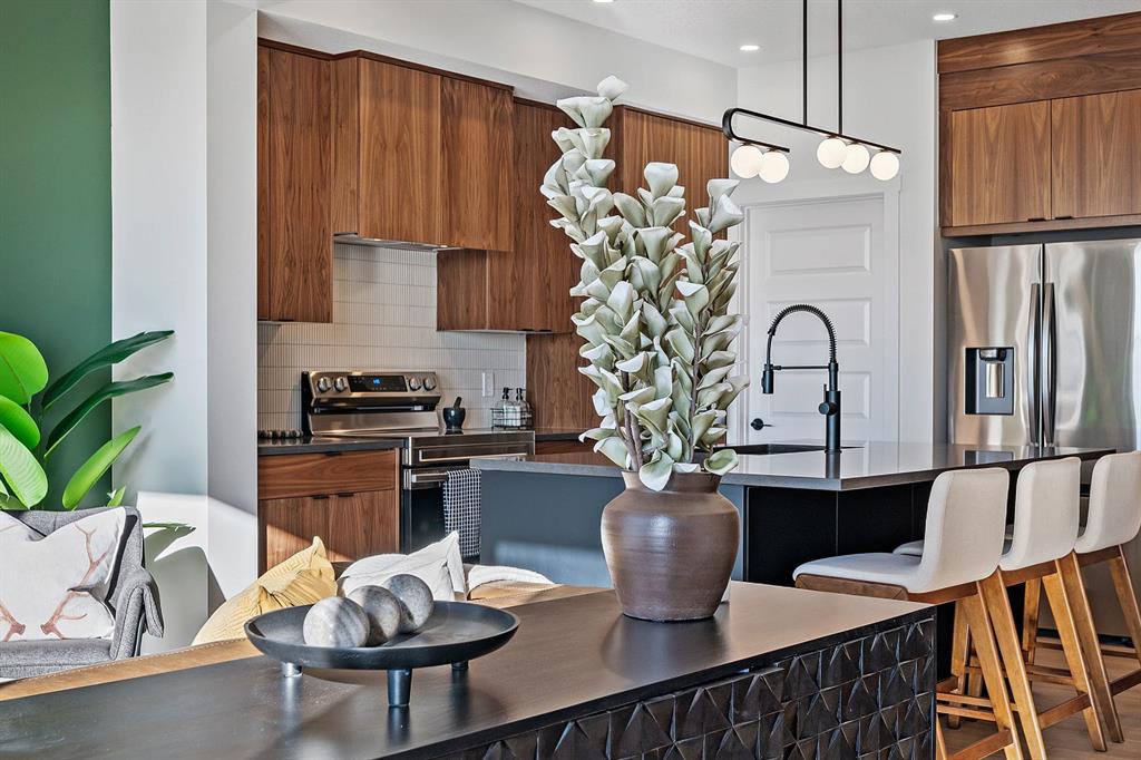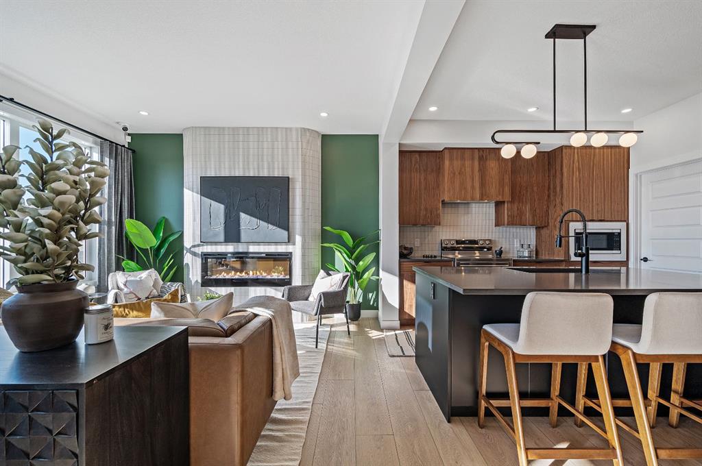 Welcome to the “Delilah” by Genesis Builders Group in the vibrant new community of Keystone Creek! This beautifully crafted home offers over 2,100 sq ft of beautifully designed space with 3 spacious bedrooms, 2.5 bathrooms, a main-floor office, and a rough-in for a future basement suite "legal suite subject to approval and permitting by the city/municipality", with a separate entrance. Step inside to airy 9’ ceilings and an inviting colour palette. A front flex room creates the perfect space for a home office or study, while a conveniently placed powder room adds everyday ease. The dining area flows effortlessly into the centrally located kitchen, which showcases quartz countertops, sleek stainless steel appliances and ample cabinetry with an island perfect for entertaining. The sun-drenched living room offers direct access to the sunny SOUTH-facing backyard, where a generous 9’6” x 10’ rear deck invites outdoor dining and relaxation. A functional mudroom off the double-attached garage completes this level and enhances everyday convenience. Upstairs, you’ll find a thoughtfully designed layout highlighted by a centrally located bonus room, beautifully illuminated by additional pot lights and large windows, offering excellent separation between sleeping areas. The spacious primary retreat features an expanded, upgraded ensuite complete with a soaker tub, walk-in shower, and dual sinks, along with a large walk-in closet. The second bedroom is well-sized, while the third bedroom impresses with its own walk-in closet. A full bathroom and convenient upper-floor laundry complete this level, while the impressive 72” x 48” picture window in the stairwell floods the home with natural light throughout. The unfinished basement continues the home’s thoughtful design with 9’ ceilings, its own private entrance, and a 1-bedroom legal suite rough-in, creating incredible flexibility for future development or income potential. The home is also equipped with added gas lines to both the BBQ location and the future gas range. Keystone Creek is one of Calgary’s newest and most exciting master-planned communities, offering a lifestyle that blends nature, connectivity, and urban convenience. With quick access to Stoney Trail, Deerfoot Trail, transit routes, shopping, dining, and recreation, Keystone Creek is perfectly positioned for families, professionals, and investors alike. PHOTOS ARE OF THE SHOW HOME and are representative. Taxes have not been assessed. RMS has been applied to builder blueprints.