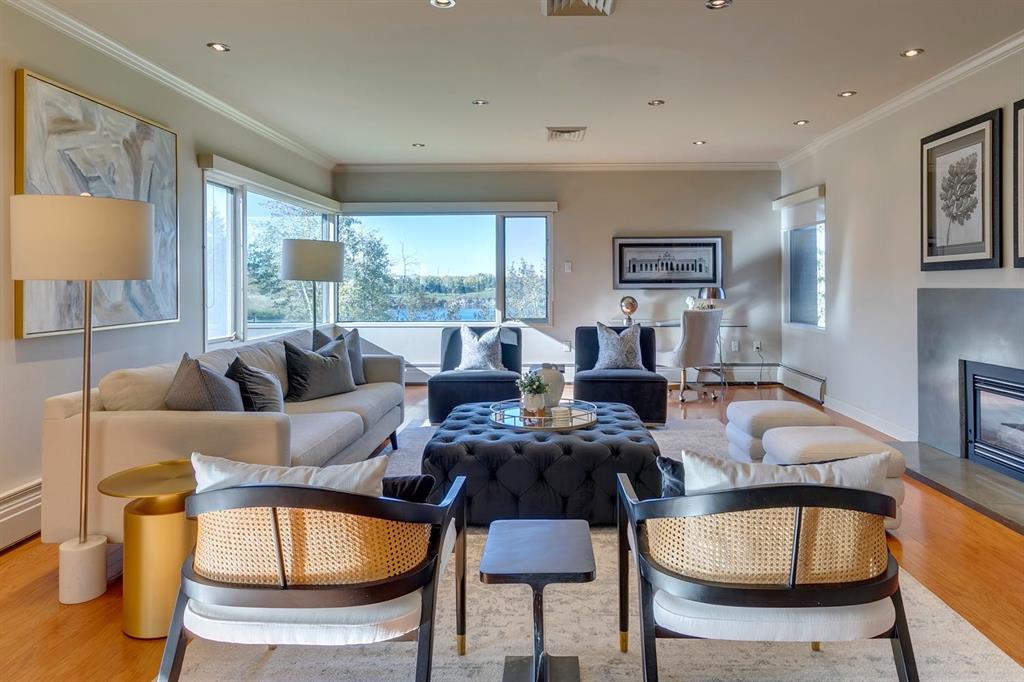 Experience Executive New York-style living in one of Calgary's most prestigious and intimate communities, Eagle Ridge. Your journey into luxury begins the moment you step into the elevator, which transports you directly to your private foyer, unveiling over 2,000 square feet of sophisticated living space. This exclusive residence immediately impresses with gleaming hardwood flooring that guides you through an expansive open floor plan, where every room captures breathtaking, panoramic views of the Glenmore Reservoir and the dynamic Calgary skyline. The heart of the home is the grand living area, anchored by a striking feature fireplace and bathed in natural light through walls of windows, seamlessly flowing into a secondary sitting space that opens onto a private balcony making it perfect for quiet mornings or evening relaxation. Entertaining is effortless in this thoughtfully designed home, which features a generous dining area ideal for hosting gatherings. The timeless, contemporary kitchen with high grade granite countertops, a tiled backsplash, premium stainless steel appliances, and abundant cabinetry. A bright breakfast nook offers a casual spot to enjoy your morning coffee while soaking in the views. The master bedroom is a true retreat, boasting an extended seating area below the window, a vast walk-in closet, and a classic en-suite bathroom complete with a walk-in shower and extensive storage. A spacious second bedroom and a full family bathroom with a relaxing jacuzzi tub ensure comfort for family or guests. Practicality meets luxury with a substantial laundry room offering ample counter space and cabinetry, solving storage needs with elegance. This unit further distinguishes itself with two dedicated parking stalls and the largest storage unit within this intimate 10-residence building. Residents also enjoy access to a guest suite in this exceptionally managed property. Ideally positioned just steps from Rockyview Hospital, this home offers unparalleled convenience for medical professionals, while nature enthusiasts will appreciate immediate access to Heritage Park and the Glenmore Reservoir pathways. With excellent shopping and dining at Glenmore Landing nearby and easy access to 14th Street, Glenmore Trail, and Heritage Drive, the entire city is within effortless reach.