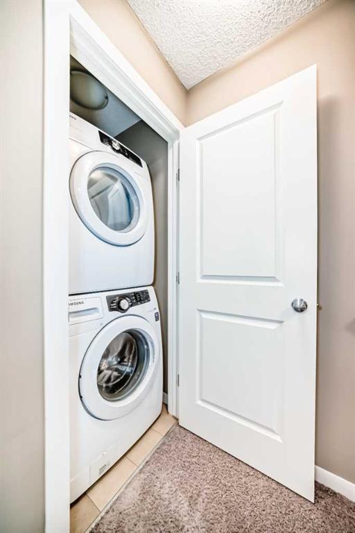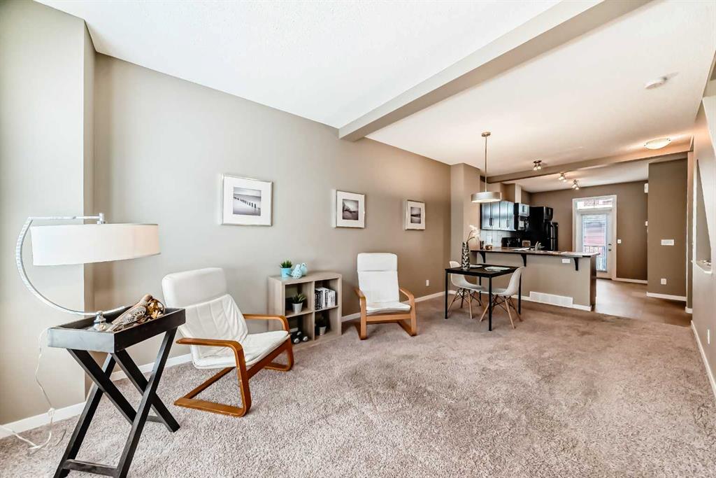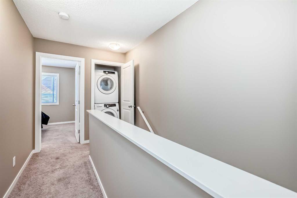 YOUR NEW HOME ... is located in one of Calgary's most sought after family friendly communities, this 2 storey townhome offers the perfect blend of style, comfort, and convenience. Steps from schools, playgrounds, daycare, and the New Brighton Athletic Park, future LRT, South Campus. You will also enjoy quick access to 130 ave shops, McKenzie Townes High Street and access to major routes like Stoney, Deerfoot trail and 52 st. Inside, oversized windows and tall ceilings fill the open concept layout with natural light. The kitchen features upgraded wood cabinetry, black appliances, a classic tile backsplash, and a large eating bar-ideal for both everyday living and entertaining. The main floor also includes a spacious dining area, inviting living room and convenient powder room. Upstairs, you'll find two large primary bedrooms, each with their own private ensuites and walk in closets - perfect for families, professionals or room mates. They are separated at each end of the hall, giving lots of privacy. Your laundry facilities are also on this floor, for the utmost of convenience. Additional highlights include a lower deck, an upper deck off of the kitchen with a gas hook up, a single attached garage and a second covered parking pad. The grounds are meticulously maintained and pride of ownership is exuded through the entire complex. Located in the middle of the complex and far away from 52st noise, the Low condo fees add to another reason to love living here, oh, and a new hot water tank was just installed.