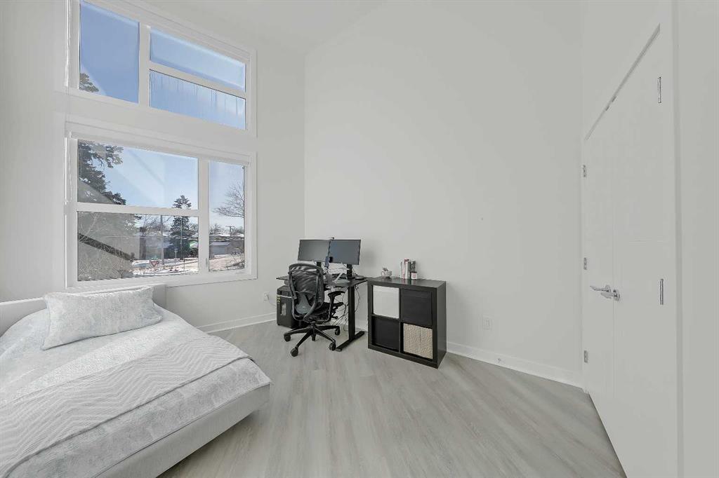 *VISIT MULTIMEDIA LINK FOR FULL DETAILS, INCLUDING IMMERSIVE 3D TOUR & FLOORPLANS!* Welcome to this rare end unit fronting green space. This highly upgraded Bordo townhome showcases over 2,300 sq ft (over 1,700 sq ft above grade), soaring ceilings, a private fenced yard, a fully developed basement, and a rare attached insulated garage. This home delivers the comfort and scale of a detached home with the ease of low-maintenance inner-city living. The bright main floor features 10-ft ceilings and expansive windows that fill the space with natural light. The contemporary, warm living room has a massive window overlooking the adjacent green space. It centres on a tiled feature wall with a gas fireplace and is enhanced by built-in ceiling speakers. The rear kitchen anchors the layout with a quartz waterfall island and counters, a sleek glass backsplash, stainless steel appliances including an induction cooktop, a dual-basin undermount stainless steel sink, a discreet hood fan, and ample high-end cabinetry. A powder room and a mudroom with direct access to the attached garage add everyday functionality. Upstairs, the primary suite impresses with 16.6-ft ceilings, oversized windows, a large walk-in closet, a bonus loft, and a spa-inspired 5-pc ensuite featuring heated tile floors, a dual-sink vanity with quartz and storage, a soaker tub with tile surround, and a fully tiled stand-up shower with 10mm glass door. A second bedroom with 14.5-ft ceilings, a full 4-pc bathroom, a versatile bonus room, and a convenient upper-floor laundry closet complete the upper floor. The fully developed basement features 9-ft ceilings, a spacious rec room, plus a third bedroom and a full bathroom—ideal for guests or for use as a home office. Mechanical upgrades include a high-efficiency furnace, humidifier, and HRV system. Enjoy a private fenced yard with a gas line for a BBQ, plus immediate access to the large green space outside the door. Located in the heart of Renfrew, just minutes to downtown, 16 Ave, Edmonton Trail, Deerfoot Trail, schools, parks, shopping, Calgary Zoo, and the Renfrew Aquatic Centre, this home offers outstanding inner-city convenience. Schedule a private showing today!