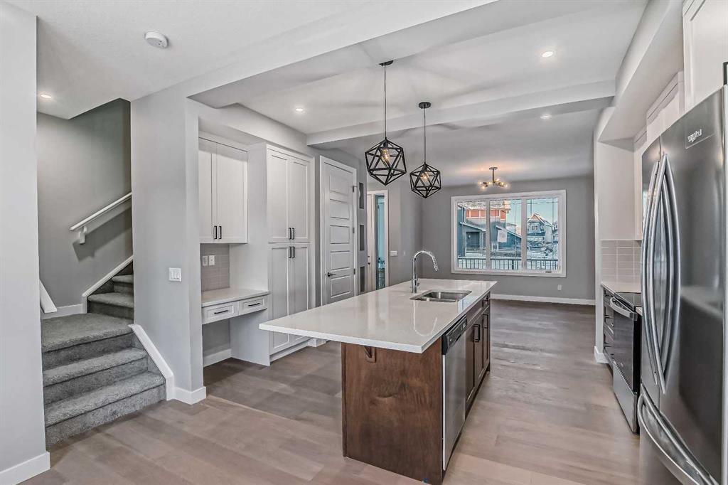 IMMEDIATE POSSESSION! BRAND NEW HOME by Douglas Homes, Master Builder in central Greystone, short walking distance to the Bow River, shopping & interconnected pathway system. Featuring the Melbourne with additional SIDE ENTRY. Located down the street from the community Kids Play Park on a sunny west facing backyard, great for entertaining. This gorgeous 3 bedroom, 2 & 1/2 half bath home offers over 1225 sq ft of living space. Loads of Designer/upgraded features in this beautiful, open floor plan. The main floor greets you with a grand glazed 8' front door, soaring 9' ceilings, oversized windows , & 8' 0" passage doors. Distinctive Engineered Hardwood floors flow through the Foyer, Hall, Great Room, Kitchen & Nook adding a feeling of warmth & style. The two sided Kitchen is completed with an oversized entertainment island (9'0" single level island) & breakfast bar, roomy cabinet pantry, Quartz Countertops, 42" Cabinet Uppers accented by decorative drywall bulkhead, Pots & Pans Drawers, soft close doors & drawers throughout, new stainless appliance package including Microwave/Hood Fan combo over the stove , smooth top electric Range, Fridge & built-in Dishwasher. The main floor is completed with an expansive, open Great Room with Napoleon "Entice" fireplace, spacious Nook finished with over height windows, rear entry with full French Door & transom above, closet & 1/2 bath . Upstairs you'll find a well sized Primary Bedroom with 3 piece Ensuite including separated Quartz vanity with undermounted sink & oversized 5'0" x 3'0" shower with tiled walls & ceramic tile flooring. There is also a generous sized walk-in closet accessed from the bedroom. There are two additional good sized bedrooms with roomy closets. The second floor is completed by a main bathroom with combination Tub/Shower with tiled walls, Quartz countertop with undermounted sink & in-vanity drawer all completed by ceramic tile flooring. You're certain to love the convenience of the 2nd Laundry for stacked washer/dryer also completed with tile flooring. This is a very popular plan, great for young families or for the sizing down crowd. Spacious, Beautiful and Elegant! The perfect place for your perfect home. Call today! Photos are from prior build & are reflective of fit, finish & included features. Note: Front elevation of home & interior photos are for illustration purposes only. Actual elevation style, interior colors/finishes, & upgrades may be different than shown & the Seller is under no obligation to provide them as such. Directions: Come to the Show Home first at 500 River Avenue. THIS HOME IS UNDER CONSTRUCTION