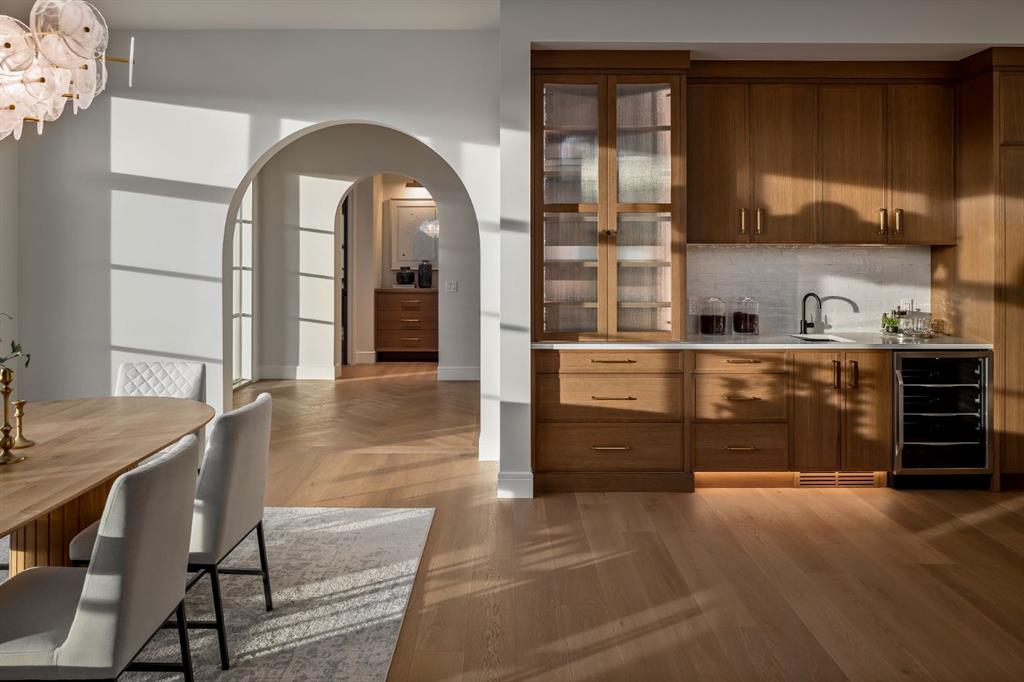 OPEN HOUSE Saturday March 21st 12-6PM & Sunday March 22nd 1-3PM! Homes on this exclusive ridge rarely come to market, and this breathtaking two-storey estate is a shining example of elevated inner-city living. With 5,545.89 sq.ft. of exquisitely developed space, this 6 bedroom, 5.5 bath residence blends refined craftsmanship with functional luxury; set against a backdrop of sweeping valley and park views. Step inside to soaring ceilings, pristine engineered hardwood floors, and custom archway details that frame each thoughtfully designed space. The heart of the home begins in the sunlit dining area, perfect for hosting epic dinner parties, and highlighted by west-facing triple-glazed LUX windows. The adjacent chef’s kitchen impresses with stainless steel integrated appliances, including a Wolf gas cooktop, double wall ovens, classic white shaker cabinetry, and a hidden butler’s pantry for discreet prep and storage. The expansive great room invites relaxation with vaulted ceilings and a cozy microcement faced gas fireplace, opening directly to a sunny south-facing deck overlooking endless green space. A main floor guest suite (or executive office) with a private ensuite, a designer powder room, and a spacious mudroom with built-ins complete this level. The fully insulated triple car garage is EV-ready and lift-kit friendly, marrying form and function. Upstairs, a serene primary retreat features elegant vaulted ceilings, a custom walk-in closet, and a spa-inspired 5-piece ensuite with a soaker tub, dual vanities, and a glass shower with bench and niche. Three additional bedrooms (one with an ensuite), an upper laundry room with sink and storage, and a charming library nook provide comfort and convenience for the entire family. The fully developed basement is an entertainer’s dream: featuring a large media lounge, games area, wet bar with brick backsplash and undermount lighting, and a high calibre wine room that secretly accesses the highly systemized maintenance room. A versatile home gym, sixth bedroom with walk-in closet, and additional full bathroom on this level ensure guests feel at home. Noteworthy highlights include: Hydronic in-floor heat in the basement; 2 High-Efficiency furnaces & A/C units; built-in speakers throughout; and quartz countertops in all bathrooms. Located minutes from the University of Calgary, Foothills Hospital, and local shops and restaurants, this timeless home sits in a top-tier school catchment and offers quick access to major routes while maintaining a tranquil, park-like setting. A truly unique opportunity to own a well-appointed, move-in ready home in one of the city’s most prestigious enclaves.