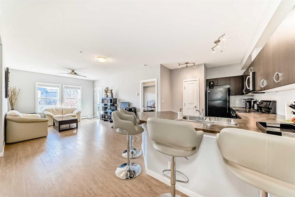 Welcome to this beautifully maintained 2-bedroom, 2-bathroom home offering comfort, style, and an ideal layout. Featuring a spacious open-concept floor plan, this inviting unit is perfect for both everyday living and entertaining. The bright living and dining areas flow seamlessly together, highlighted by large windows and access to a private west-facing balcony—perfect for enjoying afternoon sunshine and stunning sunsets. The thoughtfully designed kitchen with plenty of counter space opens to the main living space, creating a warm and connected atmosphere. The generous primary bedroom includes a private ensuite bathroom and walk-through closet, providing a peaceful retreat at the end of the day. A second well-sized bedroom and full bath offer flexibility for guests, family, or a home office. In-unit laundry adds everyday convenience, while the open and functional layout enhances the sense of space and flow throughout. Meticulously cared for and move-in ready, this bright and stylish condo showcases true pride of ownership located in ideal Cranston, one of the premier communities in Calgary. Close to 3 schools, parks and playgrounds, shopping, restaurants, and great access to Stoney Trail and Deerfoot Trail for easy commutes.