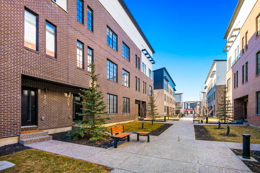 Welcome to District Townhomes in West Springs, where modern luxury meets everyday convenience in one of Calgary’s most desirable Westside communities. Built by Truman Homes, this stylish 3-storey, 3-bedroom, 2.5-bathroom townhome is thoughtfully designed for today’s lifestyle—clean lines, smart function, premium LVP flooring, roller-shade window coverings throughout and elevated finishes throughout. The entry level offers a flexible den/home office, plus a utility area, extra storage, and direct access to the attached double garage—perfect for commuting, working from home, or keeping life organized. Upstairs, the bright and airy main living level impresses with 9-foot ceilings, wide-plank luxury vinyl flooring, and an open-concept layout made for entertaining. The chef-inspired kitchen is the centerpiece, featuring full-height cabinetry with soft-close doors, quartz countertops, elegant gold accents, a gas range, built-in refrigerator, built-in microwave, and a massive quartz island with generous seating for casual meals or hosting friends. Step outside to your large private deck—ideal for morning coffee, summer BBQs, or unwinding at the end of the day. The upper level features three well-planned bedrooms, including a standout primary retreat with a walk-in closet and a private 4-piece ensuite with dual vanities. You’ll also love the convenience of upper-floor laundry right where you need it. Perfectly located just minutes to West 85th, Radio-Park, Aspen Landing, top-rated schools, playgrounds, boutique fitness, grocery stores, cafés, and some of Calgary’s best dining—plus quick access to Stoney Trail and Bow Trail for an easy downtown commute or a fast escape to the mountains. A move-in ready West Springs townhome with high-end finishes, a double garage, and a prime location—this is the one you’ve been waiting for. **Some images have been virtually/digitally staged to illustrate possible furnishings and layout.