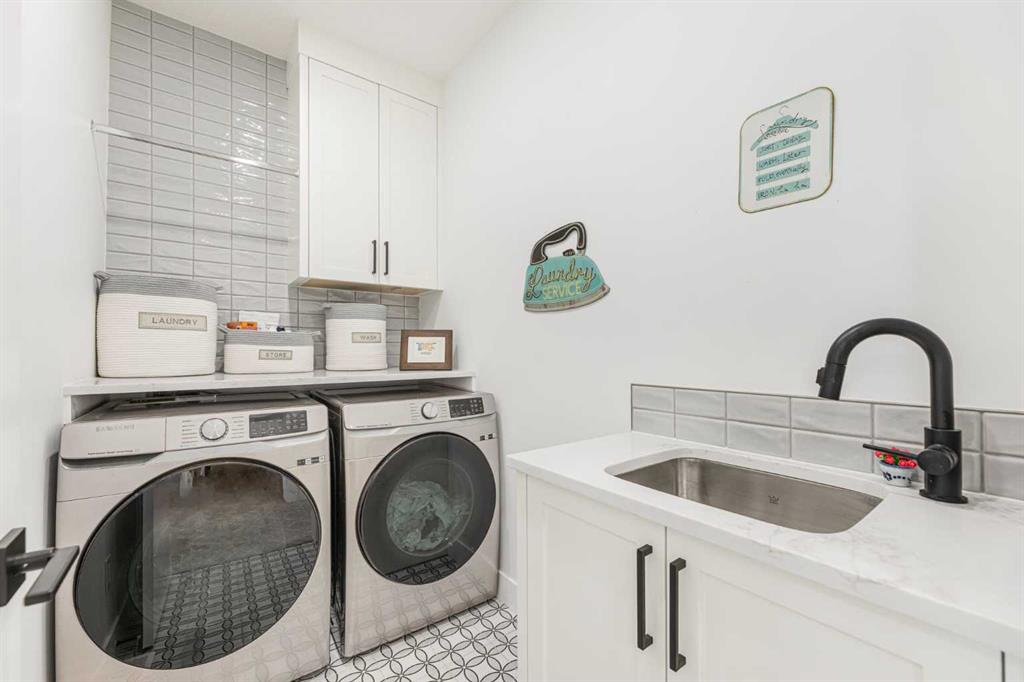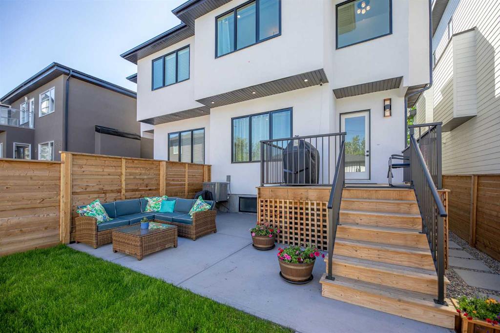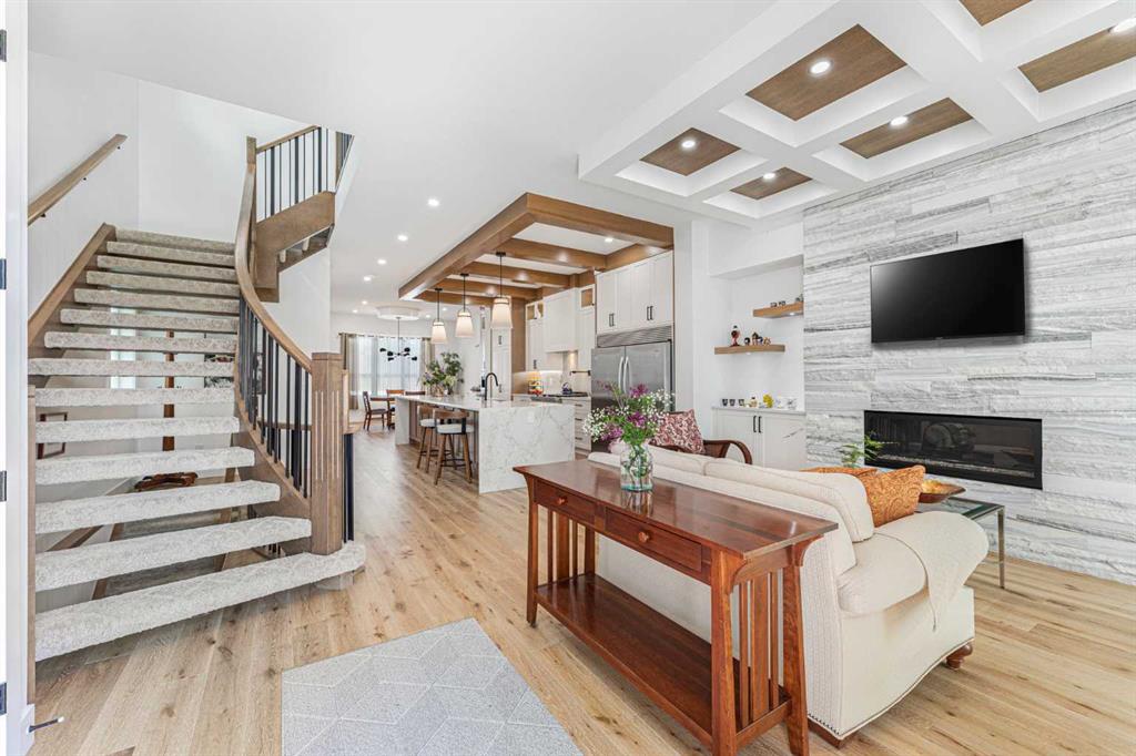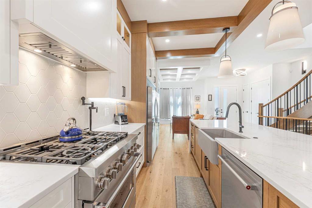 Welcome to this beautifully designed home on a quiet street in the sought after community of Killarney. Offering over 2,800 sq. ft. of luxurious living space, this air-conditioned 4 bedroom, 3.5 bathroom residence showcases exceptional craftsmanship and timeless style. The bright main floor features coffered ceilings, rich hardwood floors, a dramatic curved staircase, and a custom stone fireplace. The chef-inspired kitchen is equipped with full height cabinetry, quartz countertops, premium stainless steel appliances including a commercial-style gas range, a built-in coffee maker, farmhouse sink, and an impressive 12-foot island. The dining area offers seamless access to a landscaped backyard with deck and patio perfect for entertaining. Upstairs, the primary suite offers a walk-in closet and a spa like 5-piece ensuite with heated floors, soaker tub, steam shower, and dual vanities. Two additional bedrooms, a full bath, and convenient laundry complete the level. The fully finished basement features in-floor heating, a spacious family room with wet bar, fourth bedroom, and another full bathroom. Enjoy a heated double detached garage and easy access to parks, schools, the Killarney Aquatic & Recreation Centre, and downtown Calgary. Exceptional inner-city living awaits.