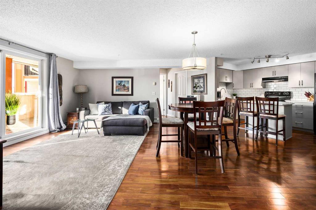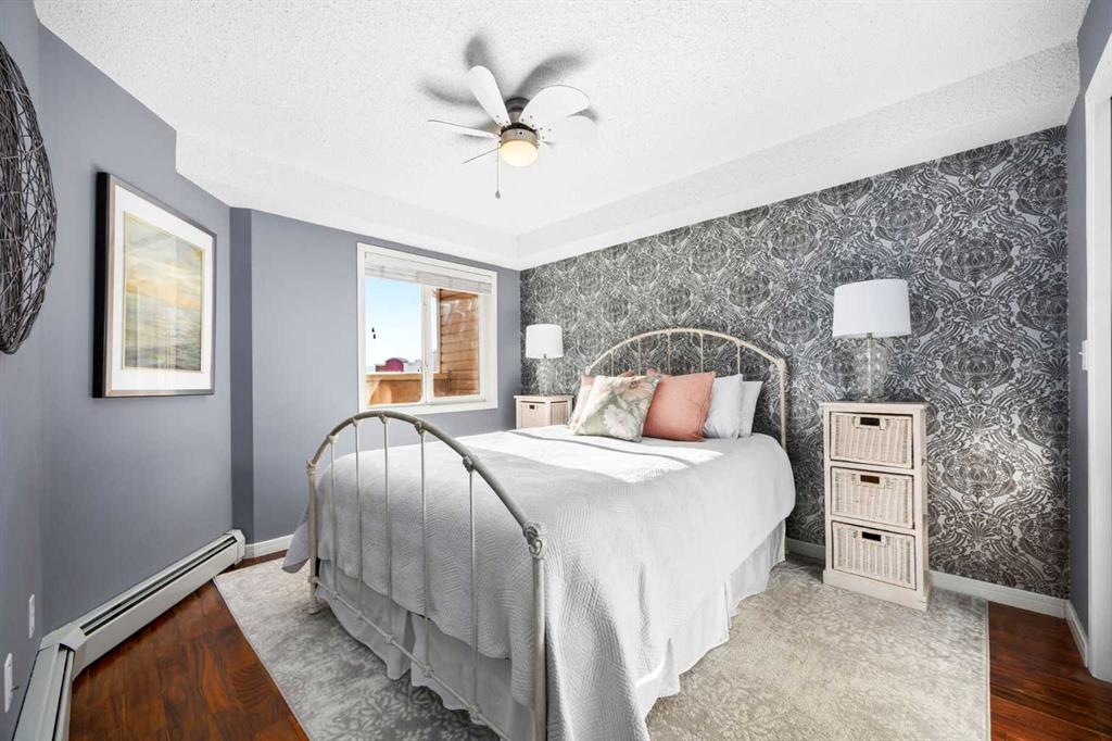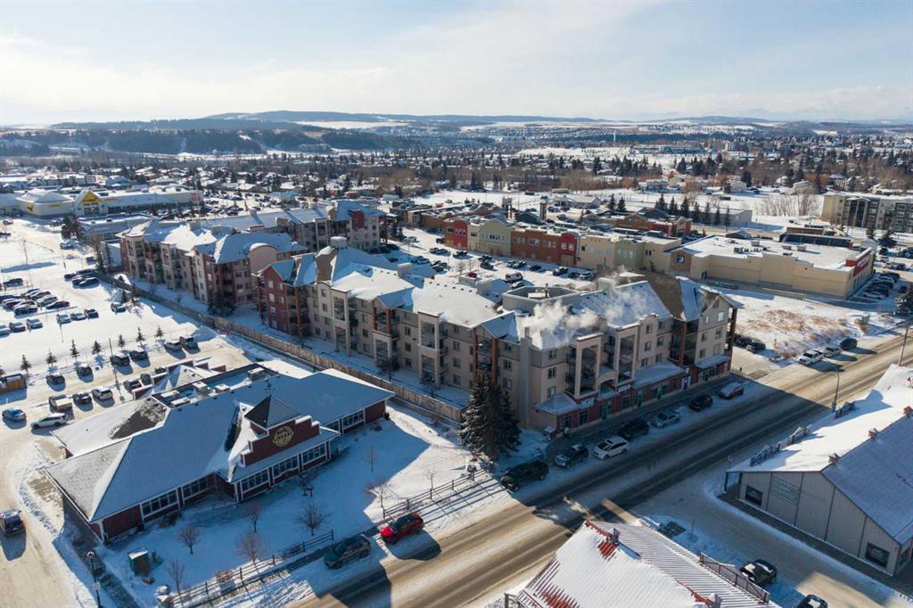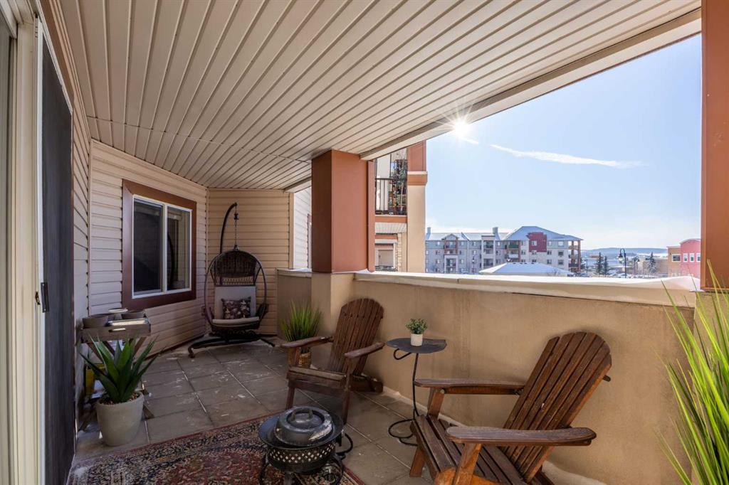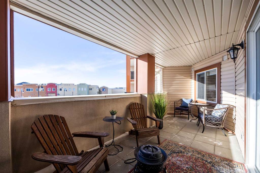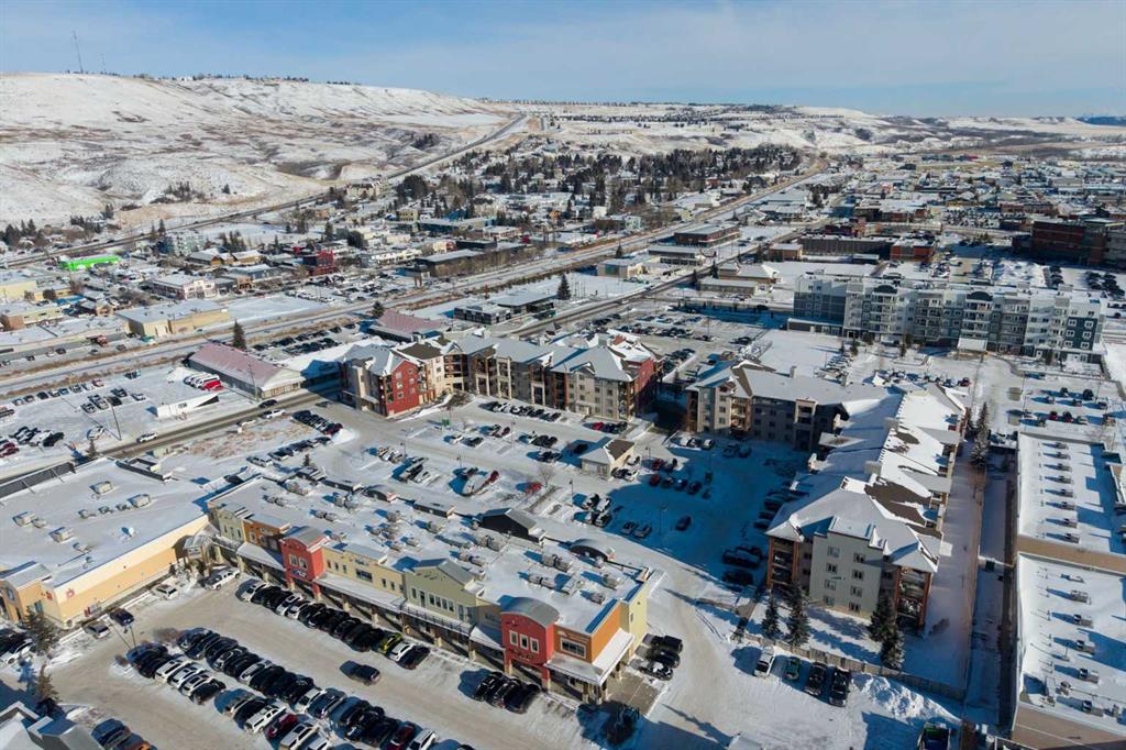 Welcome to one of the largest and most desirable units in this centrally located downtown Cochrane complex! This beautifully maintained 2 bedroom, 2 bathroom condo offers an exceptional open concept layout with stunning hardwood flooring and a bright, functional living space perfect for both everyday living and entertaining. The updated kitchen features quartz countertops, modern finishes, and a brand new dishwasher, flowing seamlessly into the spacious dining and living areas. Step outside to your massive 172 sq/ft balcony, an incredible extension of your living space and the perfect spot to relax, BBQ, or enjoy the views. The primary suite includes a renovated ensuite, while the second bedroom and bathroom have also been tastefully updated. You’ll love the oversized in-suite laundry room with newer washer and dryer and an abundance of storage. This unit comes with rare and valuable extras including titled underground parking, titled underground storage, PLUS an assigned above-ground parking stall with plug, ideal for Alberta winters. Additional upgrades include new water shut-offs for added peace of mind. All of this in a prime downtown Cochrane location, just steps to shopping, restaurants, pathways, and amenities. Spacious, updated, and incredibly well appointed, this is condo living at its best.