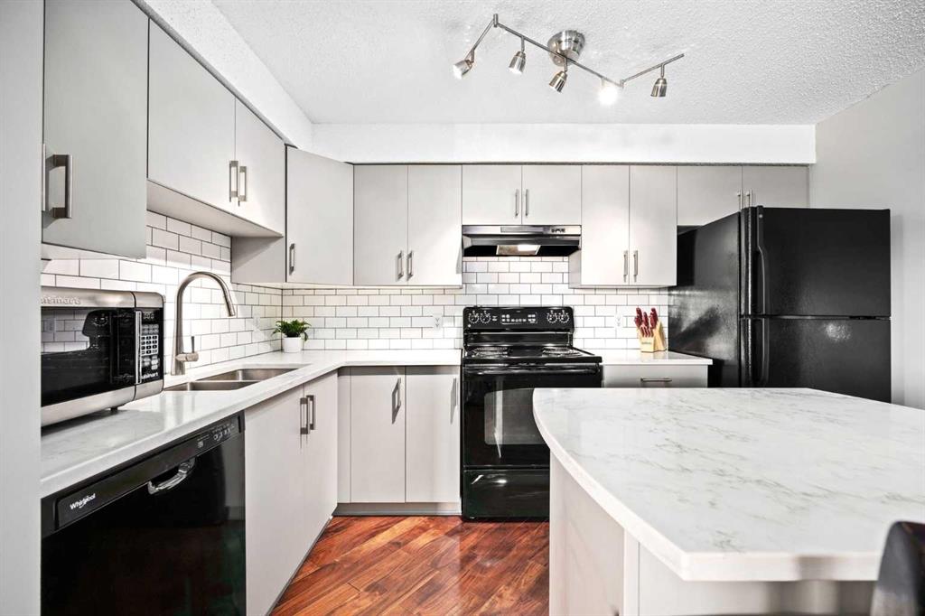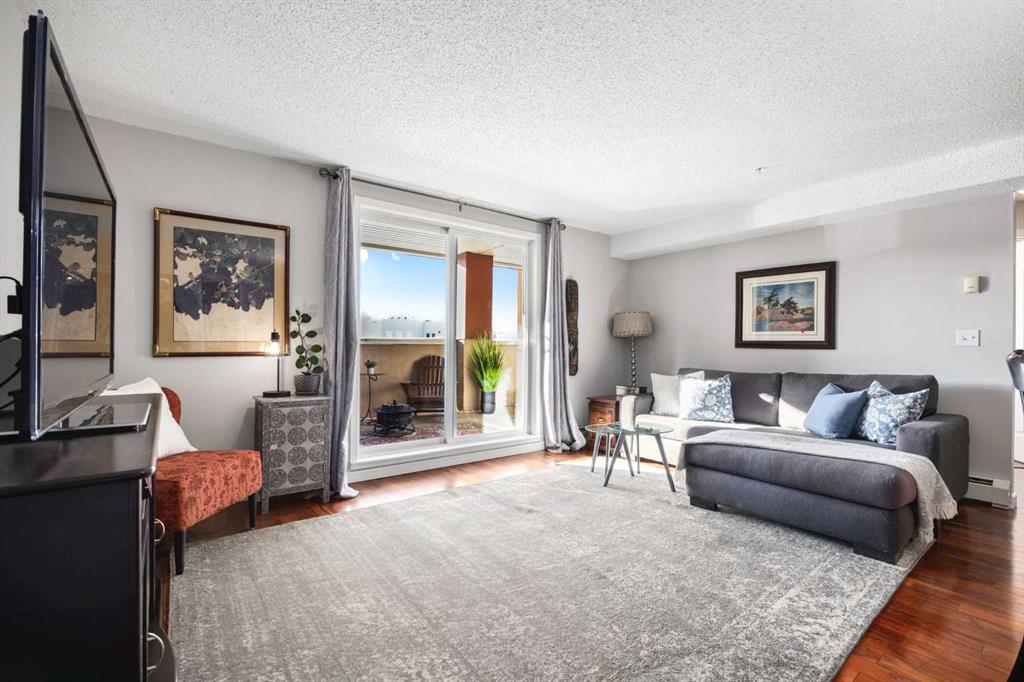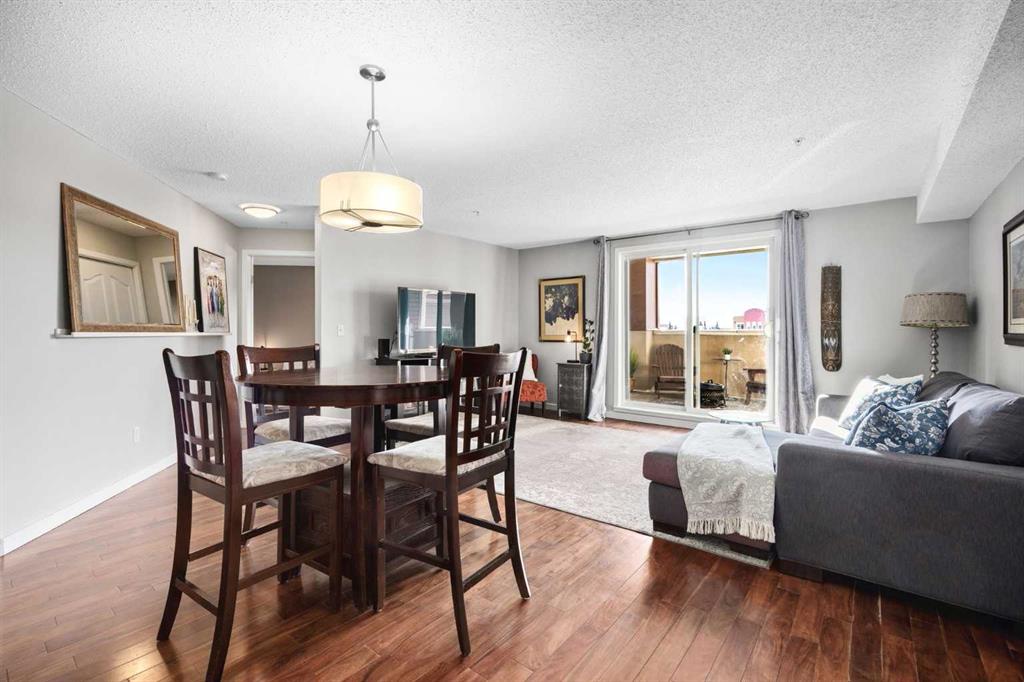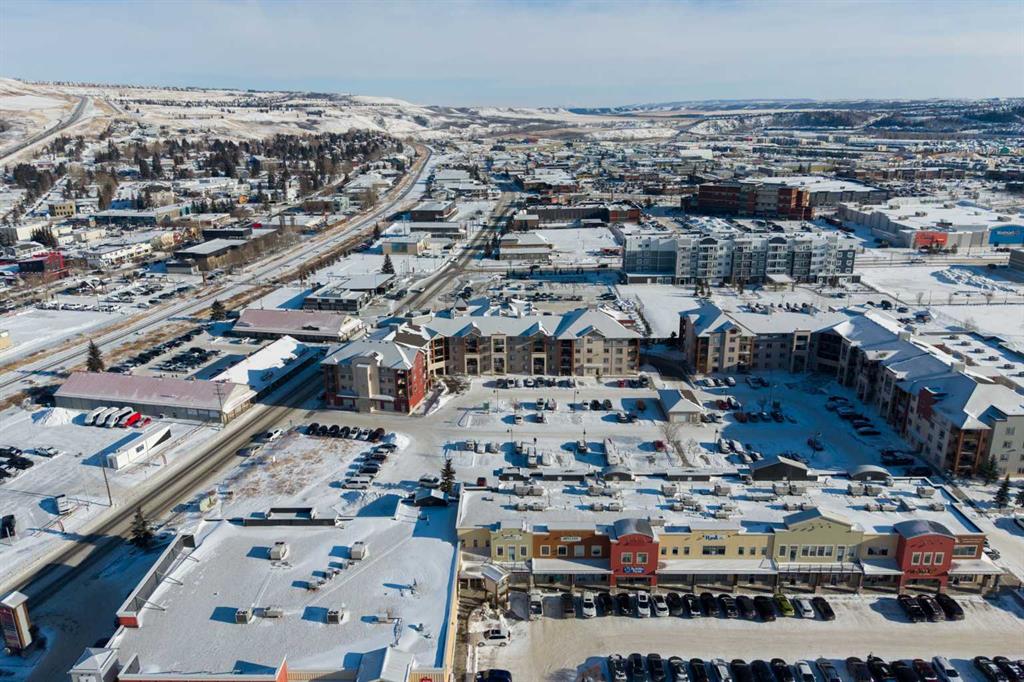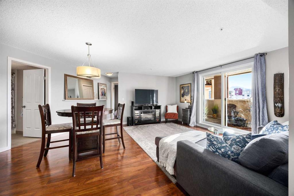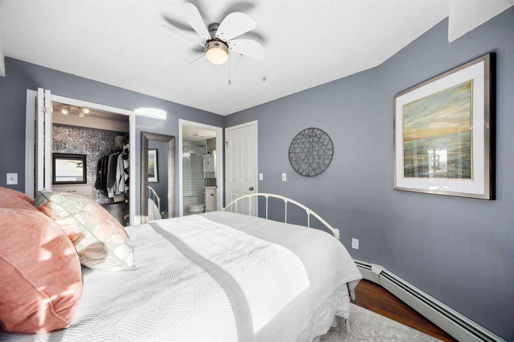 Welcome to one of the largest and most desirable units in this centrally located downtown Cochrane complex! This beautifully maintained 2 bedroom, 2 bathroom condo offers an exceptional open concept layout with stunning hardwood flooring and a bright, functional living space perfect for both everyday living and entertaining. The updated kitchen features quartz countertops, modern finishes, and a brand new dishwasher, flowing seamlessly into the spacious dining and living areas. Step outside to your massive 172 sq/ft balcony, an incredible extension of your living space and the perfect spot to relax, BBQ, or enjoy the views. The primary suite includes a renovated ensuite, while the second bedroom and bathroom have also been tastefully updated. You’ll love the oversized in-suite laundry room with newer washer and dryer and an abundance of storage. This unit comes with rare and valuable extras including titled underground parking, titled underground storage, PLUS an assigned above-ground parking stall with plug, ideal for Alberta winters. Additional upgrades include new water shut-offs for added peace of mind. All of this in a prime downtown Cochrane location, just steps to shopping, restaurants, pathways, and amenities. Spacious, updated, and incredibly well appointed, this is condo living at its best.