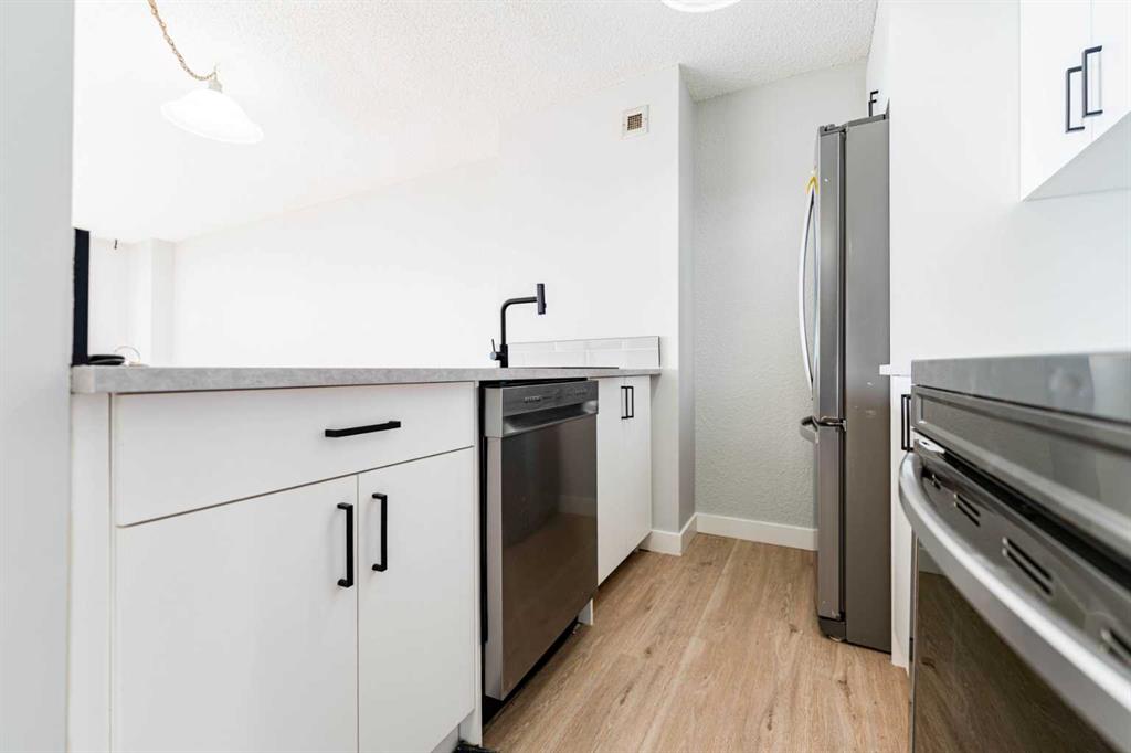 This beautifully updated 1-bedroom, 1-bath condo combines modern finishes with the ease of downtown living. Offering well-planned space, the open and airy layout is enhanced by fresh neutral paint throughout. The recently renovated kitchen features sleek contemporary cabinetry and quality appliances, creating a bright and inviting space. Newly added Luxury vinyl plank flooring runs throughout the home, providing both style and durability. Step out onto the oversized balcony and take in stunning downtown views—perfect for unwinding or entertaining guests. Residents enjoy an impressive selection of building amenities, including a fitness centre with sauna, racquetball court, and a rooftop terrace showcasing the city skyline. Additional conveniences include an on-site caretaker and laundry facilities. The condo includes one assigned underground parking stall and is located in a well-maintained building that offers comfort, lifestyle, and unbeatable downtown convenience—an ideal opportunity for urban living.