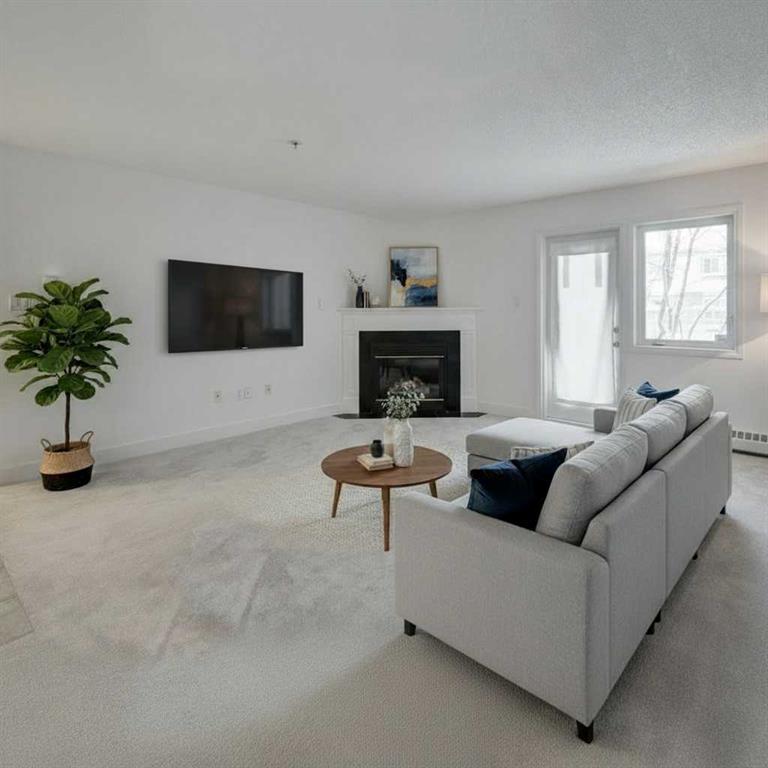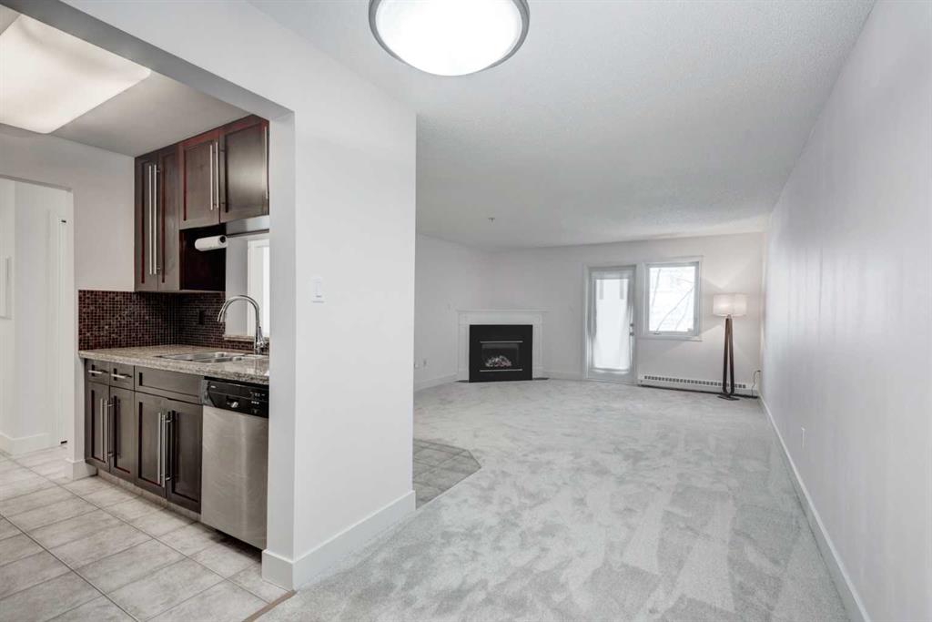Welcome to this spacious and well-appointed main floor one-bedroom condo at 117-790 Kingsmere Crescent SW in the desirable Kingsland community. Offering comfort, convenience, and modern finishes, this pet-friendly building (1 dog or 1 cat - board approval) is perfect for first-time buyers, professionals, or investors. The open and functional layout features a large living room highlighted by a cozy corner gas fireplace, creating a warm and inviting space to relax or entertain. The kitchen is thoughtfully designed with granite countertops, rich dark wood cabinetry, and sleek stainless-steel appliances. A dedicated dining area sits just off the kitchen, ideal for everyday living or hosting guests. Step outside to your large private balcony, perfect for enjoying morning coffee or summer evenings. This home is move in ready, every room has been revitalized with a clean coat of paint and brand-new, soft carpeting underfoot. Complete with a newly installed washer and dryer, this home offers the ultimate in comfort and convenience. If you are a dog lover you will enjoy the close proximity to the front entrance, making walks a breeze. This home includes titled underground parking and a separate titled storage unit, providing exceptional value and practicality. Located just minutes from Chinook Centre, the restaurants and amenities along MacLeod Trail, and C-Train access, this condo offers unbeatable connectivity while still tucked away in a quiet, well-managed complex.