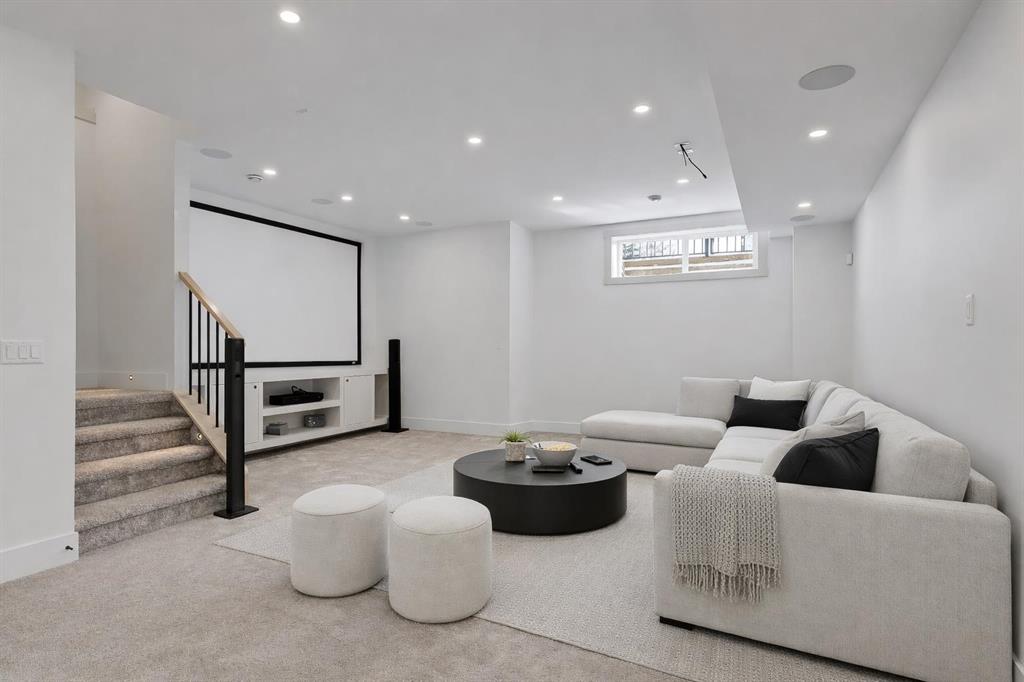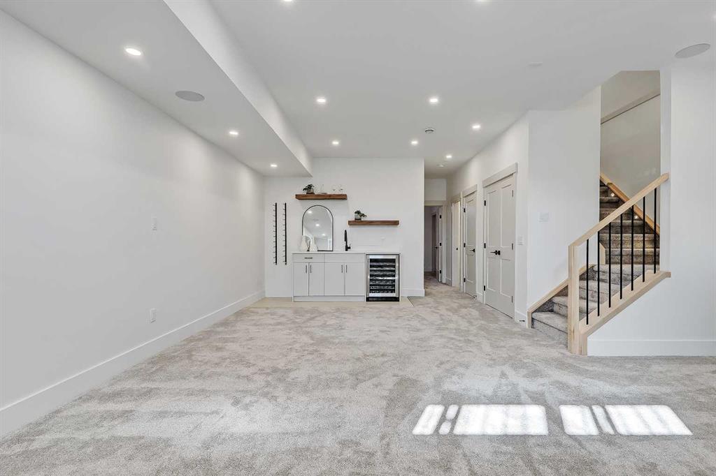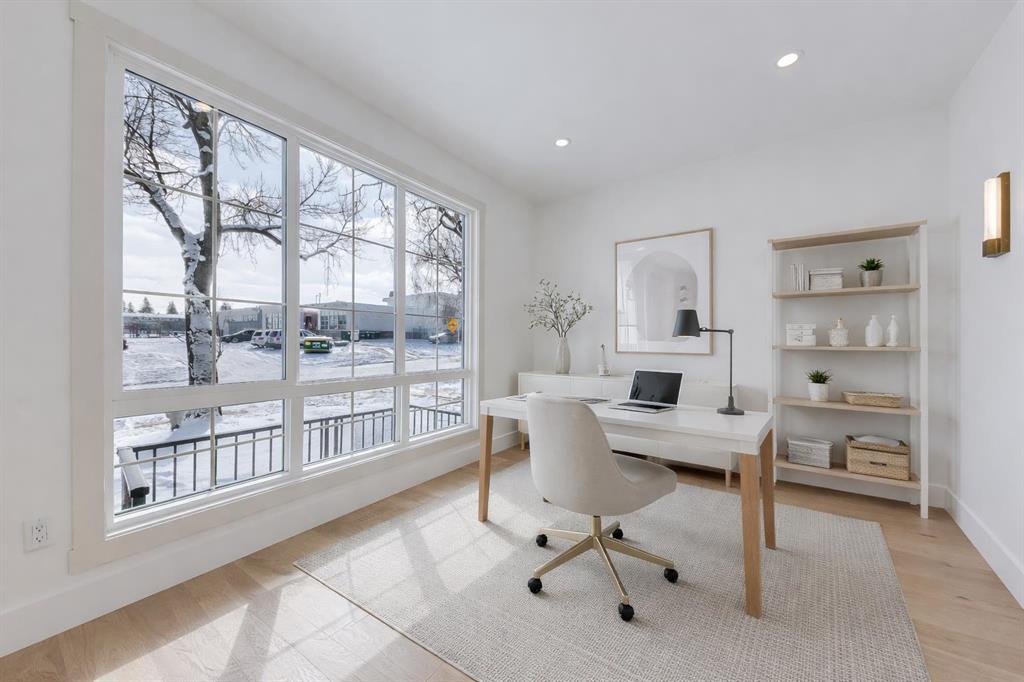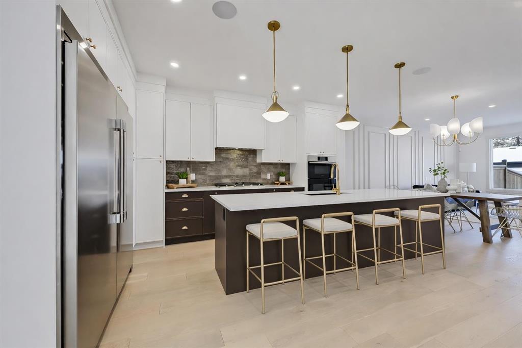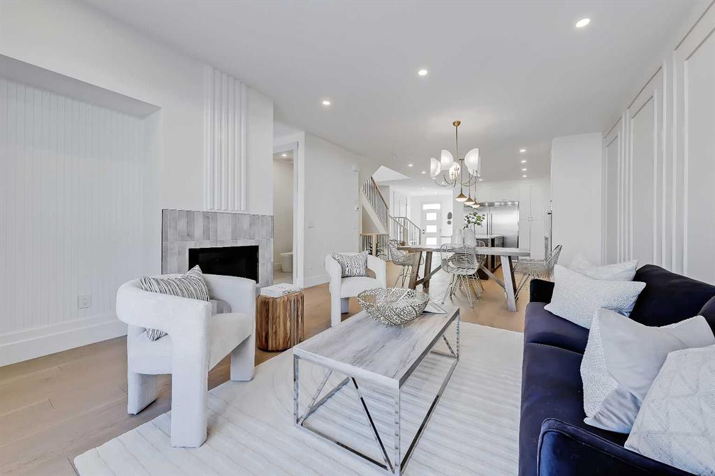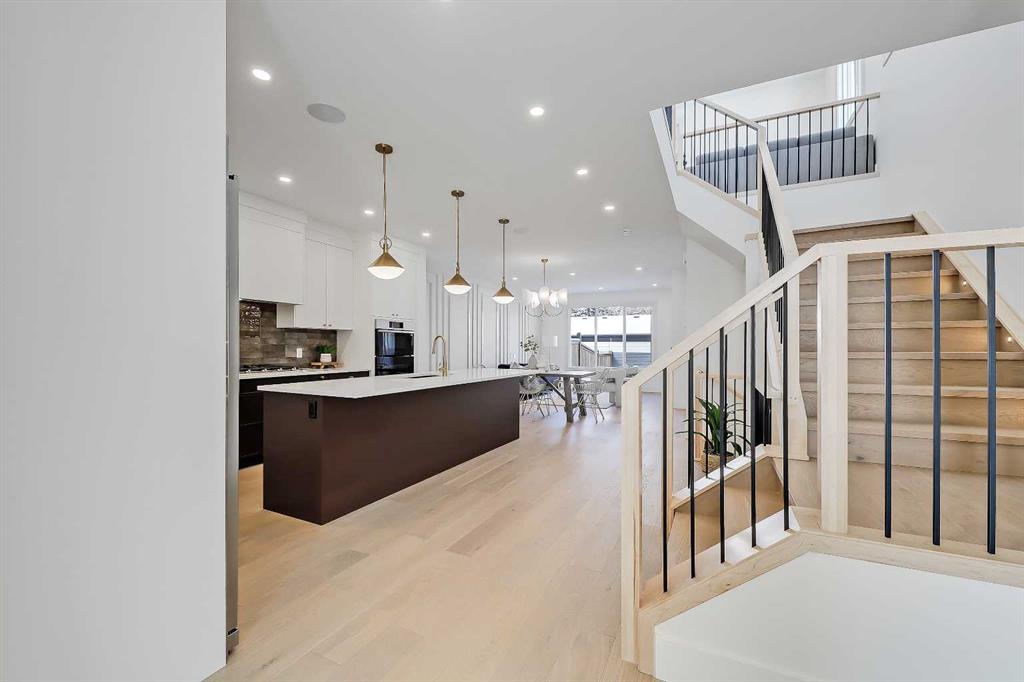 This beautifully designed semi-detached Valencia Residential home blends modern design with thoughtful functionality across three levels. From the moment you walk in, the clean lines, wide plank hardwood flooring, and designer lighting create a bright and welcoming atmosphere that carries throughout the entire home. Found in the desirable KILLARNEY, your close to parks, schools, playgrounds, and everyday amenities. The light-filled foyer opens to a versatile office space with tasteful lighting selections, perfect for working from home or creating a quiet reading area. As you move inside, the layout is bright and open, complete with curated finishes and beautiful lighting selections. The kitchen includes a large island which offers plenty of room for gathering. Quartz countertops, full height cabinetry, designer backsplash, and sleek gold hardware bring a refined look. High-end appliances and smart storage make the kitchen as practical as it is stylish. Large rear windows fill the space with light connecting the indoors to the outdoors. The dining area and living room have lovely architectural wall details as seen throughout the home. The living room also includes a gas fireplace, adding comfort to the space along with sleek tiles. At the back of the home, you will find the mudroom with bench seating and more stunning wall details. A conveniently placed power room with designer lighting finishes off this level. Upstairs, the homes bright and airy pallet carries through. At the top of the stairs, a cozy loft space can be turned into a workspace or additional living area. This floor includes three well sized bedrooms all with plenty of natural light, as well as a beautifully finished main bathroom. The primary suite is well-equipped and full of charm, with a walk-in closet and a spa inspired ensuite featuring a freestanding tub, tiled shower, and elegant selections throughout. You will also find a spacious laundry room right where it should be. The fully finished basement adds so much to the home. A large family room is designed as an entertainment hub with a built-in media wall & screen creating the perfect setting for movie or game nights. A stylish wet bar with wine display makes hosting easy. This level also includes two more bedrooms & a full bathroom, making it ideal for guests or growing families. Outside, the property includes a detached double garage and outdoor space ready for summer gatherings. Located in a desirable SW Calgary KILLARNY, nearby popular shopping & dining areas like MARDA LOOP are just minutes away, offering boutique shops, cafés, and restaurants. Families will appreciate being close to excellent local schools including RICHMOND SCHOOL and ALEXANDER FERGUSON SCHOOL, both offering strong programs and convenient access for daily routines. With quick access to major routes, downtown commuting is easy while still enjoying the charm of a quiet residential community. This is modern inner-city living designed for comfort, style, and convenience.