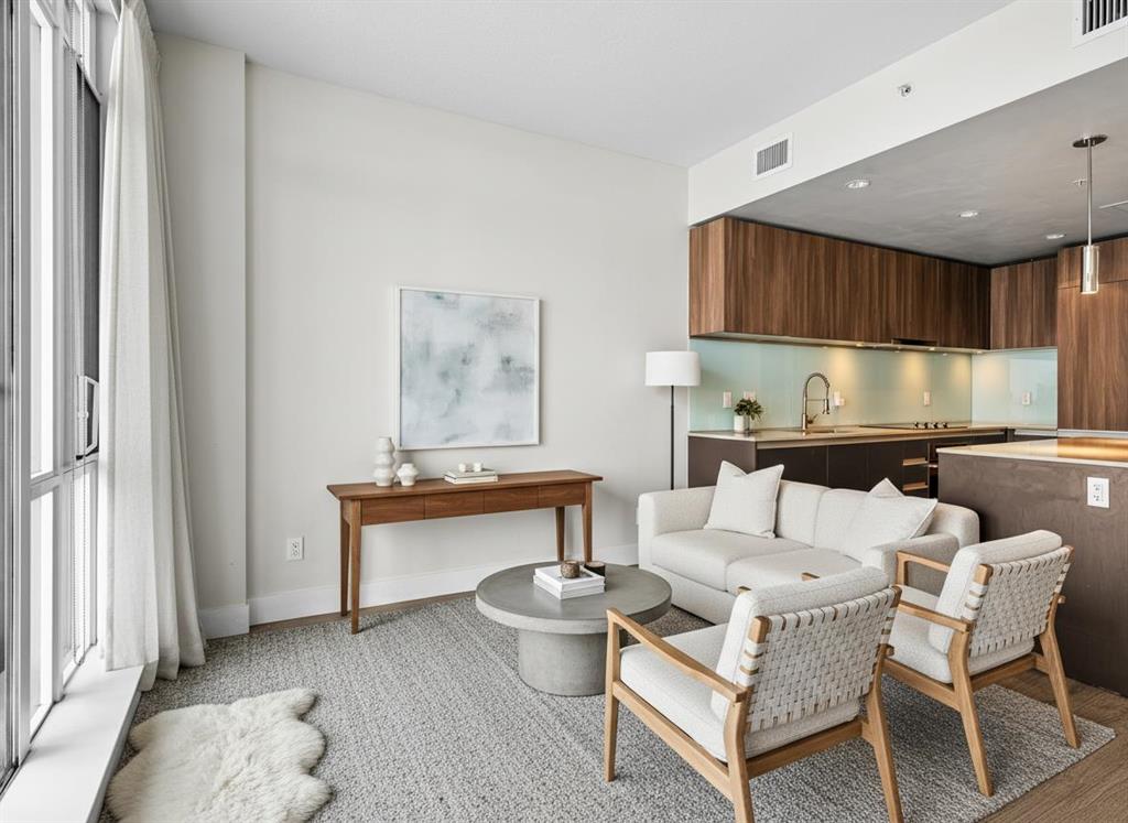 /// BEST PRICED 1 BEDROOM UNIT IN THE GUARDIAN \\\ Beautifully finished and flooded with natural light, this executive 1-bedroom condo offers refined urban living in the heart of Calgary’s ever-evolving Culture & Entertainment District. Perfectly positioned just minutes from the Bow River pathways, Stampede Grounds, Scotiabank Saddledome, the state-of-the-art BMO Convention Centre, the upcoming entertainment district, C-Train access, and some of the city’s best restaurants and nightlife. Inside, the open-concept layout is enhanced by light oak hardwood flooring and a stunning L-shaped, European-inspired kitchen. Featuring sleek Italian cabinetry, quartz countertops, a contemporary glass backsplash, stainless steel appliances, and a thoughtfully integrated center island with hidden microwave and added storage, the space is as functional as it is stylish—ideal for both everyday living and entertaining. The living room is a true retreat, highlighted by floor-to-ceiling, wall-to-wall windows that showcase sweeping views of Scotsman Hill and the Bow River Valley. Natural light pours in, creating an airy feel that exceeds the unit’s footprint. A sliding glass door opens to the oversized balcony, perfect for morning coffee at sunrise or shaded summer evenings with friends, offering seamless indoor-outdoor living. The private bedroom features a generous walk-in closet with custom organizers. Additional highlights include updated modern lighting and plumbing fixtures, a stylish 4-piece bathroom, and a spacious laundry room with stacked washer and dryer, plus extra storage and hanging space. A large, separate storage locker (approximately 3’ x 6’ x 7’) is included. Parking is available for rent at $150 + GST per month, with multiple rental opportunities typically advertised by owners within the building. The Guardian is a fully air-conditioned, professionally managed tower offering daily concierge service and unbeatable access to downtown amenities, including East Village, Eau Claire, shopping, cafés, and entertainment. With condo fees of just $365/month, this is an outstanding opportunity to invest in one of Calgary’s most exciting and rapidly growing neighborhoods—or to stop renting and step into homeownership in a premier building. Book your private showing today