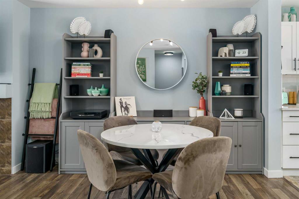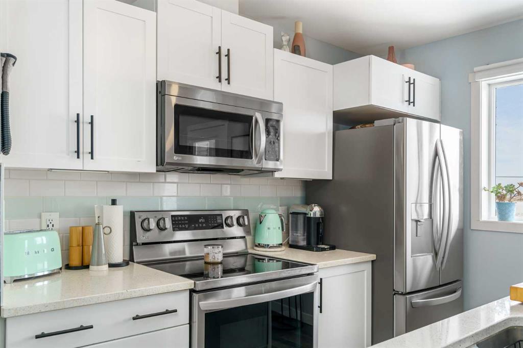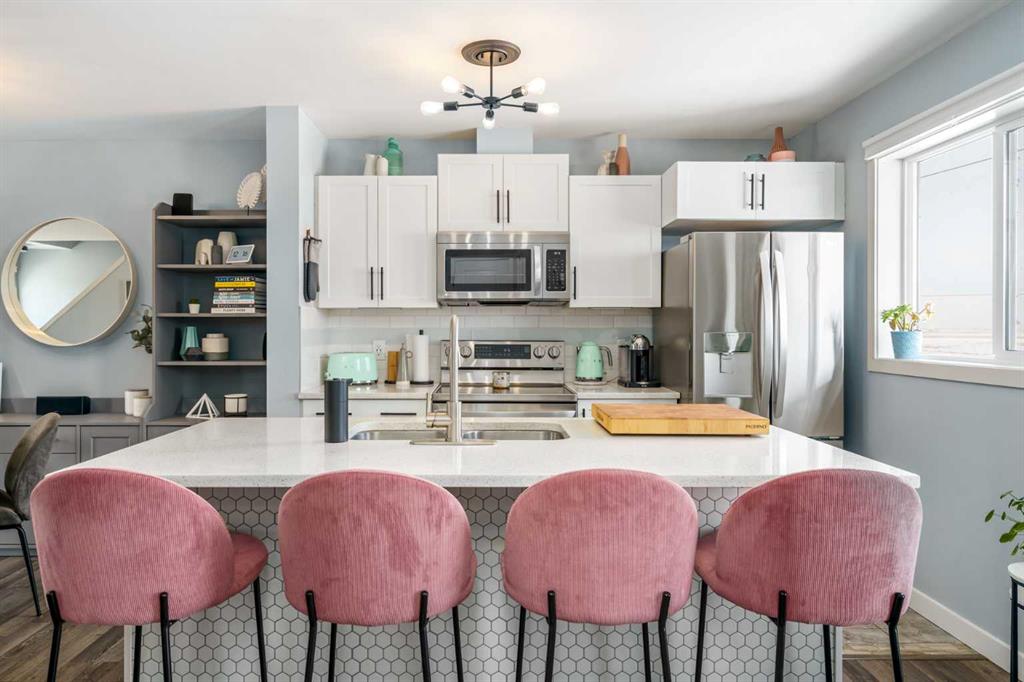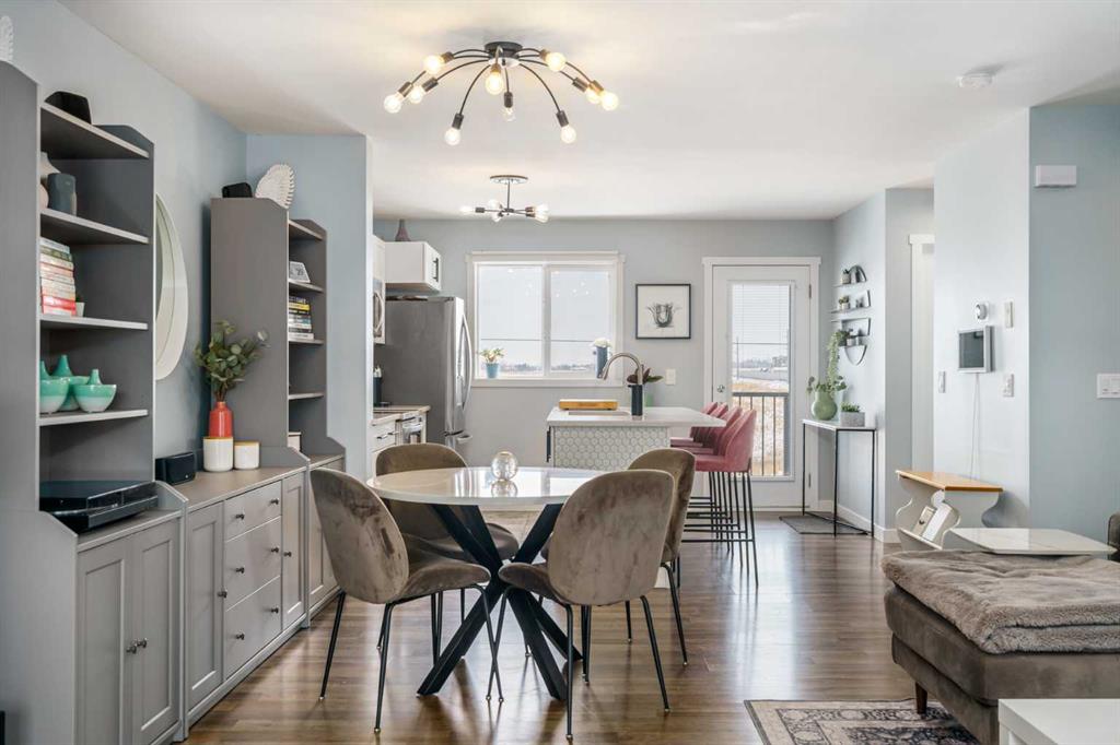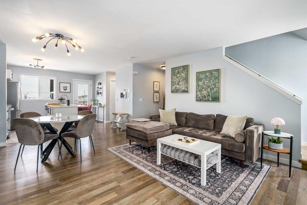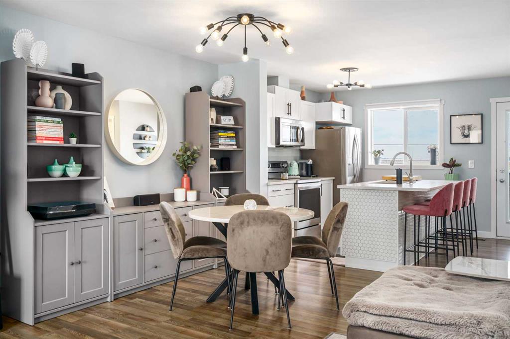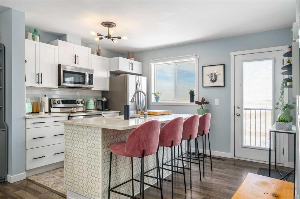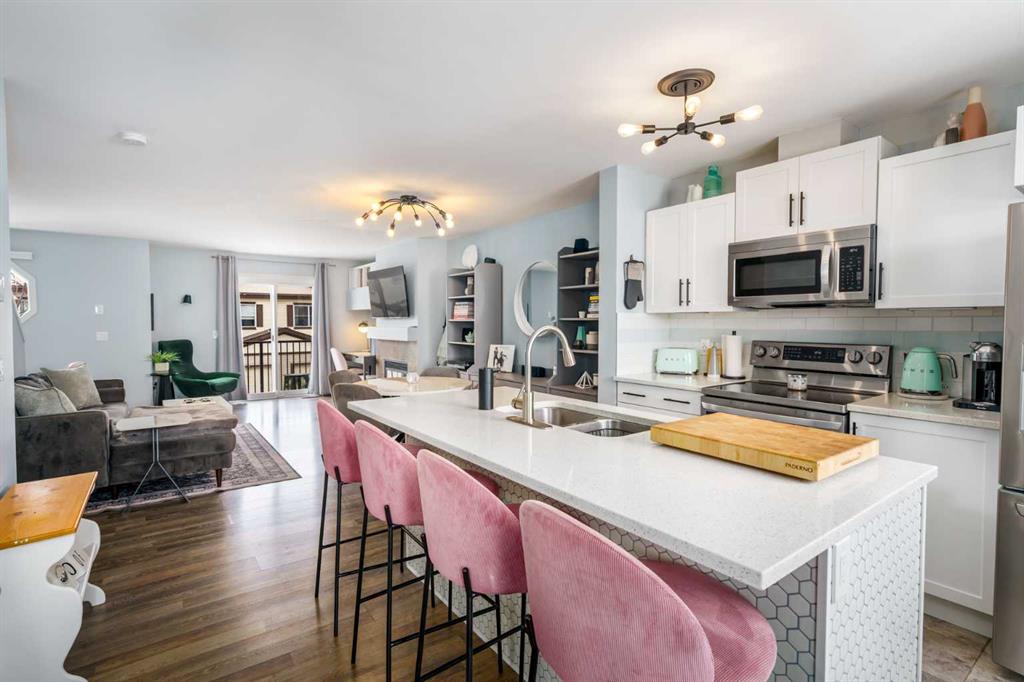 Welcome to Aura in Copperfield, a beautifully finished 3-storey townhome that pairs an elevated interior with a premium backdrop of open green space and wetlands behind. From the moment you arrive, the layout just works for real life. The entry level offers a single attached garage and a bright flex/office space that’s perfect for a home workspace, Peloton room, play area, or a cozy TV den, plus it walks out to a lower patio, making summer evenings and weekend lounging feel effortless. Upstairs, the main floor is where everyone naturally gathers, finished with laminate flooring throughout and an airy, light-filled feel. For added comfort through Calgary’s warmer months, the home is also equipped with central air conditioning. The rear kitchen is crisp and contemporary with white cabinetry, quartz countertops, and a generous island wrapped in a standout hexagon tile detail, the kind of finish that instantly feels more custom. Add tile flooring, newer stainless appliances, and thoughtful storage (including two closets by the kitchen that easily function as a pantry and broom/utility closet), and you’ve got a space that’s as practical as it is stylish. The dining area sits right in the center of the floor plan—anchored by a modern light fixture, making it ideal for everything from casual weeknight dinners to hosting friends, and yes, it sets up perfectly for those holiday meals where everyone ends up lingering at the table. At the front of the home, the living room is impressively sized and inviting, featuring a central fireplace with a tile surround and access to a second deck, great for catching the sun, sipping coffee, or creating a little outdoor lounge zone separate from the kitchen deck. On the top floor you’ll find three bedrooms, including a spacious primary retreat with a walk-in closet and 4-piece ensuite, plus two additional bedrooms at the back with large windows and another 4-piece bath conveniently placed just outside their doors. Set within a well-established southeast Calgary community known for its parks, ponds, and interconnected pathways, Copperfield offers a lifestyle that’s easy to love—whether it’s evening walks, bike rides, playground time, or meeting neighbours at local green spaces. Residents also enjoy access to the Copperfield Community Association amenities and programming, including community gathering spaces and seasonal features like outdoor recreation. And when it’s time to get around the city, you’re well-positioned with convenient access to major routes like Stoney Trail and Deerfoot Trail, plus everyday shopping and services nearby.