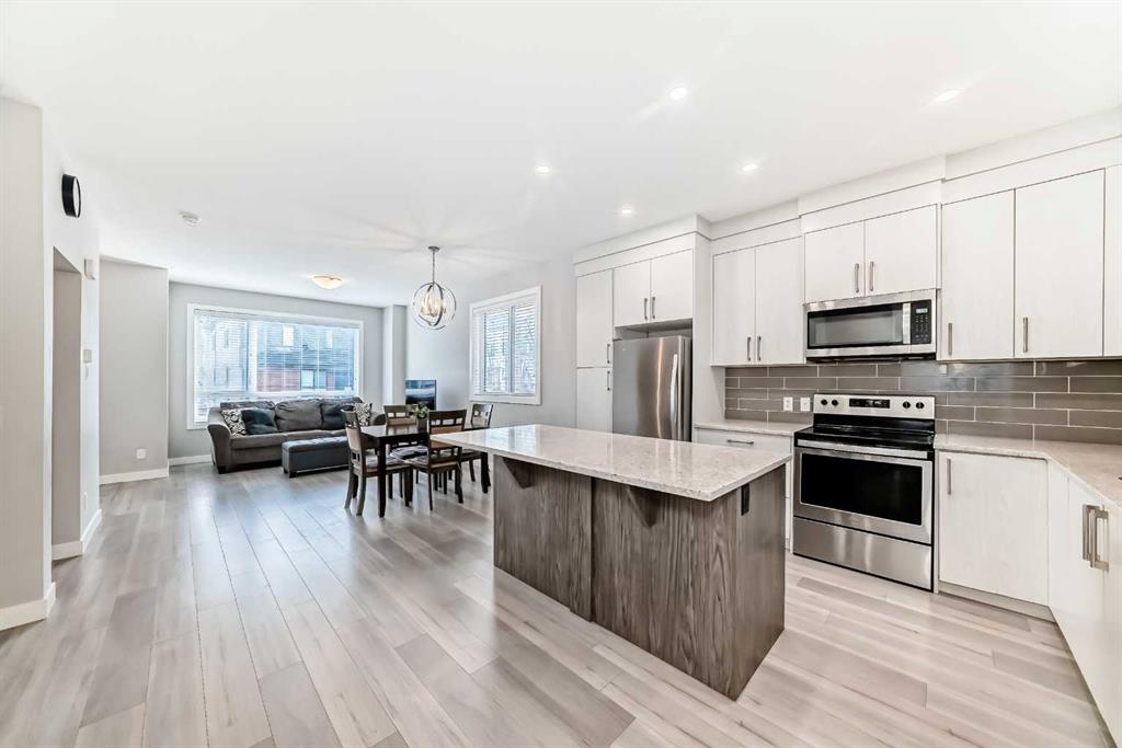 Welcome to one of Calgary’s most sought-after communities, Redstone, where convenience, connectivity, and community come together. This beautifully maintained end-unit, fully finished four-bedroom townhome offers over 1,750 sq. ft. of professionally developed living space and an abundance of natural light thanks to its desirable end-unit placement. Designed with both comfort and functionality in mind, the open-concept main floor provides a versatile layout where the living and dining areas can be arranged to suit your lifestyle. The modern kitchen is a true highlight, featuring quartz countertops, sleek appliances, a spacious center island, and an impressive amount of cabinetry, offering generous storage and prep space for everyday living and entertaining. The clean, contemporary white interior enhances the bright and airy feel of the home. A convenient two-piece powder room on the main level adds practicality for guests. Upstairs, a generously sized primary bedroom serves as a private retreat complete with a walk-in closet and a full four-piece ensuite bathroom. Two additional spacious bedrooms and another four-piece bathroom provide comfortable accommodations for family members or guests. The professionally builder-finished basement extends your living space even further, offering a large recreation or family room, a fourth bedroom, a third four-piece bathroom, and ample storage throughout—ideal for growing families, multi-generational living, or a dedicated home office or gym setup. Additional value includes a newly replaced roof (November 2025) for added peace of mind. Surrounded by restaurants, grocery stores, playgrounds, and everyday amenities, this vibrant neighborhood also features over 3.5 km of scenic walking paths that connect residents to the outdoors and to each other. With close proximity to public transit and quick access to major roadways, commuting in and around Calgary is seamless. Combining space, functionality, and an unbeatable location, this move-in-ready home presents an exceptional opportunity in Redstone. Book your private showing today.