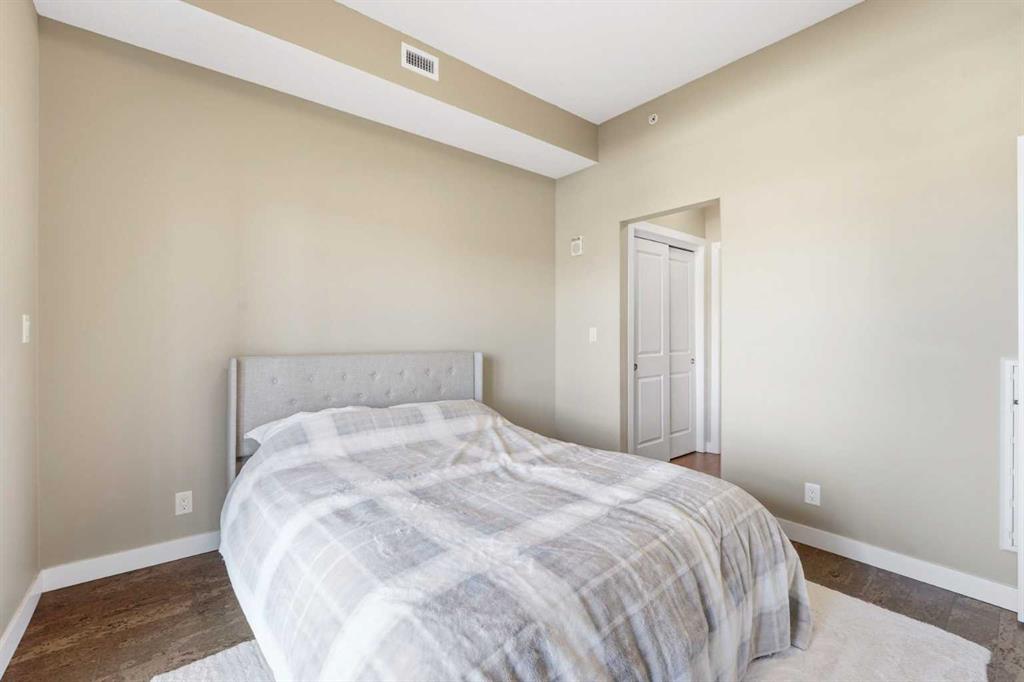 Perched on an upper floor in the highly sought-after community of Varsity Estates, this modern 1 bedroom plus den condo offers an open-concept layout in a CONCRETE BUILDING, providing excellent soundproofing and long-term durability. The space is enhanced by impressive 10-FOOT CEILINGS and FLOOR-TO-CEILING WINDOWS, allowing natural light to fill the home throughout the day. The spacious kitchen is designed for both everyday living and entertaining, featuring QUARTZ COUNTERTOPS, FULL-HEIGHT CABINETRY, STAINLESS STEEL APPLIANCES, and a generous breakfast bar that flows seamlessly into the living and dining areas. A versatile den with a pocket door provides the perfect HOME OFFICE or flex space for today’s lifestyle. The primary bedroom includes a walk-through closet with custom organizers and access to a spa-inspired bathroom complete with an OVERSIZED GLASS SHOWER and built-in bench. Comfort is elevated with CENTRAL AIR CONDITIONING, IN-SUITE LAUNDRY, TITLED UNDERGROUND PARKING, and an ASSIGNED STORAGE LOCKER. Residents also enjoy access to exceptional rooftop amenities, including a ROOFTOP FITNESS CENTER, STEAM ROOMS, OWNER’S LOUNGE, and an outdoor terrace with BBQs and mountain views. The location is incredibly convenient — just steps to cafes, restaurants, shops, and everyday amenities, with DALHOUSIE LRT, UNIVERSITY OF CALGARY, and MARKET MALL nearby. An excellent opportunity for first-time buyers, professionals, investors, or those looking to downsize without compromise while owning in a well-built concrete building in one of Calgary’s most desirable communities.