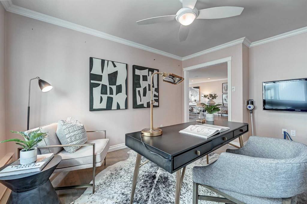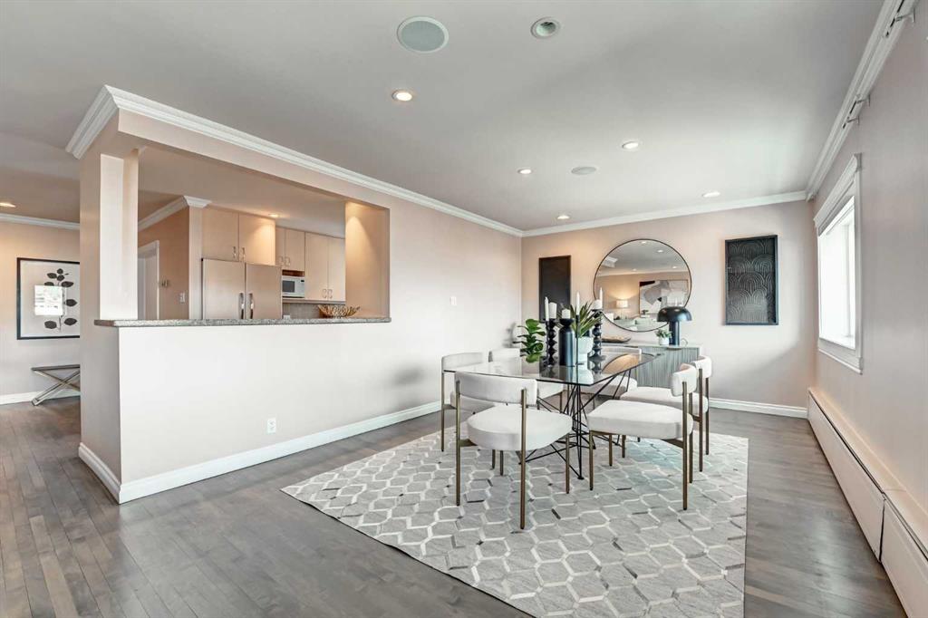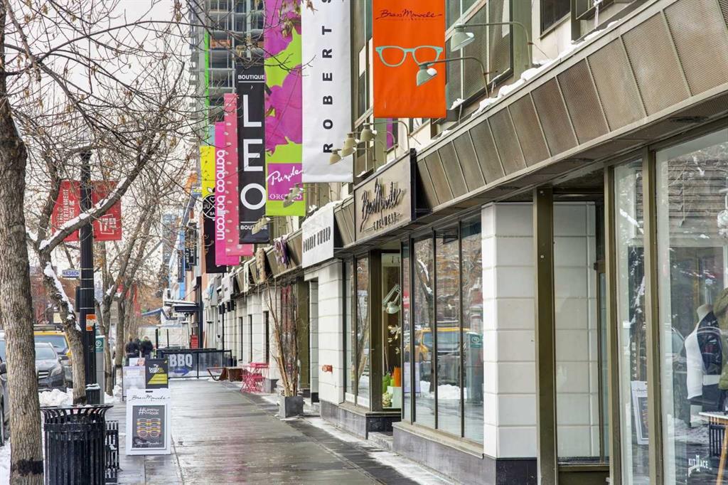 Discover the perfect blend of tranquility and city living in this TOP FLOOR, END UNIT, QUIET, CONCRETE condo offering unobstructed skyline VIEWS! Just steps from the vibrant cafés, boutiques, and restaurants of 4th Street, 17th Avenue, and the scenic Elbow River Pathways, this home places the best of Calgary right at your doorstep while giving you a peaceful retreat above it all. Inside, you’re welcomed by a spacious 1,434 sq ft OPEN CONCEPT layout bathed in natural light. Beautiful SITE FINISHED HARDWOOD, FLAT, painted ceilings, and expansive windows create a warm, sophisticated atmosphere throughout the main living areas. The generous Living, Dining, and Kitchen spaces are perfectly positioned to take in the sweeping cityscape—an inspiring backdrop day and night. The well-appointed Kitchen offers abundant Granite counter space, excellent storage, and a pull-out pantry, making it as functional as it is stylish. A charming Den—easily converted back into a bedroom—sits conveniently near a full bath, offering flexibility for guests, work, or hobbies. The Primary Suite is a true standout, comfortably fitting a King Bed and featuring an impressive custom Dressing Room created from a former bedroom. Paired with a private En-Suite and In-suite laundry, it delivers everyday luxury and convenience. Throughout the home, Hunter Douglas window coverings, including bedroom blackouts, add comfort and quality. Upgrades such as TRIPLE PANE Windows and a new Patio Door enhance energy efficiency and quiet enjoyment. Step outside to your LARGE PRIVATE BALCONY, where there’s ample room for garden pots, lounging, and soaking in those stunning views. This well-managed building offers TITLED underground parking (no post-tension), a Separate Storage unit, bike storage,2 elevators, and access to a charming treed courtyard. Guests will appreciate the plentiful 2-hour free street parking. Pets are welcome with board approval. Move-in ready and offering the best of Inner-City living in a peaceful, elevated setting—this is the Mount Royal lifestyle you’ve been waiting for.