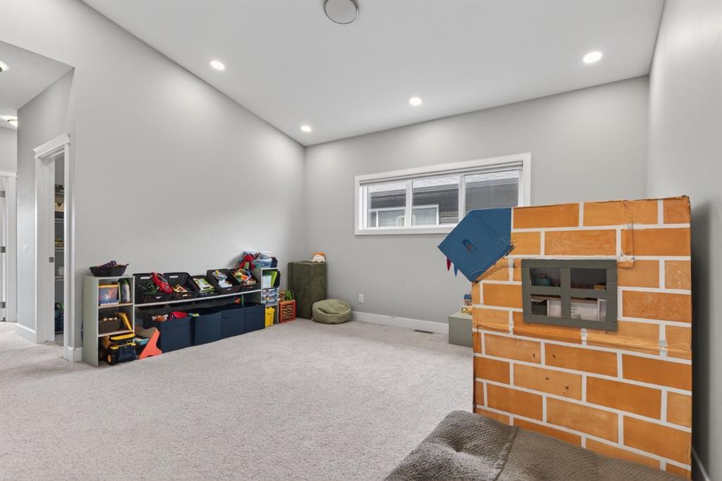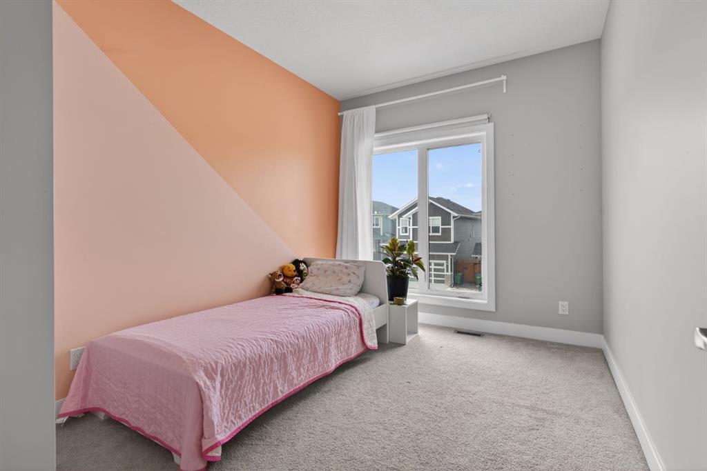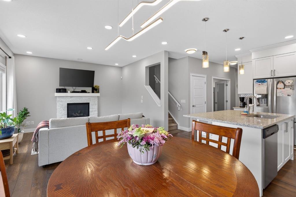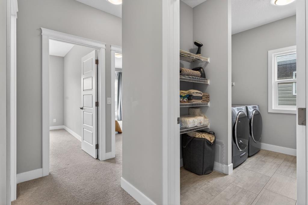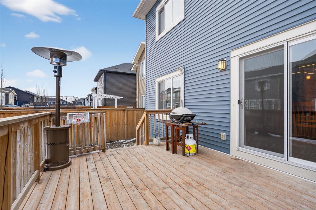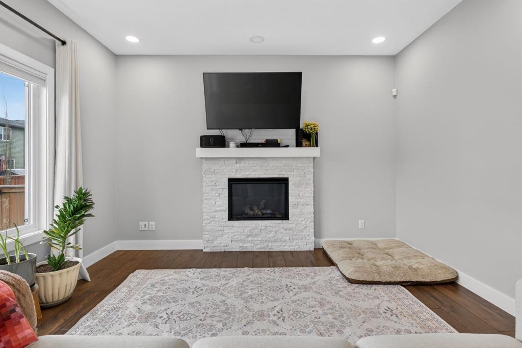 Welcome to this beautifully upgraded home offering 2,331 sq. ft. of refined living space, complete with a double-car garage, four upper-level bedrooms, a versatile main-floor office, and a fully landscaped, fenced yard. Situated on a quiet no-through street, the property showcases a distinctive exterior and high-end interior finishes throughout, including air conditioning. The home features white shaker-style kitchen cabinetry, quartz countertops, and a large central island. Premium built-in stainless steel appliances and a walk-in pantry complete this gourmet kitchen. The open-concept family room is ideal for entertaining family and friends, while the dining area opens onto a raised deck overlooking a beautifully finished yard with a striking fence. The bright living room offers an oversized window and a cozy, child-safe ledgestone fireplace with cool-to-the-touch glass. Durable hand-scraped laminate flooring runs throughout the main floor — perfect for busy households. A standout feature is the enclosed main-floor office with etched-glass French doors, providing a private workspace. A tiled mudroom off the garage adds practical storage, including a full closet for organized family living. Upstairs, four spacious bedrooms with 9-foot ceilings are complemented by a central bonus room with vaulted ceilings — an ideal secondary living space. The 5-piece main bathroom includes dual sinks and a tub/shower combination. The secluded primary bedroom features a designer feature wall, walk-in closet, and a spa-inspired ensuite with a 6-foot soaker tub, separate shower, and dual quartz vanities. The open basement offers excellent potential, providing ample room for storage, a home gym, or a play area for the kids.