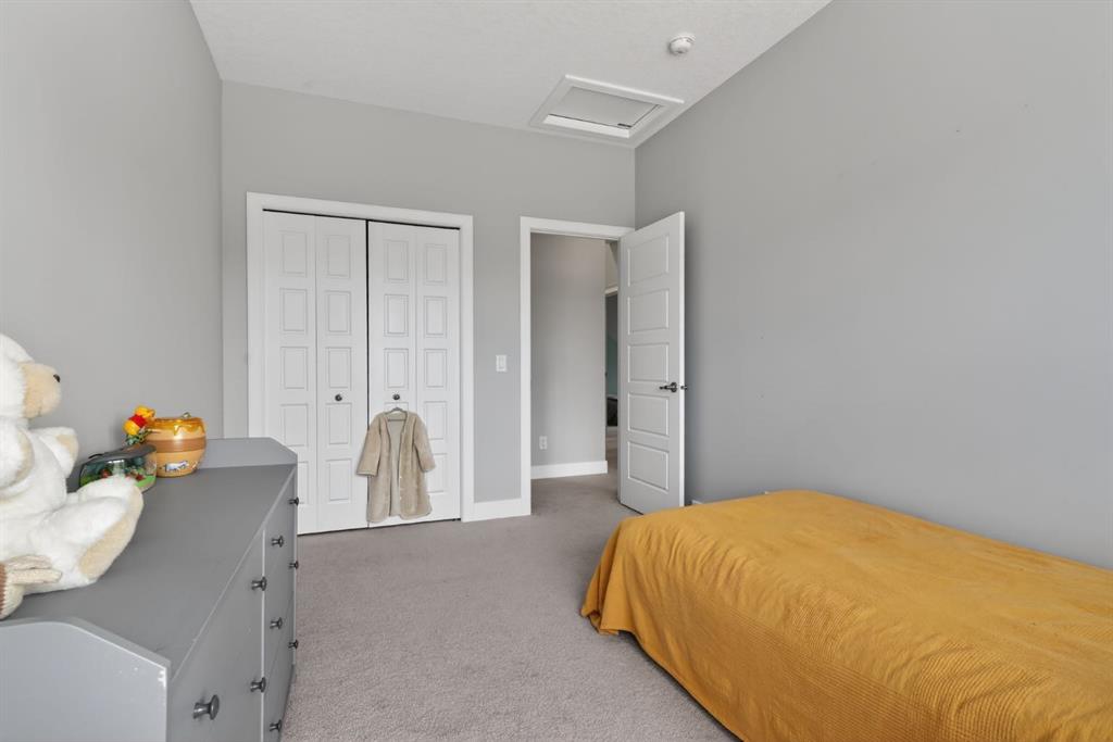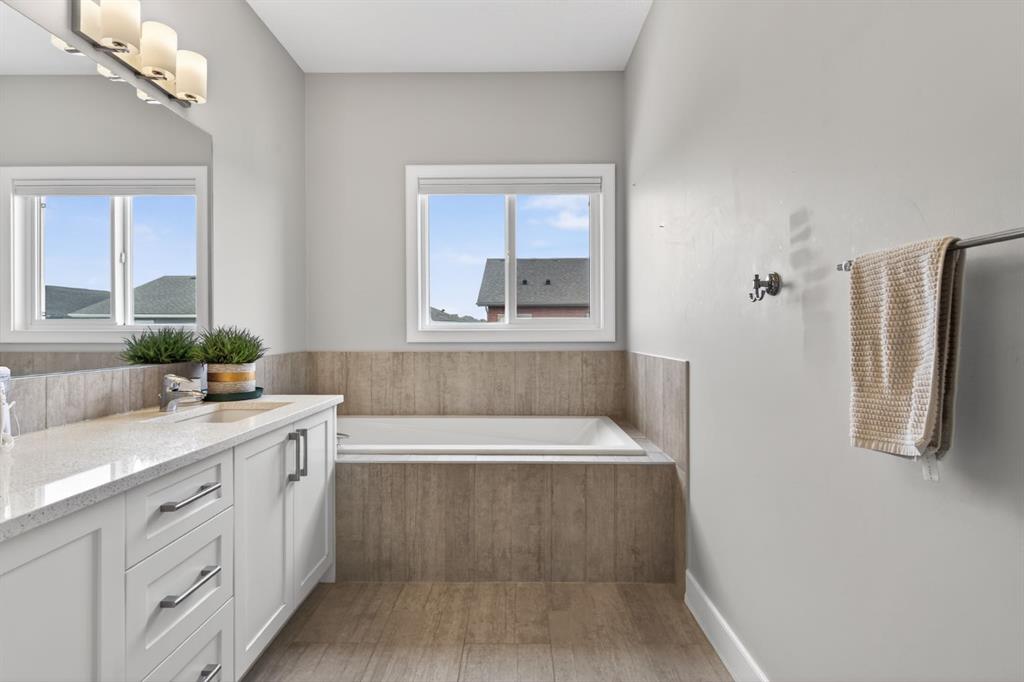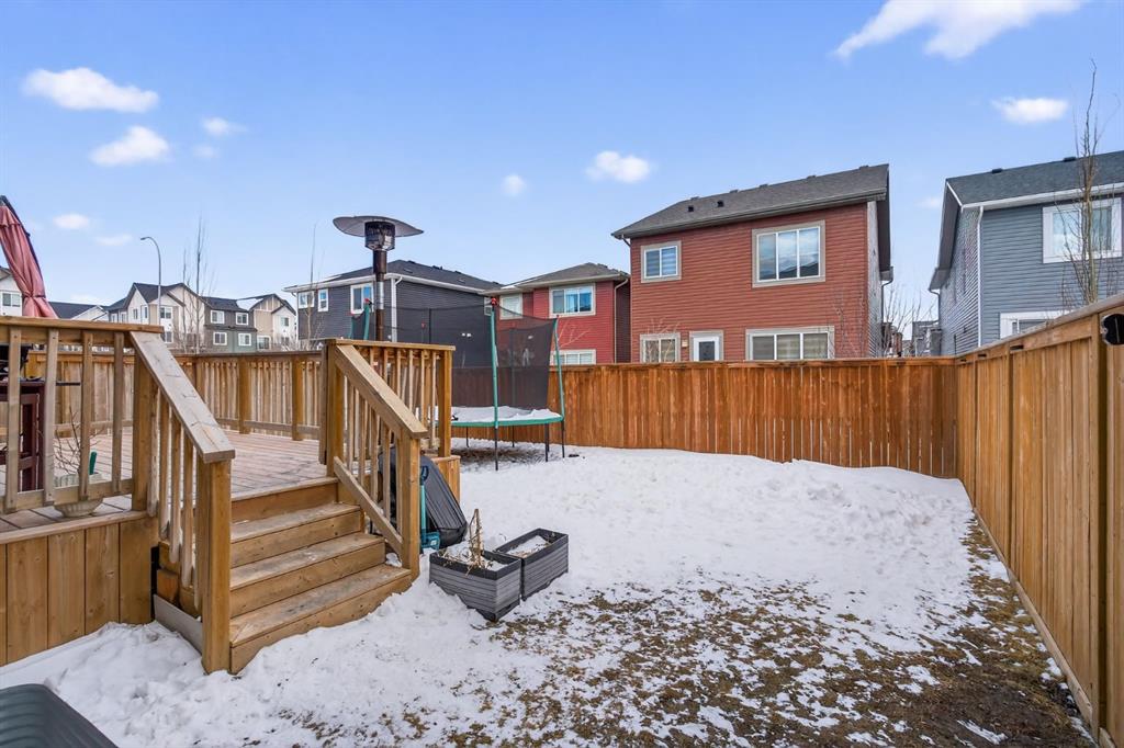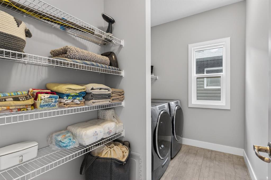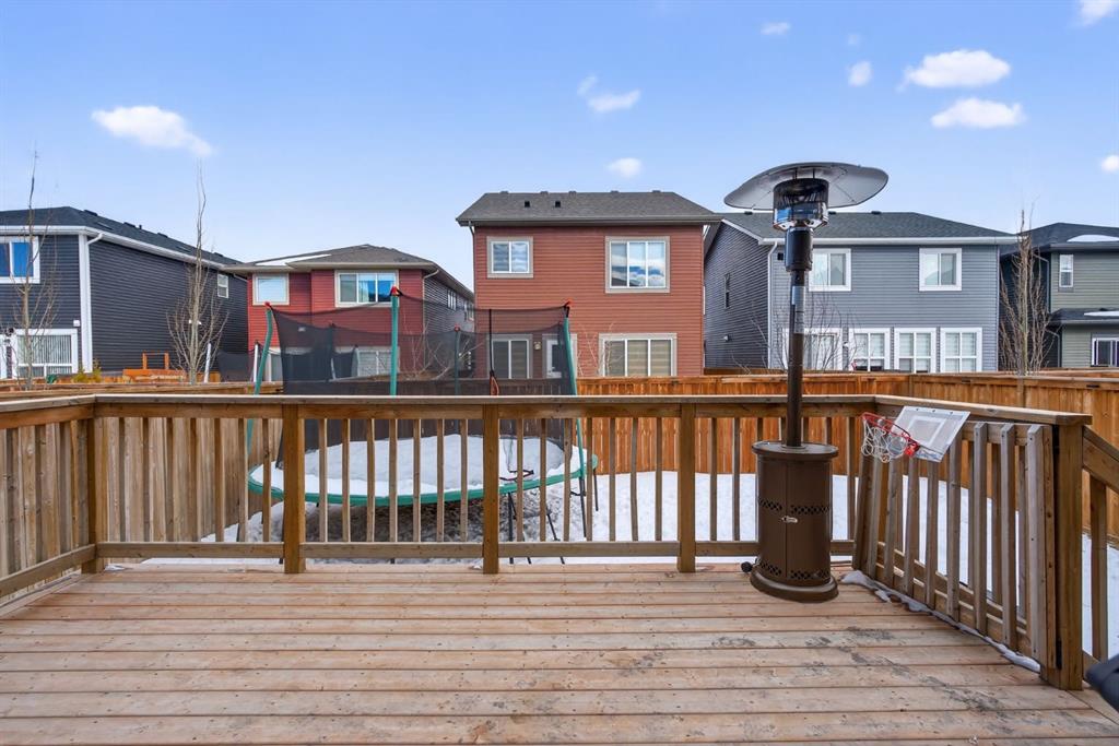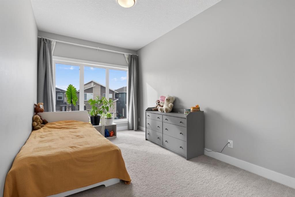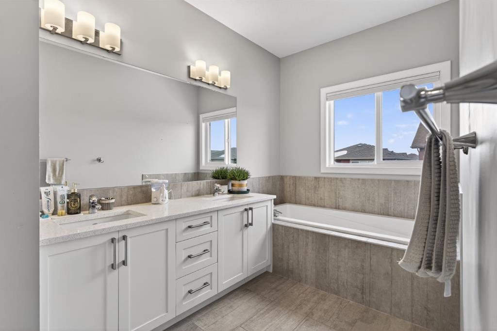 Welcome to this beautifully upgraded home offering 2,331 sq. ft. of refined living space, complete with a double-car garage, four upper-level bedrooms, a versatile main-floor office, and a fully landscaped, fenced yard. Situated on a quiet no-through street, the property showcases a distinctive exterior and high-end interior finishes throughout, including air conditioning. The home features white shaker-style kitchen cabinetry, quartz countertops, and a large central island. Premium built-in stainless steel appliances and a walk-in pantry complete this gourmet kitchen. The open-concept family room is ideal for entertaining family and friends, while the dining area opens onto a raised deck overlooking a beautifully finished yard with a striking fence. The bright living room offers an oversized window and a cozy, child-safe ledgestone fireplace with cool-to-the-touch glass. Durable hand-scraped laminate flooring runs throughout the main floor — perfect for busy households. A standout feature is the enclosed main-floor office with etched-glass French doors, providing a private workspace. A tiled mudroom off the garage adds practical storage, including a full closet for organized family living. Upstairs, four spacious bedrooms with 9-foot ceilings are complemented by a central bonus room with vaulted ceilings — an ideal secondary living space. The 5-piece main bathroom includes dual sinks and a tub/shower combination. The secluded primary bedroom features a designer feature wall, walk-in closet, and a spa-inspired ensuite with a 6-foot soaker tub, separate shower, and dual quartz vanities. The open basement offers excellent potential, providing ample room for storage, a home gym, or a play area for the kids.