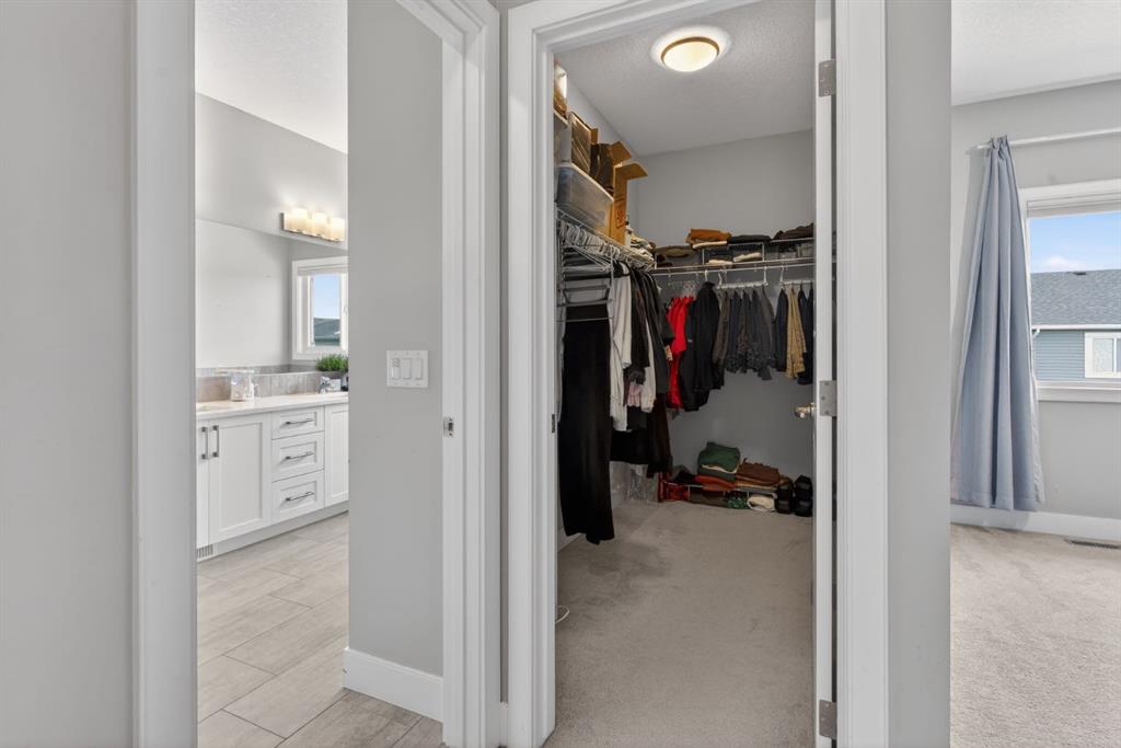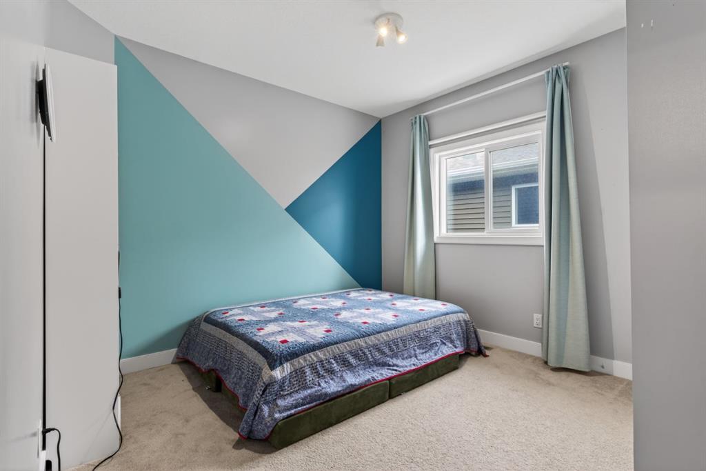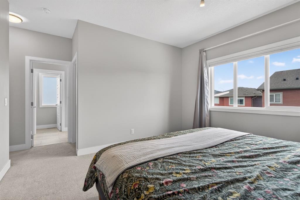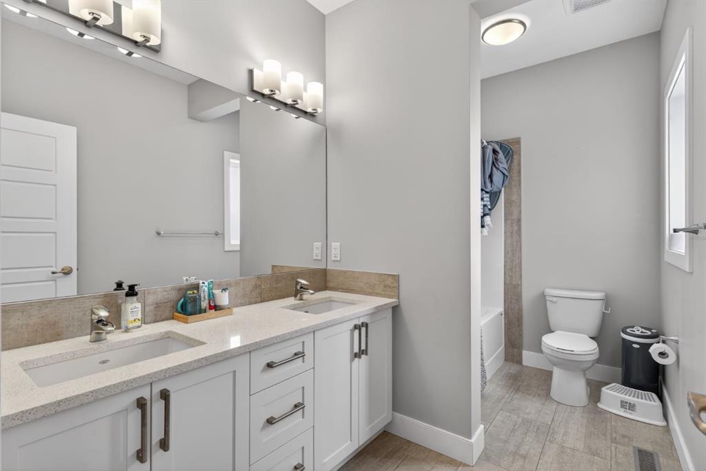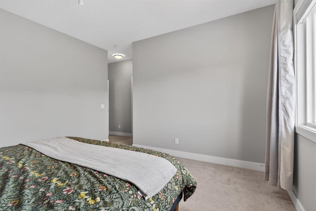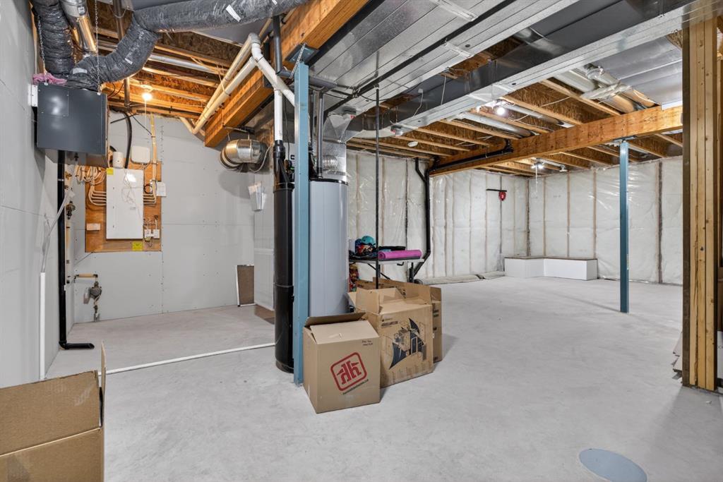 Welcome to this beautifully upgraded home offering 2,331 sq. ft. of refined living space, complete with a double-car garage, four upper-level bedrooms, a versatile main-floor office, and a fully landscaped, fenced yard. Situated on a quiet no-through street, the property showcases a distinctive exterior and high-end interior finishes throughout, including air conditioning. The home features white shaker-style kitchen cabinetry, quartz countertops, and a large central island. Premium built-in stainless steel appliances and a walk-in pantry complete this gourmet kitchen. The open-concept family room is ideal for entertaining family and friends, while the dining area opens onto a raised deck overlooking a beautifully finished yard with a striking fence. The bright living room offers an oversized window and a cozy, child-safe ledgestone fireplace with cool-to-the-touch glass. Durable hand-scraped laminate flooring runs throughout the main floor — perfect for busy households. A standout feature is the enclosed main-floor office with etched-glass French doors, providing a private workspace. A tiled mudroom off the garage adds practical storage, including a full closet for organized family living. Upstairs, four spacious bedrooms with 9-foot ceilings are complemented by a central bonus room with vaulted ceilings — an ideal secondary living space. The 5-piece main bathroom includes dual sinks and a tub/shower combination. The secluded primary bedroom features a designer feature wall, walk-in closet, and a spa-inspired ensuite with a 6-foot soaker tub, separate shower, and dual quartz vanities. The open basement offers excellent potential, providing ample room for storage, a home gym, or a play area for the kids.