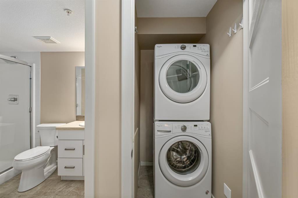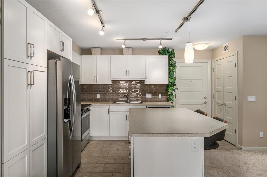 Want to have everything at your doorstep? Groceries, medical, restaurants, fitness, even massage! "Right-size" into this absolute GEM! Modern open-concept layout, Stylish - quiet +55 condo community - Main floor unit - Easy access for moving and getting to the grocery store! - Ceramic in-floor heating - In-suite air conditioning - One-owner home, well maintained - Updated kitchen with upgraded backsplash & under-cabinet lighting - Large kitchen island, ideal for entertaining - Over-the-range microwave - Pantry with roll-out shelves Quiet, soft-closing cupboard doors and drawers - Spacious bedroom with dual closets - Blackout window coverings plus curtains for comfort & privacy - Bathroom with walk-in shower & built-in shelving - Cozy carpet in bedroom/living areas -TWO PARKING STALLS: One directly outside patio door — ideal for groceries & easy access. One secure underground stall with extra storage, located right across from stair access - Elevator access for convenience to underground parking, Perfect for couples with two vehicles or a single person with one vehicle and extra parking for family or guests parking beyond 24 hours - Small pets allowed - Barbecue gazebo for outdoor gatherings - Community turf grass area for pets to enjoy - Card game days in the amenity room - amenities room & landscaped private courtyard - No-smoking - Steps to Kingsview Market (groceries, dining, pharmacy, medical) - Close to parks, ponds & amphitheatre - Easy access to Genesis Place recreation complex - Quick commute to Calgary via Highway 2 & Yankee Valley Blvd. Come see it today!