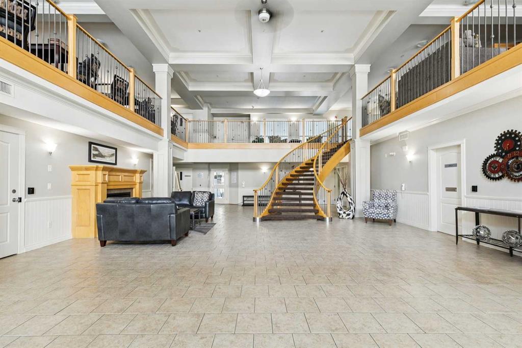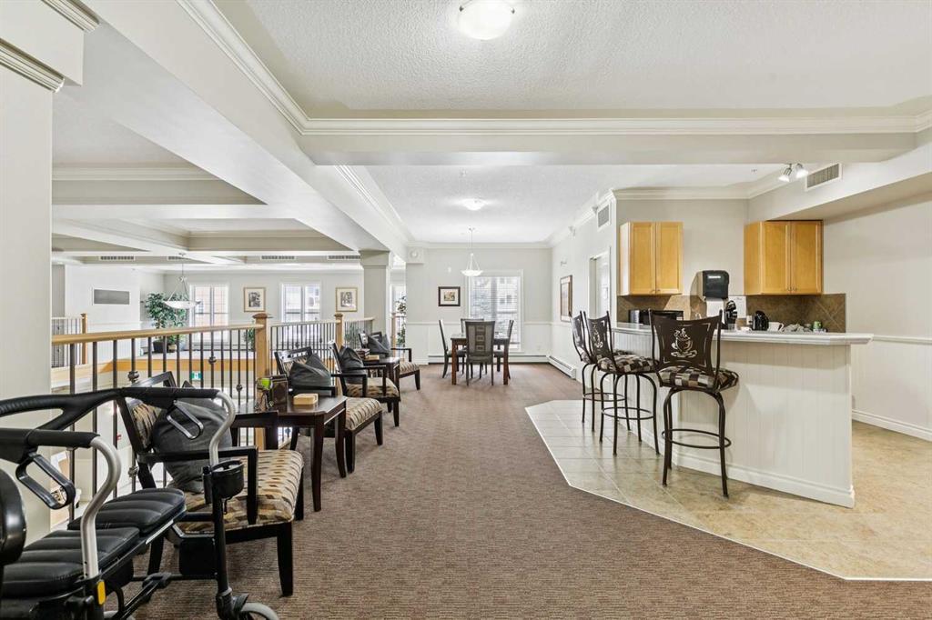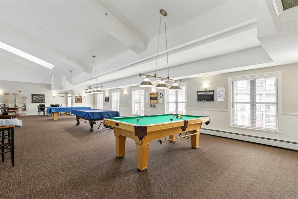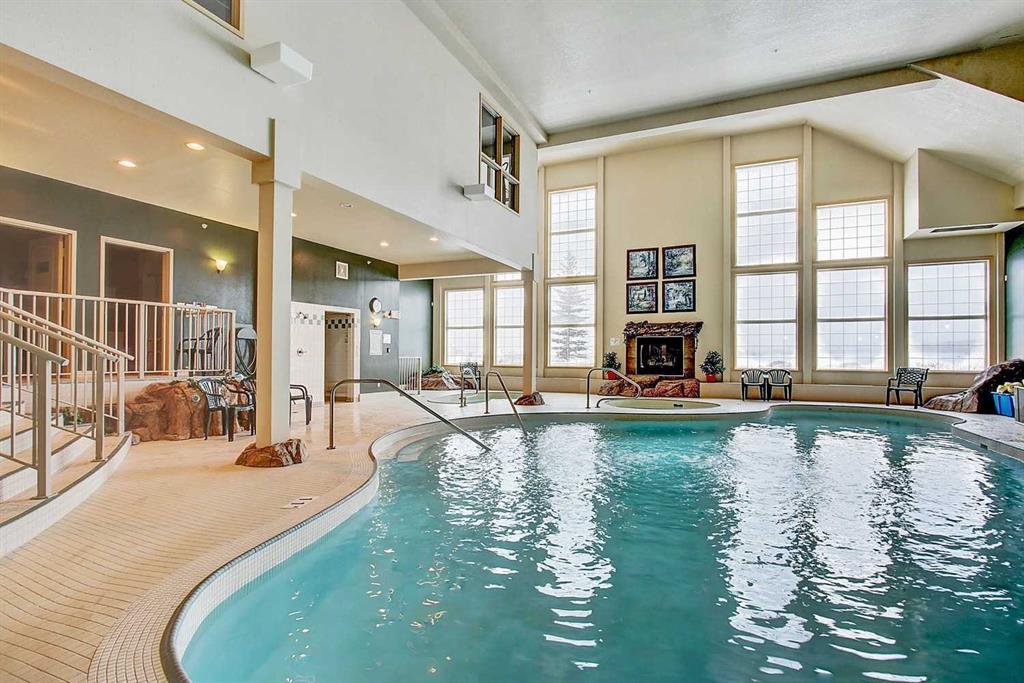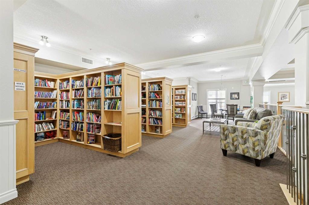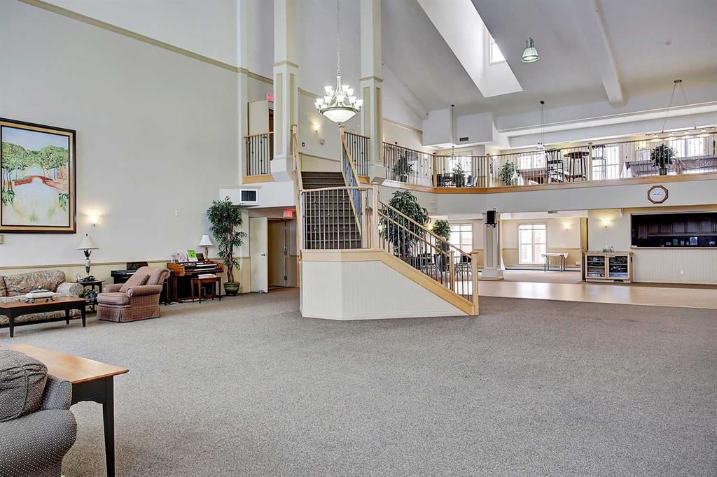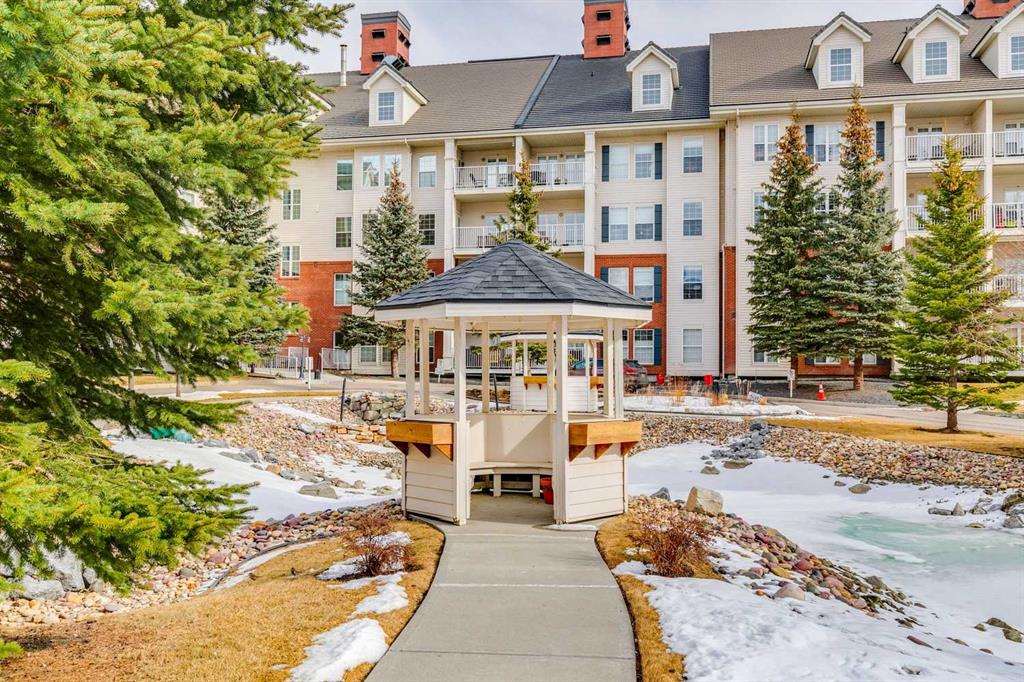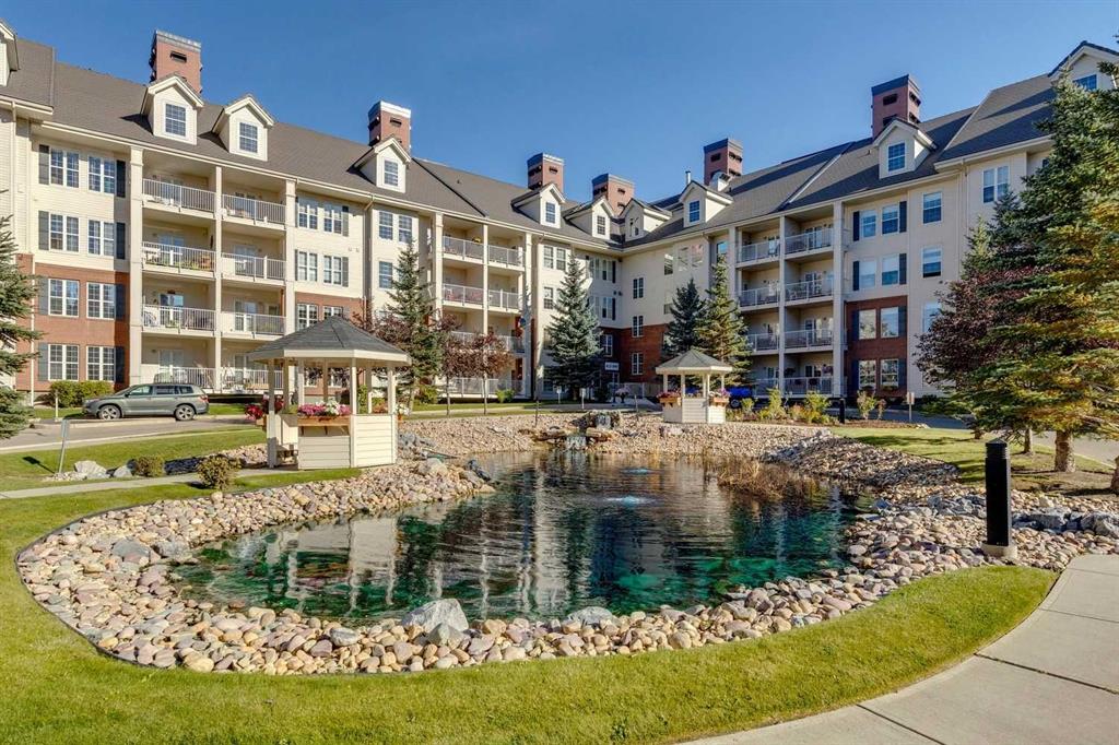 Exceptional 40+ complex in a prime location with outstanding amenities! This highly sought-after, well-managed community features an active Board and a true pride of ownership throughout. Almost 1,000 sq ft, this spacious 1 Bedroom + Den unit is ideally situated in a quiet corner of the complex. The functional open-concept layout includes a large kitchen with eating bar overlooking the living room, ample counter space, pantry, and a separate dining area. The bright living room features a cozy fireplace and large windows with access to the generous deck. The oversized primary bedroom includes a walk-in closet and a 5-piece ensuite with double sinks, abundant cabinetry, and excellent counter space. Additional highlights include 10 ft ceilings, quality carpet underlay, in-suite storage, plus a storage locker conveniently located at the front of the titled underground heated parking stall. Resort-style amenities include an indoor swimming pool, hot tubs, fully equipped fitness room, theatre, billiards/games room open to a dance floor and party space, library, car wash bay, and workshop area in the heated parkade. Beautiful walking paths surround the pond to the south with sitting areas throughout the grounds. Ideally located close to shopping, dining, recreation, VIVO Centre, cinema, and more, with quick access to Deerfoot Trail and Stoney Trail. A fantastic opportunity to enjoy maintenance-free living in a vibrant, amenity-rich community. Get into this desired Community while you can!
