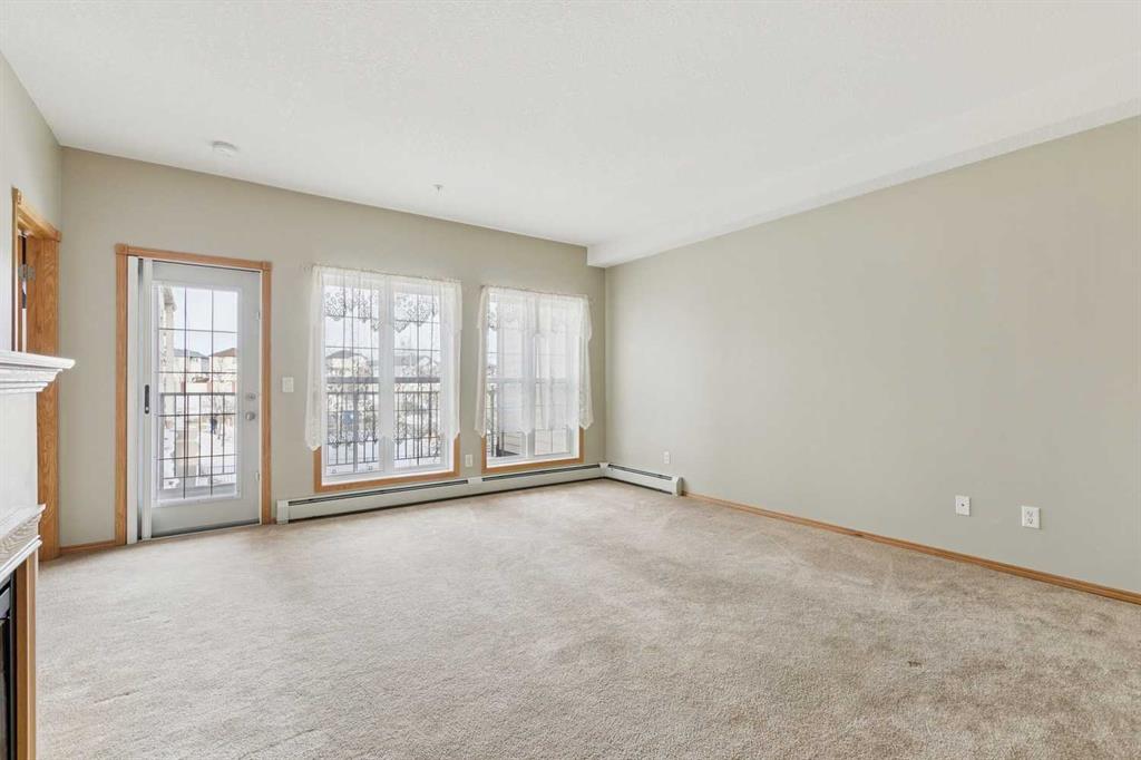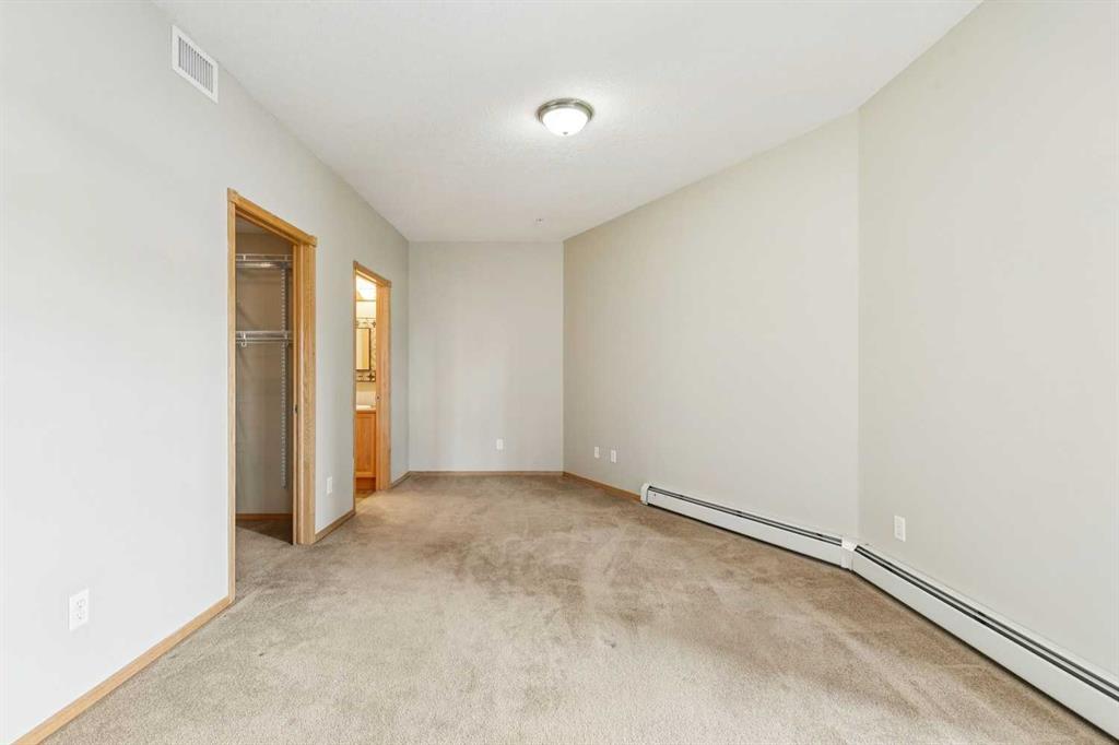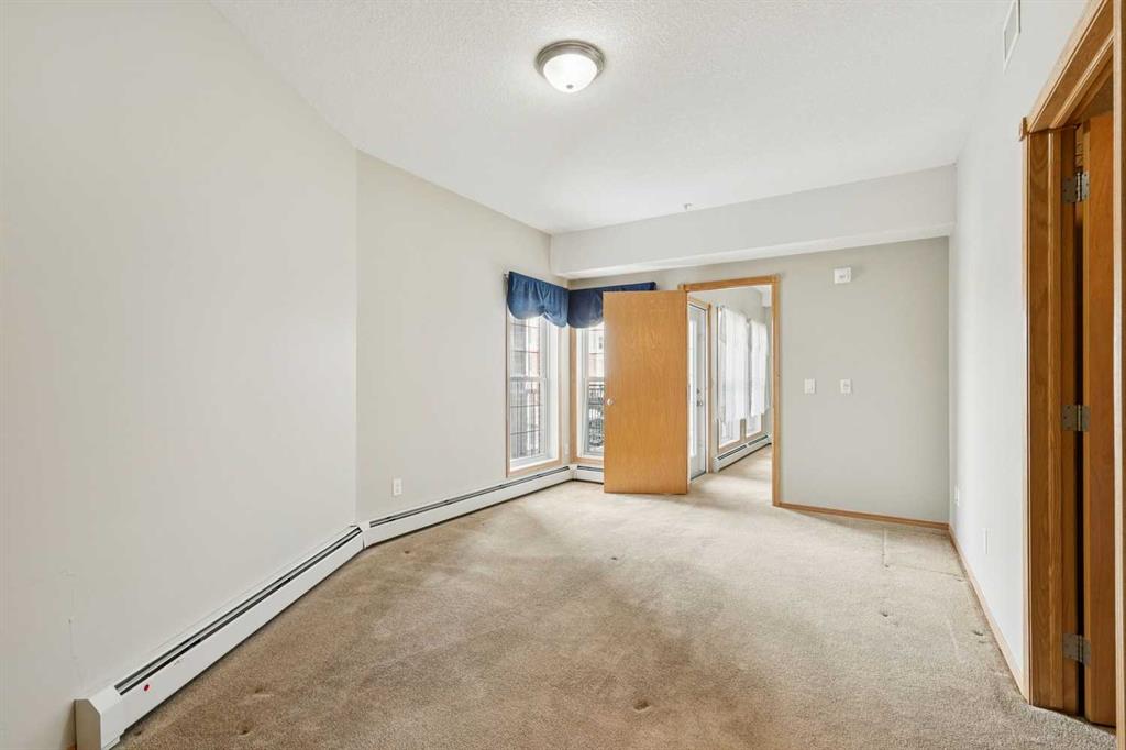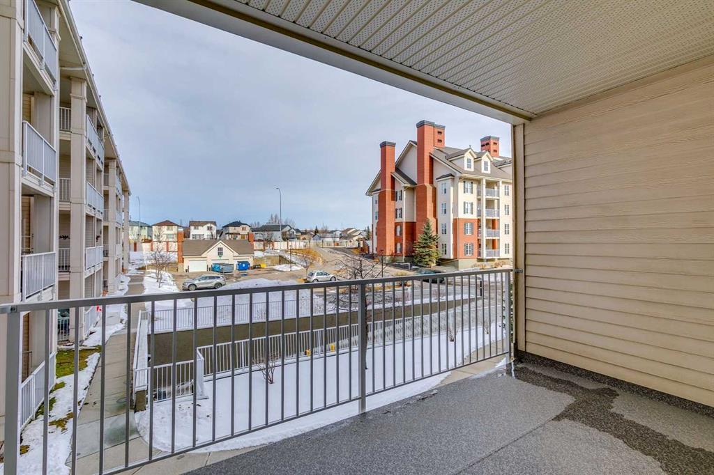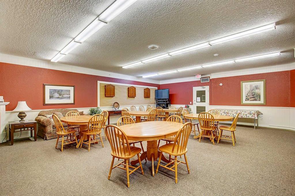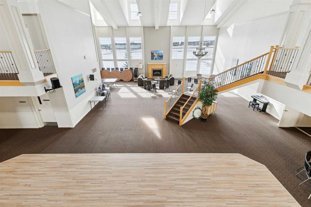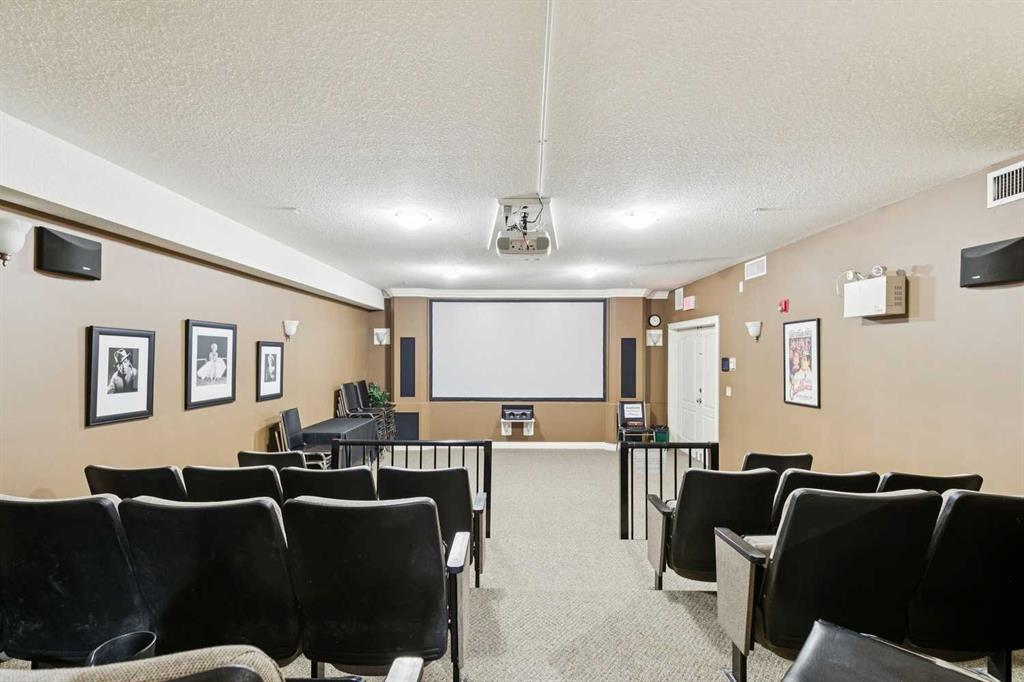 Exceptional 40+ complex in a prime location with outstanding amenities! This highly sought-after, well-managed community features an active Board and a true pride of ownership throughout. Almost 1,000 sq ft, this spacious 1 Bedroom + Den unit is ideally situated in a quiet corner of the complex. The functional open-concept layout includes a large kitchen with eating bar overlooking the living room, ample counter space, pantry, and a separate dining area. The bright living room features a cozy fireplace and large windows with access to the generous deck. The oversized primary bedroom includes a walk-in closet and a 5-piece ensuite with double sinks, abundant cabinetry, and excellent counter space. Additional highlights include 10 ft ceilings, quality carpet underlay, in-suite storage, plus a storage locker conveniently located at the front of the titled underground heated parking stall. Resort-style amenities include an indoor swimming pool, hot tubs, fully equipped fitness room, theatre, billiards/games room open to a dance floor and party space, library, car wash bay, and workshop area in the heated parkade. Beautiful walking paths surround the pond to the south with sitting areas throughout the grounds. Ideally located close to shopping, dining, recreation, VIVO Centre, cinema, and more, with quick access to Deerfoot Trail and Stoney Trail. A fantastic opportunity to enjoy maintenance-free living in a vibrant, amenity-rich community. Get into this desired Community while you can!