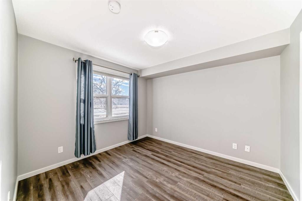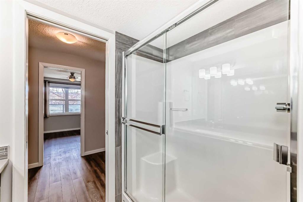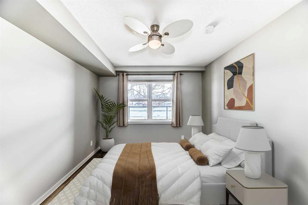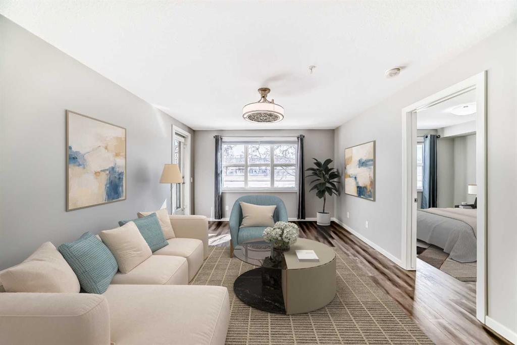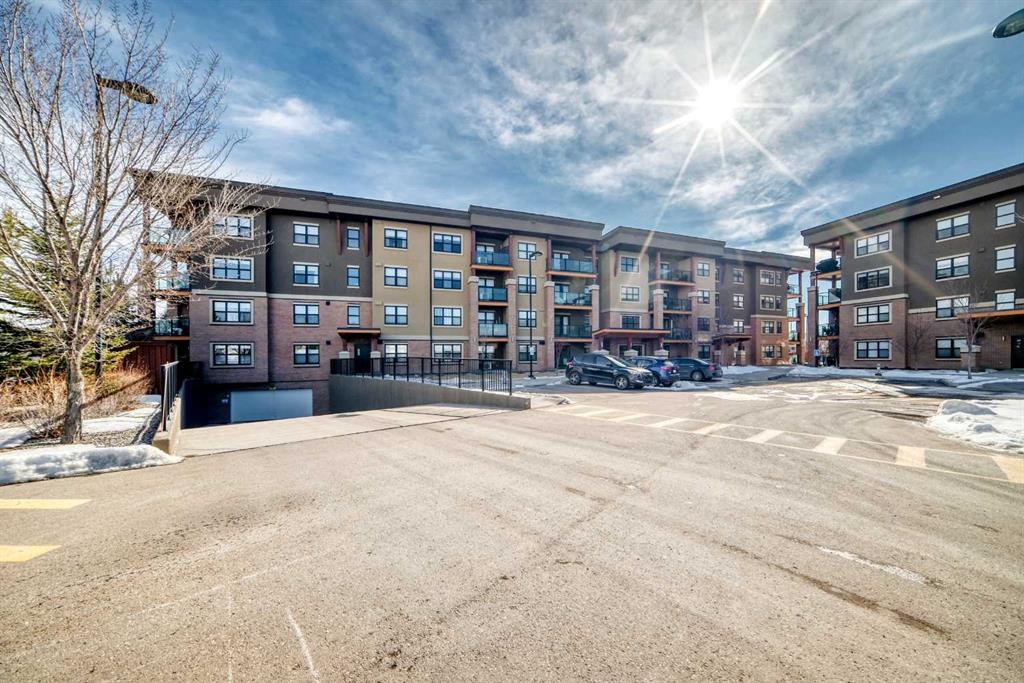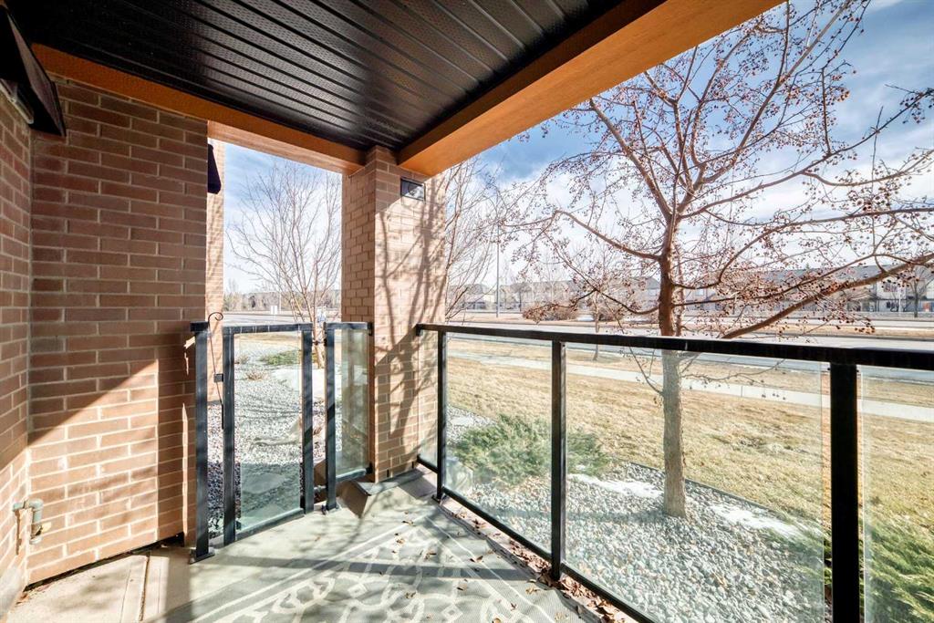 Welcome to The Chateaux at 10 Market Boulevard – Airdrie’s premier 55+ condominium community where luxury and convenience meet. This beautifully appointed ground-floor unit offers 2 spacious bedrooms, each featuring walk-in closets with custom organizers, providing exceptional storage. The primary ensuite showcases dual sinks and a walk-in shower, while the main bathroom features a relaxing soaker tub—perfect for unwinding. The thoughtfully designed kitchen and living areas feature quartz countertops, durable vinyl flooring, ample cabinetry, a pantry, and a convenient broom closet. High-end top-down/bottom-up blinds allow natural light to fill the space while maintaining privacy. Step outside to your private ground-floor deck with glass railing and gas BBQ hookup, offering easy access directly into your home. Additional highlights include: • Titled underground parking stall #3, conveniently located near the entrance/exit garage door. • Storage unit on the wall of this parking spot that you can lock up • Large walk-in closets with built-in organizers • Ample visitor parking Residents of The Chateaux enjoy exceptional amenities including a beautifully landscaped courtyard with a gas fireplace, a bookable amenity room for private gatherings. Ideally situated close to shopping, banking, restaurants, and medical offices, this home offers comfort, convenience, and community living. Simply book your showing and discover the lifestyle waiting for you at The Chateaux.