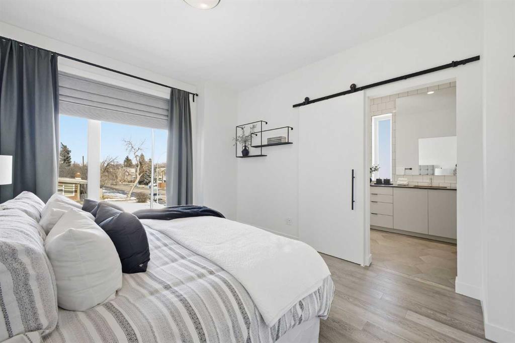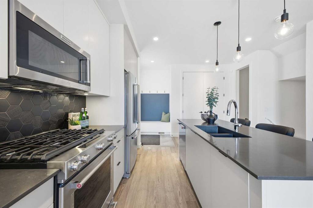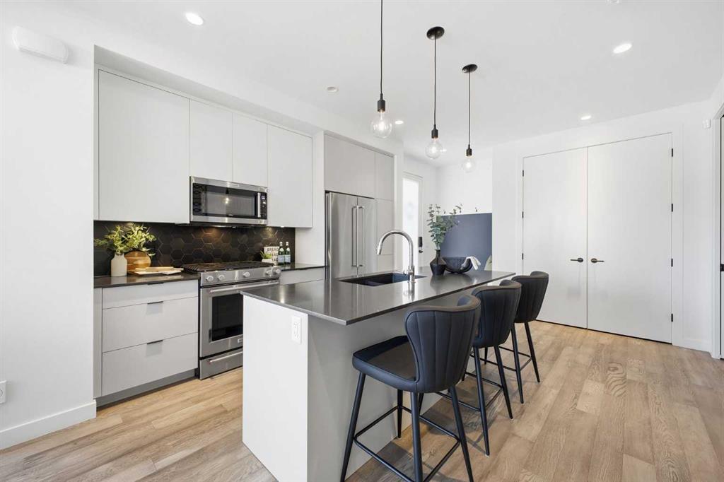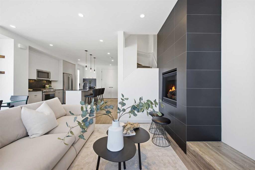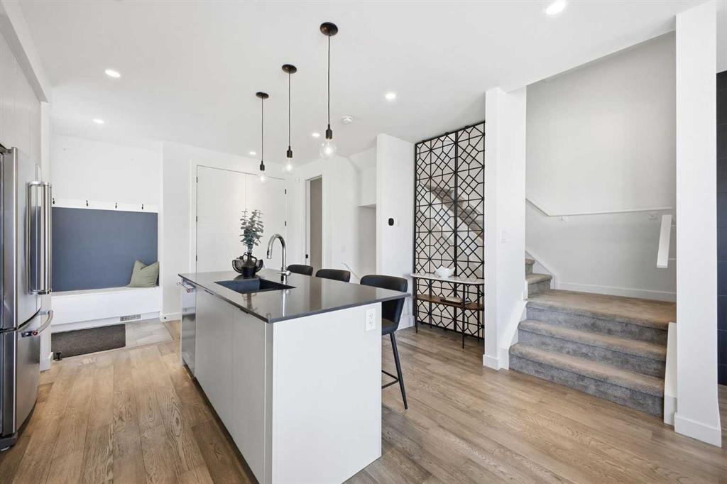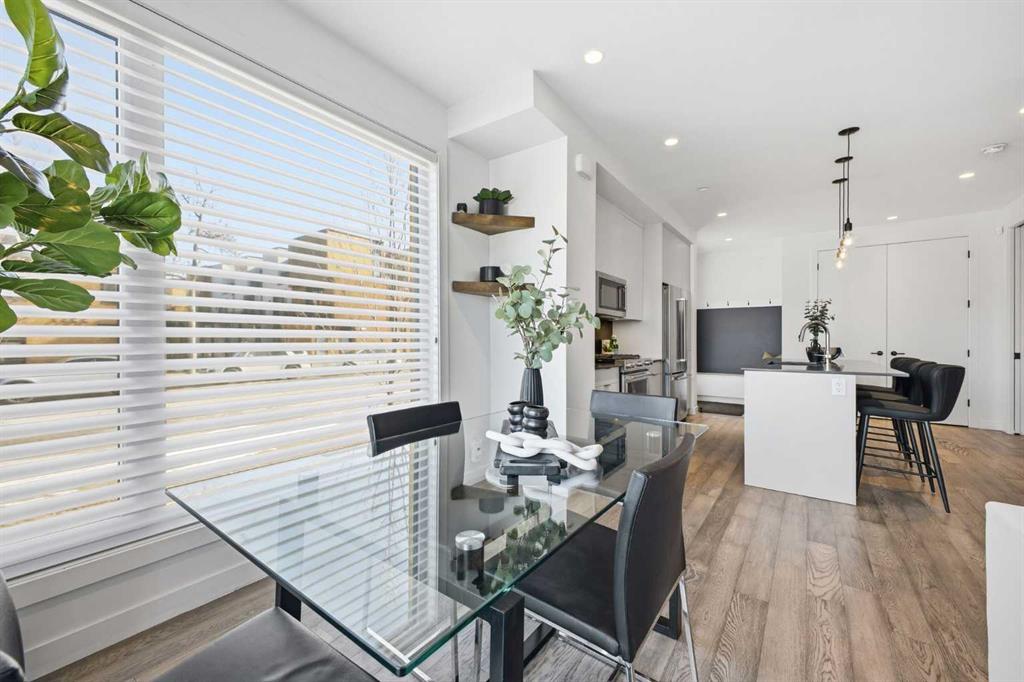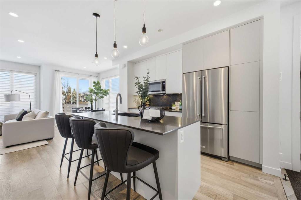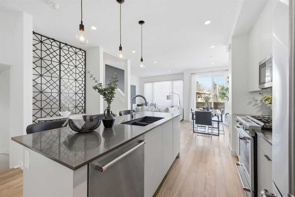 OPEN HUSE SUNDAY, MARCH 22ND FROM 1-4 PM. Welcome to this beautifully designed three storey END UNIT townhome in the heart of Altadore, offering nearly 2,200 sq ft of refined living space enhanced by thoughtful upgrades and custom finishes throughout. The open and airy main level features a bright, contemporary layout anchored by a chef’s kitchen with quartz countertops, a large island with eating bar, abundant cabinetry, and stainless steel appliances. The adjoining dining area opens onto the deck—an ideal setting for hosting family and friends—while the inviting living room with gas fireplace creates a warm, stylish space for everyday living and entertaining. The second level hosts two generously sized bedrooms, a well-appointed 4 piece bath, and convenient laundry. The private primary retreat includes a walk in closet and a secluded 4 piece ensuite with dual sinks and an oversized shower. The third floor loft, complete with a wet bar, offers exceptional flexibility as a media room, home office, studio, or lounge. From here, step out onto the private rooftop patio and enjoy sweeping views—an impressive extension of your living space. The fully finished basement adds even more versatility with a spacious recreation room, a third bedroom, and a full bathroom—perfect for guests or additional family needs. Outside, a large front patio provides another inviting spot to relax or entertain. Additional highlights include central air conditioning for year round comfort, heated bathroom floors throughout, and the convenience of a single detached garage. Set within one of Calgary’s most desirable inner city communities, this home is steps from parks, schools, shopping, and the vibrant amenities of Marda Loop, with quick access to downtown. This Altadore townhome blends modern design, custom craftsmanship, and urban convenience—an exceptional opportunity in a sought after location.