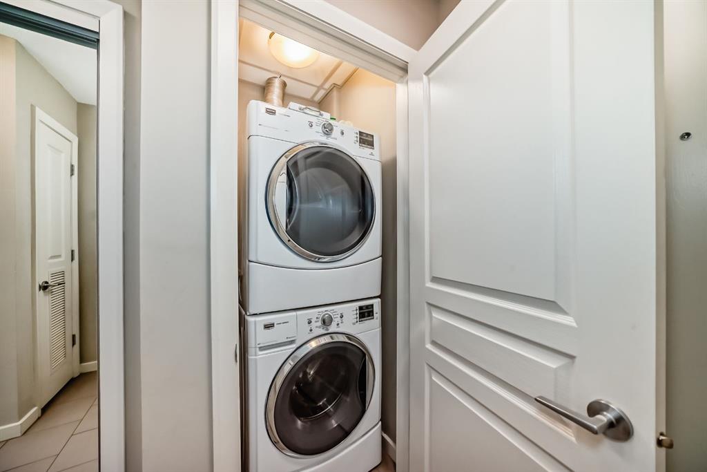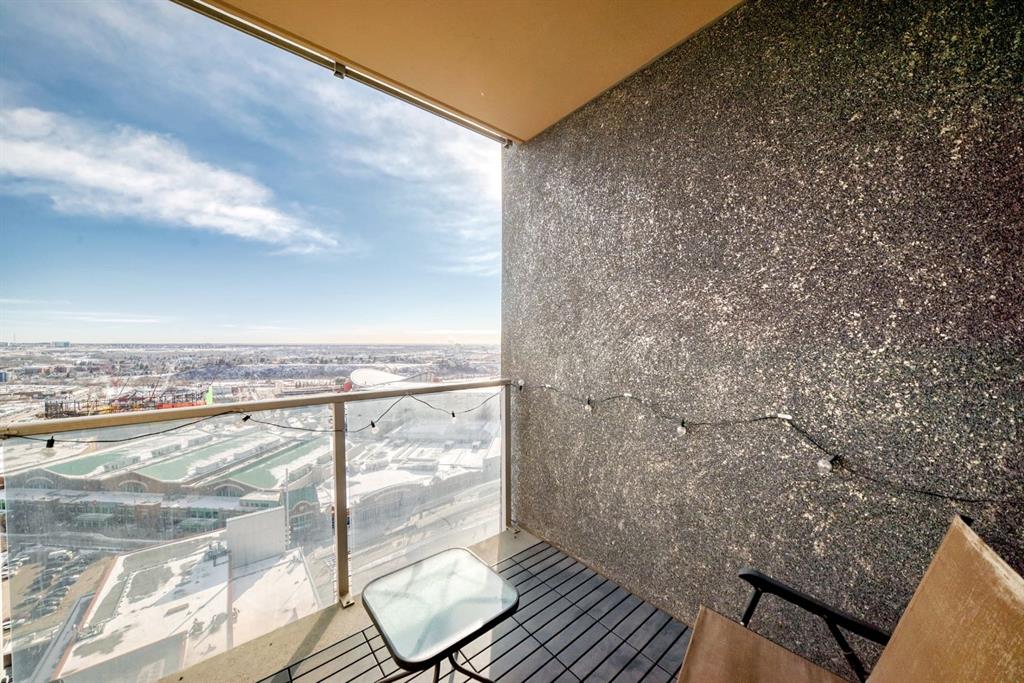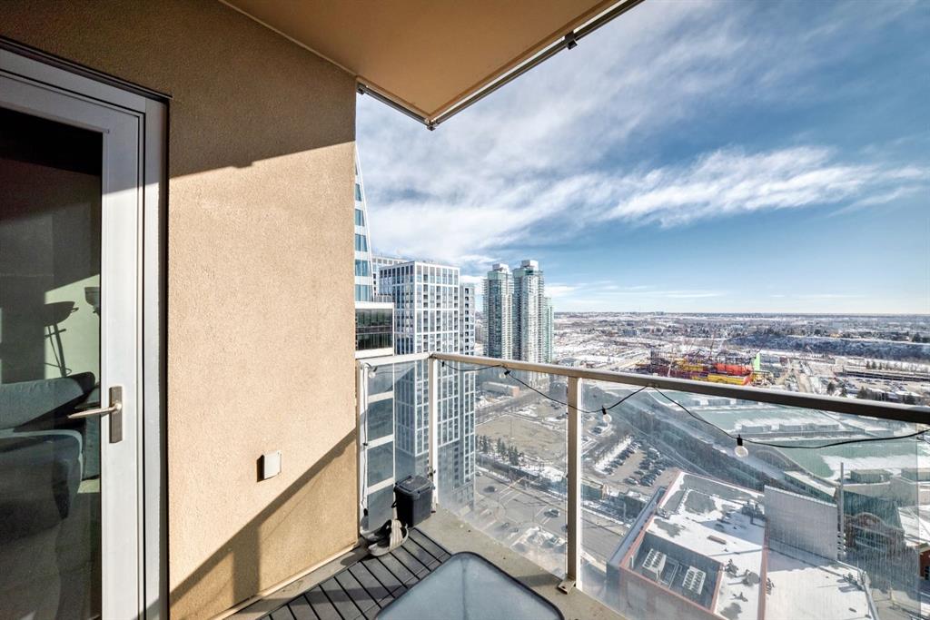 Stunning views from this prestigious 27th floor contemporary condo in sought-after Alura. This meticulously maintained unit is move-in ready and comes with breath-taking view to the southeast. Open concept layout, floor-to-ceiling windows allow for sunlight to flood this 9-foot ceiling unit. Kitchen boasts ample cupboard and counter space, stainless steel appliances and a convenient breakfast bar. Spacious dining and living room are good for entertaining. Relax in your balcony with morning coffee, unwind after work or enjoy unobstructed firework at Stampede time. Included also are in-suite laundry, underground titled parking, assigned storage locker, central air-conditioning, tons of visitor parking, bike storage room, concierge / security service, state of the art fitness facility, 2 gyms. Beautiful outdoor terrace to enjoy in summer. Excellent location close to C-train, buses, grocery stores, Stampede Park. Walk to 17th avenue, downtown and top-rated restaurants. This is urban living at it finest. Don't miss the only one-bedroom available in Alura building!