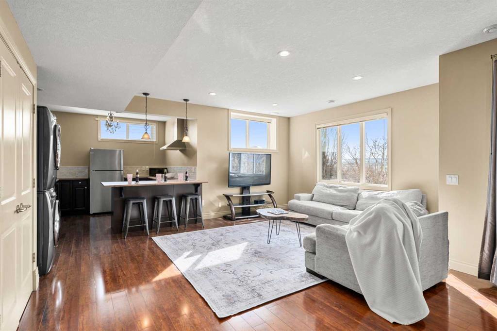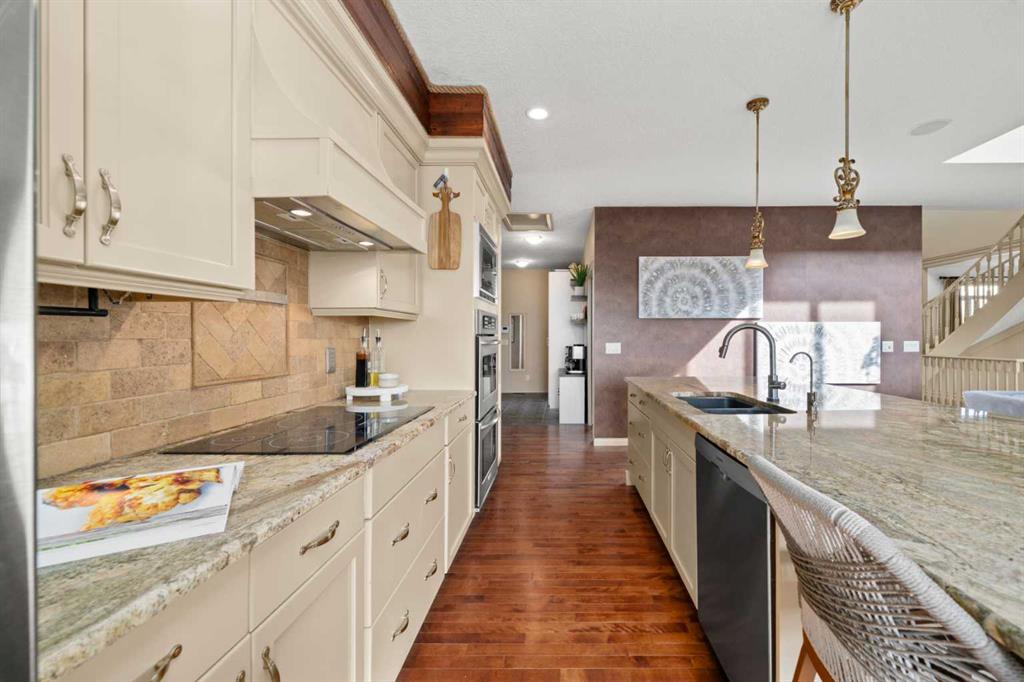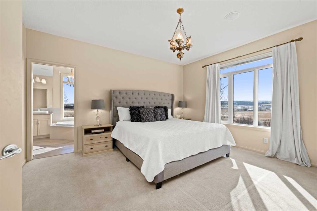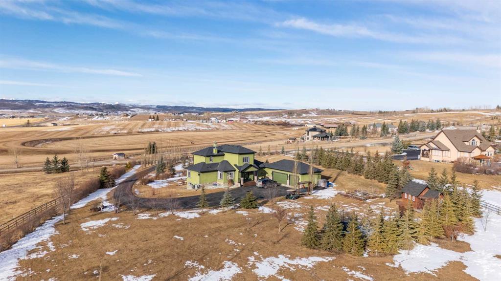 Set atop a private, gated lot, this custom-designed home takes full advantage of its unobstructed, far-reaching views. A winding drive leads you through the property, gradually revealing a home thoughtfully positioned to capture both privacy and landscape. Mornings here begin quietly—coffee in hand while watching horses train nearby—and on clear days the Rocky Mountains rise in the distance, a reminder of how remarkable this setting truly is. Inside, three levels of carefully designed living space offer room to gather, entertain, and retreat. The home opens to a generous foyer where a graceful staircase anchors the space. A bright flex room currently serves as a home office, while across the hall a well-proportioned dining room connects seamlessly to the kitchen and pantry—an easy layout for hosting family dinners or larger celebrations. The main level is filled with natural light, thanks to soaring ceilings and expansive windows. At the center of the home, the kitchen is designed for both everyday use and cooking with purpose, offering extensive cabinetry, a large island, built-in appliances, and a nearby pantry. The main-floor laundry room provides a cheerful, practical workspace. Tucked away for privacy, the primary suite offers a quiet retreat with a spacious walk-in closet and a beautifully appointed ensuite. A richly finished powder room completes the level. Upstairs, two equally sized bedrooms each feature their own full ensuite bath and elevated views across the surrounding landscape. The lower level introduces a generous amount of additional living space. Here you’ll find a large bedroom with a cheater ensuite, a gym, family room, games area—with pool table included—and a kitchenette with secondary laundry. This level adapts easily for entertaining, extended family, or a private living area for guests or a nanny. Outdoor living is equally inviting. Warm days can be spent swimming in the above-ground pool, while evenings might end with a soak in the hot tub. When temperatures rise, the home’s air conditioning keeps the interior comfortably cool. A triple attached garage and expansive driveway provide ample parking for residents and visitors alike. Set on 2.99 acres, the property feels wonderfully open, with no homes directly in front or behind—allowing the surrounding views and quiet of the landscape to take centre stage.