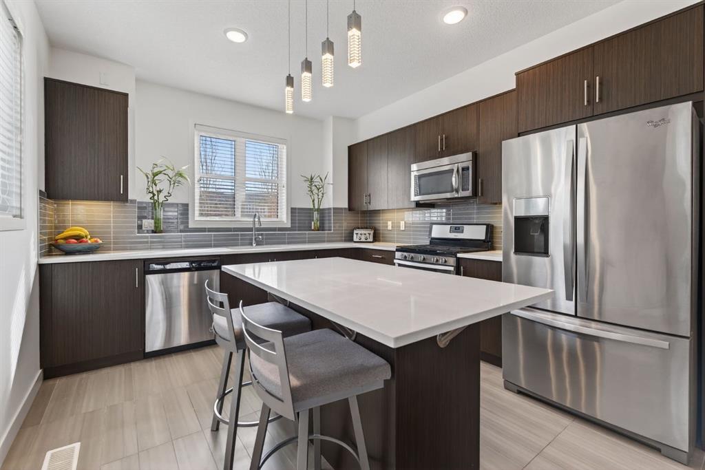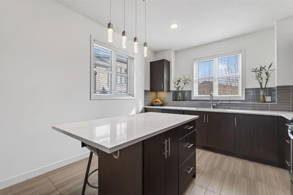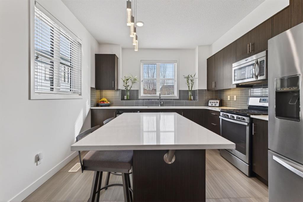 Welcome to this stylish and well-maintained 3-bedroom, 2.5-bathroom townhouse located in the vibrant community of Walden. Built in 2015 and thoughtfully designed for modern living, this inner-loop end unit offers added privacy while facing a quiet green space, creating a peaceful setting just steps from everyday conveniences. The bright and open main level features a contemporary layout perfect for both daily living and entertaining. Large windows allow natural light to fill the living room, while the modern kitchen showcases sleek cabinetry, quartz countertops, stainless steel appliances including a gas range, and ample counter space for cooking and gathering. The dining area flows seamlessly to the private balcony, creating a great space to enjoy morning coffee or relax in the evening. Upstairs, the home offers three comfortable bedrooms, including a spacious primary retreat complete with its own private ensuite bathroom. Two additional bedrooms and a full bathroom provide flexibility for family, guests, or a home office. The lower level provides access to the double tandem attached garage, offering secure parking and excellent storage, along with the added convenience of an additional outdoor parking stall. You will enjoy the a/c on those hot summer days that are just around the corner. One of the standout features of this home is its exceptional location. Residents will appreciate being just a short walk to the Township shopping area, with restaurants, groceries, cafés, and everyday amenities nearby. Outdoor enthusiasts will love the nearby parks, pathways, and green spaces, perfect for walking, biking, or enjoying the outdoors. Commuting is also easy with convenient access in and out of the community and quick connections to major routes. Offering modern design, functional living space, and a fantastic location, this home is an excellent opportunity to enjoy comfortable townhouse living in one of Calgary’s sought-after south communities.
