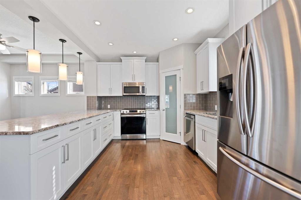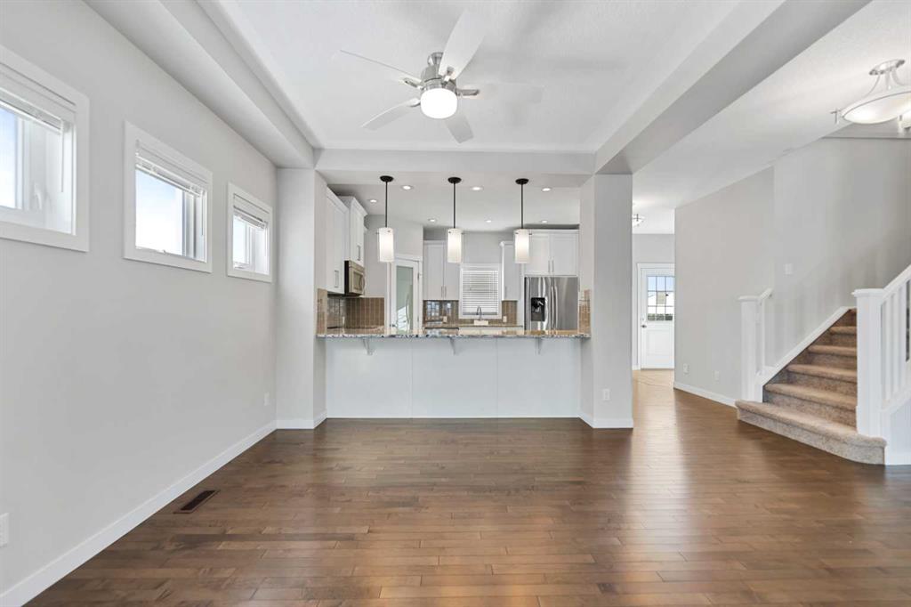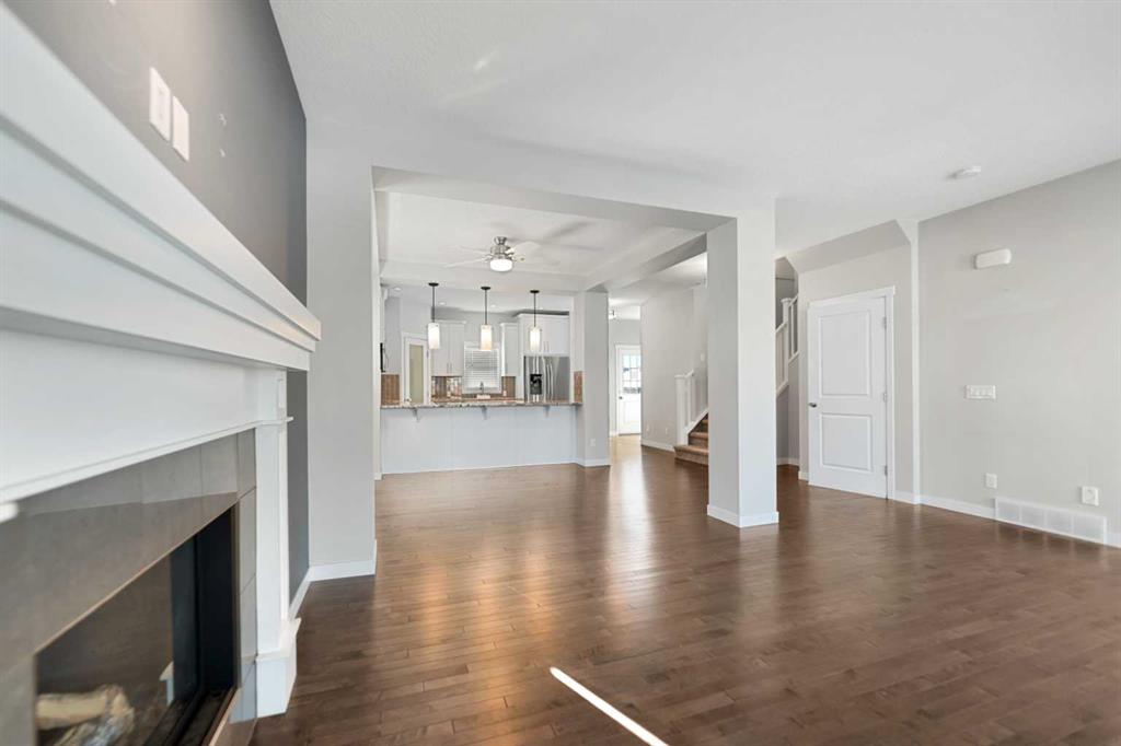 Located just 15 minutes south of Calgary in the welcoming town of Okotoks, this wonderful two-storey home sits on a desirable corner lot in the sought-after community of Drake Landing. The location offers exceptional convenience with nearby playgrounds, parks, schools, shopping, and the local golf course all just minutes away. The bright and inviting main floor features an open-concept layout designed for comfortable everyday living and entertaining. Beautiful hardwood flooring flows through the living room, dining area, and kitchen, while the living room is anchored by a cozy gas fireplace with tile surround and a classic mantle. The kitchen is filled with natural light and showcases granite countertops along with an extended counter that is perfect for breakfast seating or meal preparation. The main floor is completed with a convenient 2-piece powder room and a door leading to the ample south-facing deck that overlooks the green space of Green Haven Estates, creating a peaceful outdoor setting to relax or entertain. At the rear of the property there is a parking pad, with the option to build a garage in the future if desired. The second level features a spacious primary bedroom with large windows, a walk-in closet, and a 4-piece ensuite bathroom. A generous family room provides an excellent space for watching TV or could easily be converted into a third upstairs bedroom if needed. This level is completed with a second bedroom, another 4-piece bathroom, and a well-sized laundry room for added convenience. The developed basement adds even more living space and includes a comfortable living area with built-in cupboards and counters, a third bedroom, and a 4-piece bathroom. With its functional layout, great location, and flexible living spaces, this property is an excellent opportunity for families looking to enjoy all that Okotoks and the Drake Landing community have to offer.