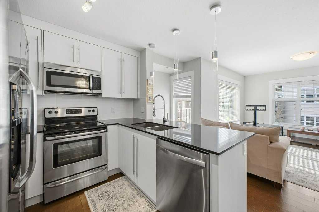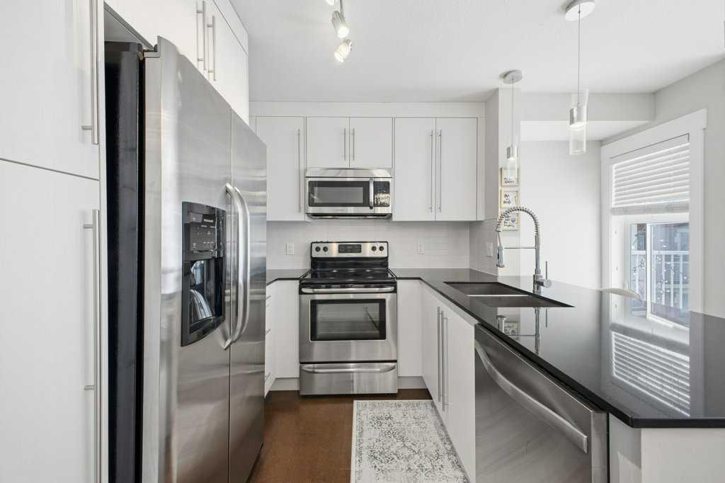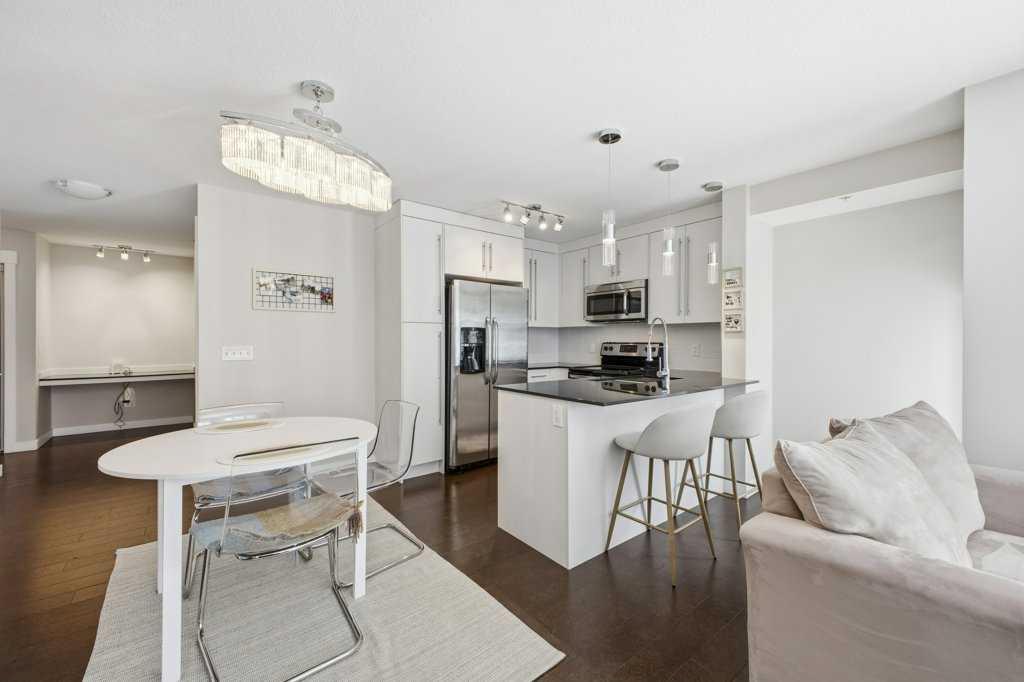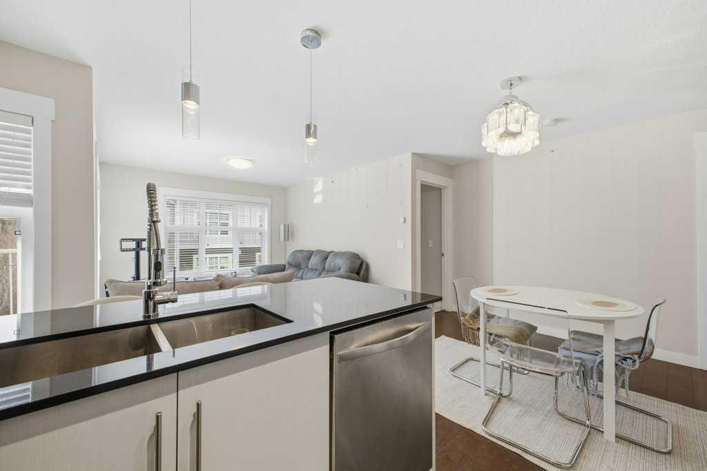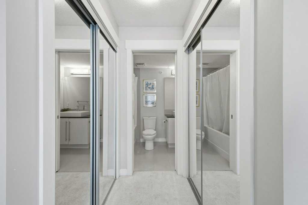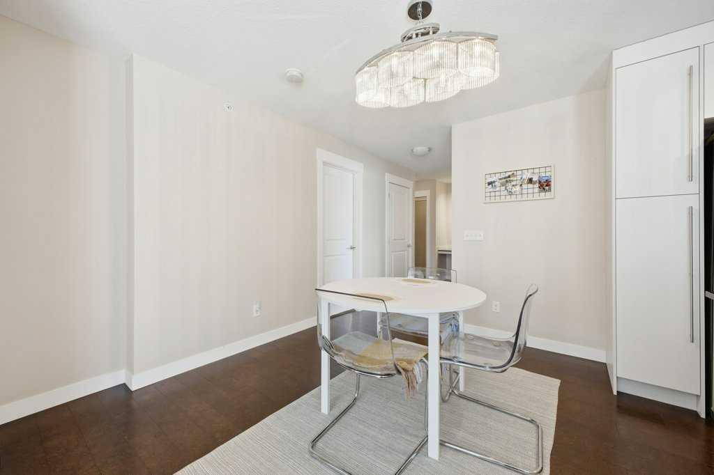 This is a top-floor corner unit and that matters. No one above you, no noise from the hallway on two sides, and windows wrapping the south, southeast, and southwest. Natural light from morning through evening. It's one of the quieter positions in the building, and one of the larger floor plans available. The living room is generous for a condo this size. There's room for a proper sofa, a coffee table, and still space to move around. The cork flooring runs through the main living areas. It's softer underfoot than hardwood and keeps the space feeling warm. This isn't a unit where you feel like you're living in a box. The corner layout gives you that extra breathing room that most condos in this price range just don't have. The kitchen sits open to the living and dining area with no walls cutting it off and no awkward transition. Upgraded appliances, a microwave hood fan above the stove, good counter space, and enough cabinetry to actually store things. The layout is practical and the flow makes sense whether you're cooking for one or having people over. There's also a built-in desk just off the kitchen area, It keeps a workspace tucked in without eating up a whole room. The dining area sits between the kitchen and the living room, big enough for a full table and chairs, with natural light coming in from multiple directions. Morning coffee here with the south sun coming through is a pretty good way to start a day. The primary bedroom comfortably fits a king bed with nightstands on both sides and still leaves you room to move. Dual closets mean storage isn't an issue. The 4-piece ensuite is off the primary and well-sized. It's your own bathroom, private to the bedroom, which matters when you have guests or a roommate using the second bath. The second bedroom is also a solid size, fits a queen easily, and works just as well as a home office or flex space if you don't need the second bedroom full time. It has direct access to the second full 4-piece bathroom in the hall. In-suite laundry is included, washer and dryer in the unit. Step out onto the south-facing balcony. You've got south and west exposure, which means afternoon and evening sun. One titled, heated underground parking stall is included. Assigned storage locker also included, separate from the unit, on the parkade level. Condo fees cover heat, water. Electricity is the only utility you're paying separately. Outside the front door, you're in Mahogany, one of the few lake communities in Calgary where the lake access is actually good. Residents get two beaches, the Beach House, tennis courts, a skating rink in winter, and over 35 km of pathways that wind through the wetlands. It's a community where people actually use the amenities. Seton is a short drive with a grocery store, restaurants, coffee shops, a Cineplex, and South Health Campus all within a few minutes. Deerfoot and Stoney Trail are both easily accessible.