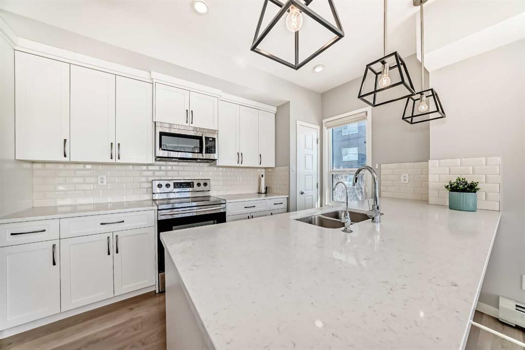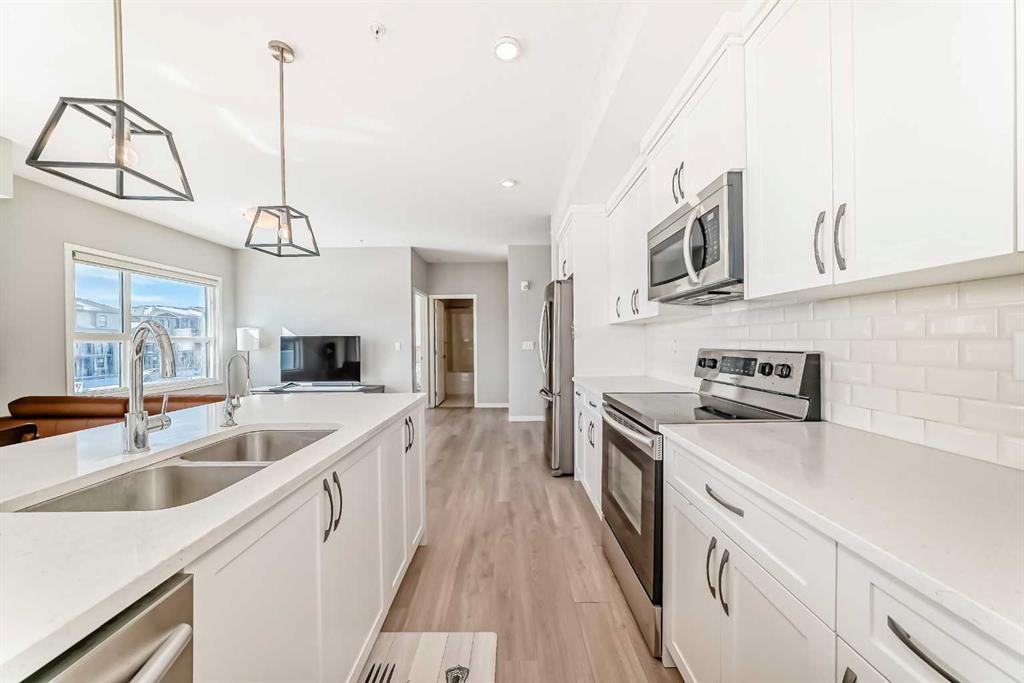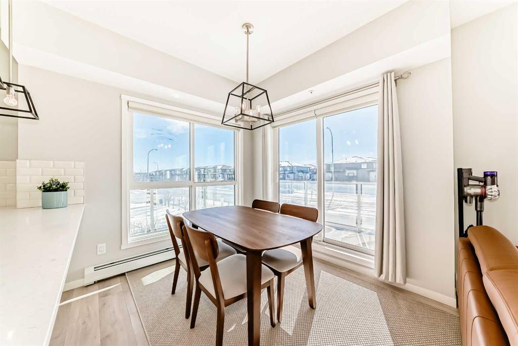 Welcome to this stunning SOUTH-FACING CORNER unit on the second floor, offering exceptional natural light from morning to evening. This modern, beautifully maintained home features a bright open-concept layout with 9’ ceilings, triple-pane windows, and durable vinyl plank flooring throughout. The stylish kitchen is the heart of the home, highlighted by a gorgeous oversized island, quartz countertops, stainless steel appliances, and a pantry, making it perfect for both everyday living and entertaining. The spacious primary bedroom includes a walk-in closet and private 4-piece ensuite, while the second bedroom and additional 4-piece bathroom provide comfortable space for guests, family, or a home office. You’ll also appreciate the convenience of in-suite laundry with additional storage. Step outside to the WRAP-AROUND balcony with a gas BBQ hookup, ideal for relaxing or hosting summer gatherings. This unit comes with TWO TITLED SIDE-BY-SIDE underground heated parking stalls (#329 & #330) located close to the elevators, plus one assigned storage locker (#120) for extra storage. The location is unbeatable—steps to the world’s largest YMCA, Calgary Public Library, VIP Cinema, and South Health Campus, with walking distance to bus stops, schools, parks, playgrounds, and extensive walking and biking pathways. Pet owners will love the nearby green space and off-leash dog park just minutes away. Plus, enjoy the future convenience and value of being just steps from the upcoming Green Line LRT. Modern design, unbeatable location, and exceptional value—this home truly has it all. Don’t miss your chance to make it yours!