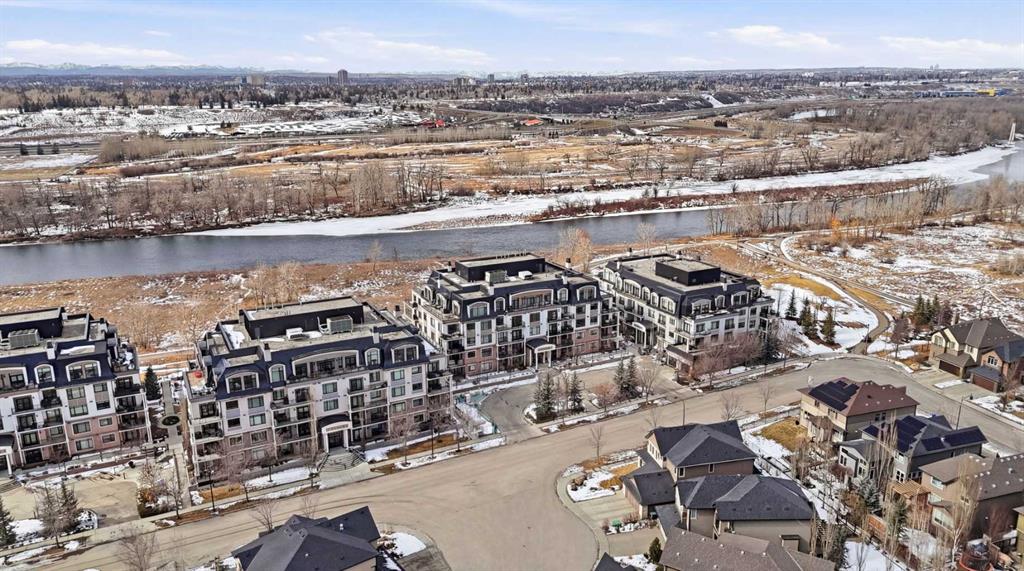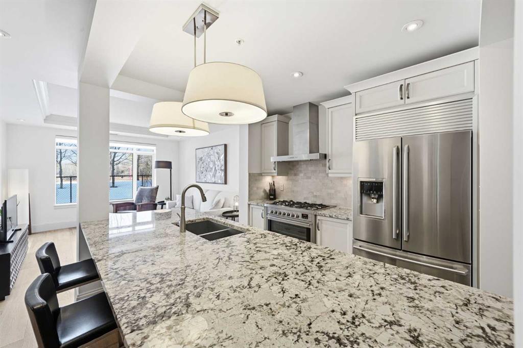 Experience a sophisticated, low-maintenance lifestyle in this luxury main-floor condo located in the Champagne building, South Calgary’s premier residence. Backing onto serene green space just steps from the Bow River, this home features 10-foot ceilings, rich engineered hardwood floors, and estate-level finishes throughout. The gourmet kitchen is a chef's dream, boasting 42-inch soft-close cabinetry, upscale stainless steel appliances, polished granite countertops, and a massive island designed for entertaining. The primary bedroom offers a private retreat with new custom Hunter Douglas blackout blinds and a lavish marble-tiled ensuite with a separate soaking tub and shower. The concrete construction of this pet-friendly building ensures exceptional quiet and durability. Modern conveniences abound, including central air conditioning, a gas BBQ line, titled storage, and a titled underground parking stall near the elevator with access to a two-stall car wash. Located in the master-planned community of Quarry Park, you are minutes away from miles of river pathways, an off-leash park, and the world-class YMCA. With condo fees that cover heat, gas, and water, this well-managed complex offers a holistic living experience that combines nature, quality, and convenience.