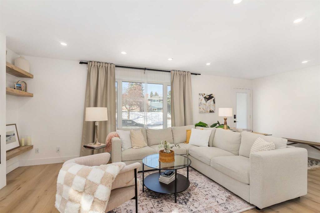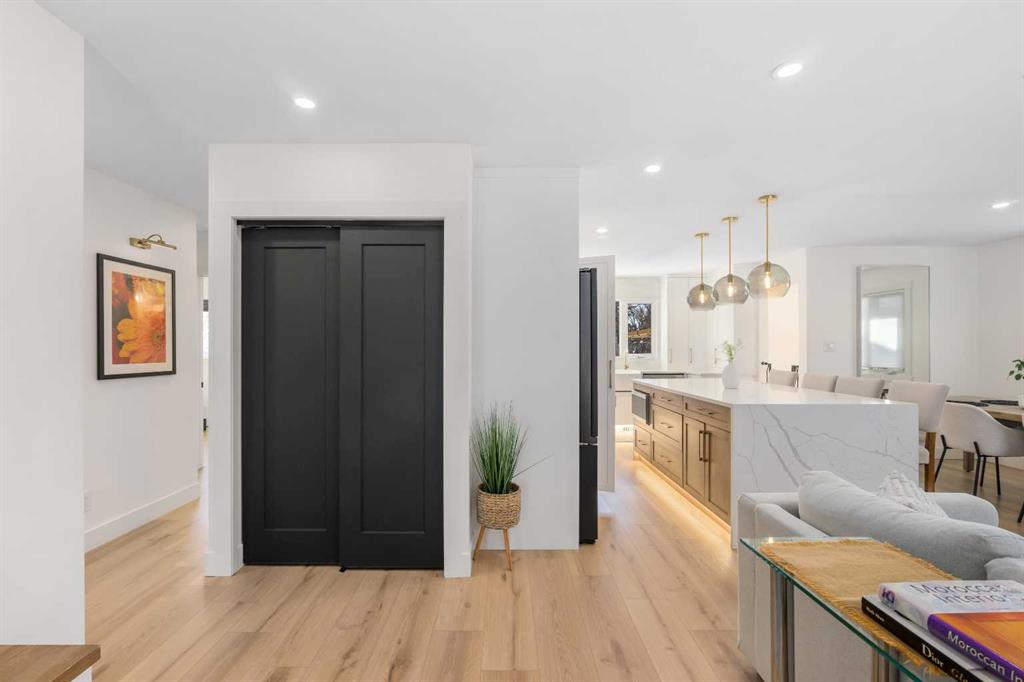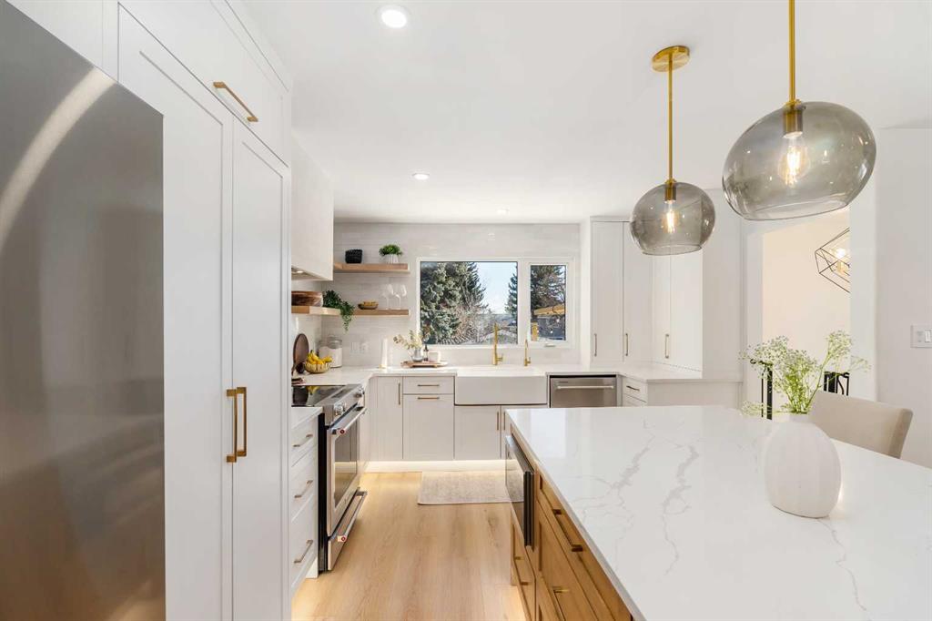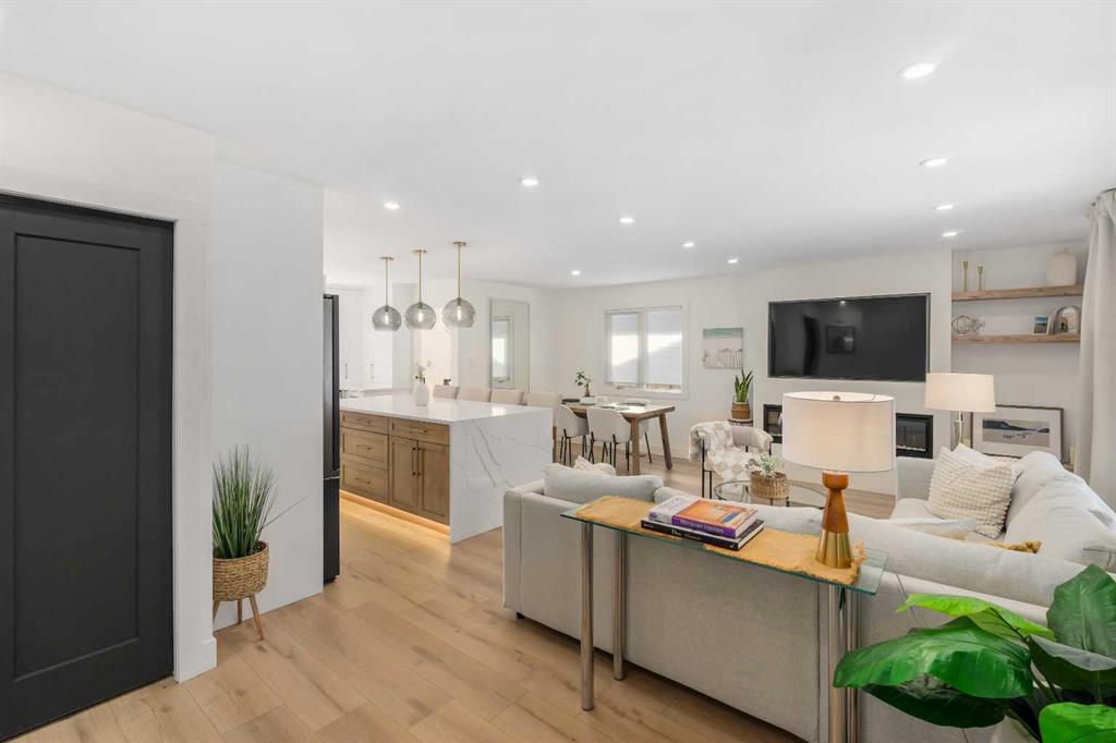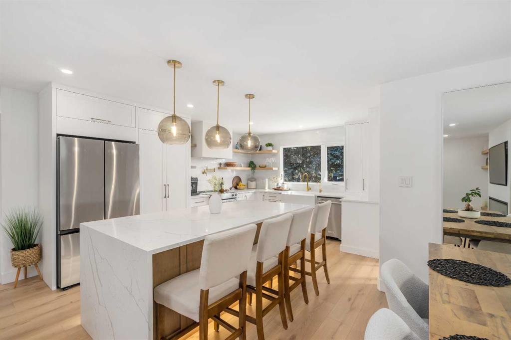 Experience a refreshing new twist on the renovated home—one that honours the original character and thoughtful space planning while introducing a modern design with carefully curated materials and a warm, inviting colour palette. Unlike the typical all-white renovations, this home offers a balanced and sophisticated aesthetic from the moment you step through the front door. The main floor welcomes you with an open and airy layout that seamlessly connects the kitchen, dining area, and living room. At the heart of the home is a beautifully designed kitchen featuring a large centre island—intentionally uninterrupted by sinks or cooktops—allowing the premium quartz surface to shine as both a functional workspace and gathering place. Natural wood grain cabinetry on the island adds warmth and contrast to the elegant off-white upper cabinets. A farmhouse sink provides both style and practicality for handling larger pots and pans, while the window above offers a peaceful view of the spacious backyard. Ample cabinetry ensures plenty of storage, with room to expand if desired. The dining area comfortably accommodates gatherings of eight and flows effortlessly into the living room, where a sleek electric fireplace creates a welcoming focal point. Above the fireplace, a perfectly framed niche offers space for artwork or a mounted television, complemented by wood shelving with integrated lighting. The living room provides a backdrop of large windows that fill the space with natural light. The main level has three bedrooms, including a primary retreat with a convenient 2-piece ensuite and walk-in closet, along with two additional bedrooms located near the stylish 4-piece bathroom. The fully developed basement expands the living space with a large family room and an impressive games and entertainment area complete with a modern wet bar that could rival any downtown lounge. A generous fourth bedroom comfortably fits a king-sized bed with nightstands, and a contemporary 3-piece bathroom completes this level. Outside, the large backyard offers mature trees and a welcoming outdoor space featuring a concrete patio and Rundle rock firepit area—perfect for relaxing evenings or entertaining. Additional features include Central A/C, and an extra-wide double detached garage adds convenience and functionality. Situated in the established community of Canyon Meadows, this home offers excellent access to nearby schools including Canyon Meadows Elementary, St. Catherine Elementary, Robert Warren School, and Dr. E.P. Scarlett High School. Residents enjoy exceptional amenities such as Fish Creek Provincial Park, Canyon Meadows Golf & Country Club, the Canyon Meadows Aquatic & Fitness Centre, Trico Centre for Family Wellness, Southcentre Mall, and Willow Park Village. Commuting is effortless with convenient access to Macleod Trail, Anderson Road, and Stoney Trail, along with a short walk to the Canyon Meadows LRT Station.