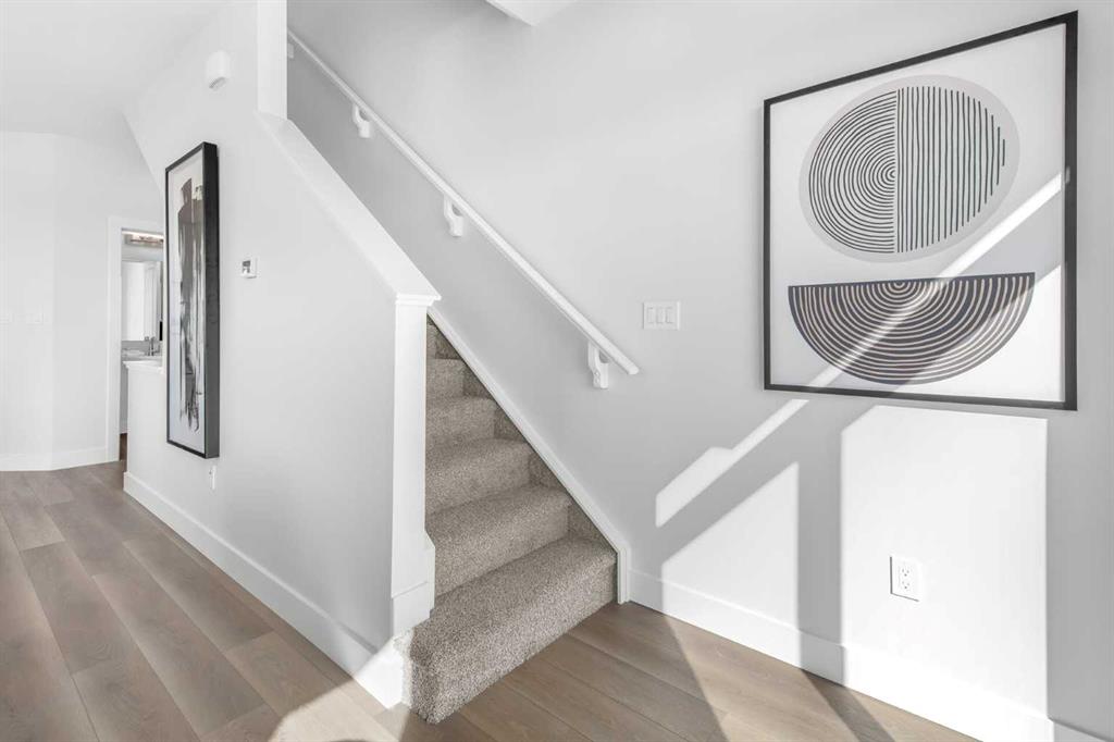 The stunning ‘Holiday’ model by Brookfield Residential is now available in the heart of Rockland Park! This brand-new townhome is thoughtfully designed and extensively upgraded, offering 3 bedrooms, 2.5 bathrooms, a ground-floor den, and a private double attached garage. The open-concept main living area features a timeless kitchen with full-height cabinetry, quartz countertops, a built-in hood fan and microwave, and a stainless-steel appliance package. The extended island provides additional seating, making it a natural gathering place. The kitchen flows seamlessly into the dining and living areas, which are filled with natural light thanks to a wall of windows. A private balcony off the living room offers the perfect spot to enjoy the summer sun. A full laundry room with extra storage and a 2-piece powder room complete this level. Upstairs, the spacious ~11’ x 12’ primary suite includes a walk-in closet and a private ensuite. Two additional bedrooms and a full bathroom complete the upper floor. On the lower level, a versatile den off the entryway provides the perfect space for a home office or flex area, while the private double attached garage keeps your vehicles and valuables safe year-round. This home has been upgraded throughout, including central A/C rough-in, BBQ gas line, pendant lighting over the island, 42" upper cabinets, and a full interior selections package. The property is protected by both a full builder warranty and Alberta New Home Warranty, offering peace of mind in one of Calgary’s most sought-after new communities, with an unbelievable homeowner’s association, Rockland Park. If you’re looking for a stylish, low-maintenance townhome with exceptional design and craftsmanship—this is the one!